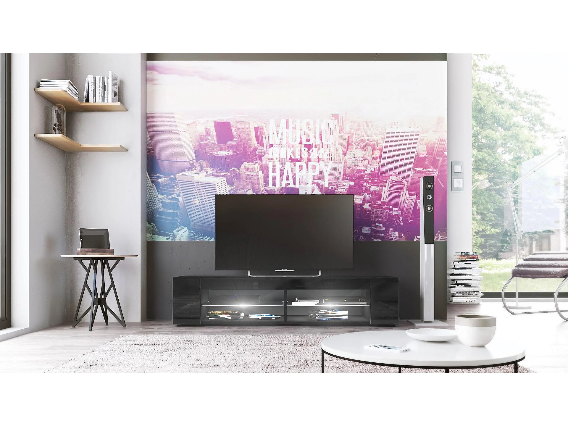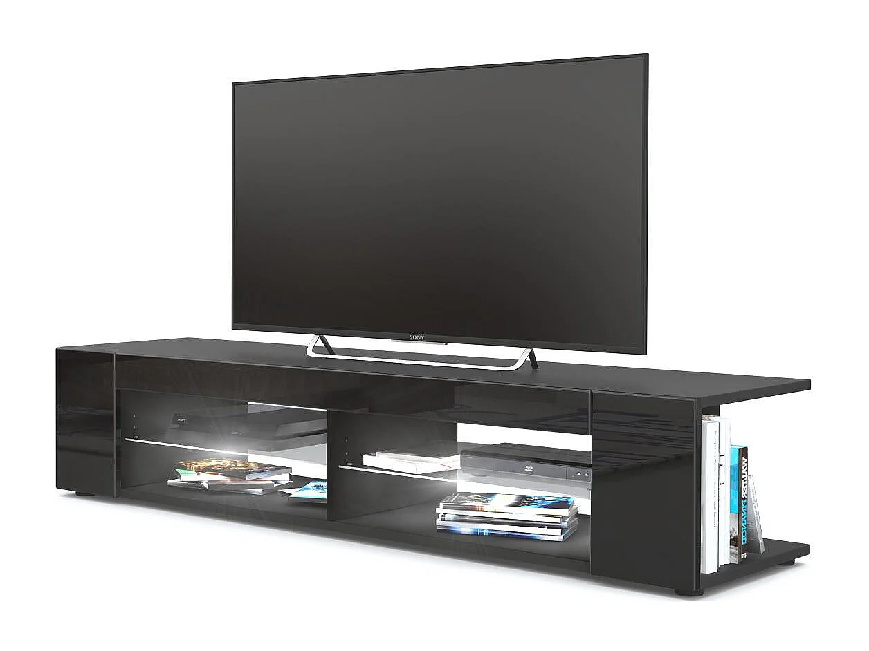 Buffet bas Movie, Meuble TV avec 4 compartiments ouverts et placages décoratifs, Noir mat/Noir haute brillance, éclairage LED blanc inclus (134 x 29 x 39 cm)