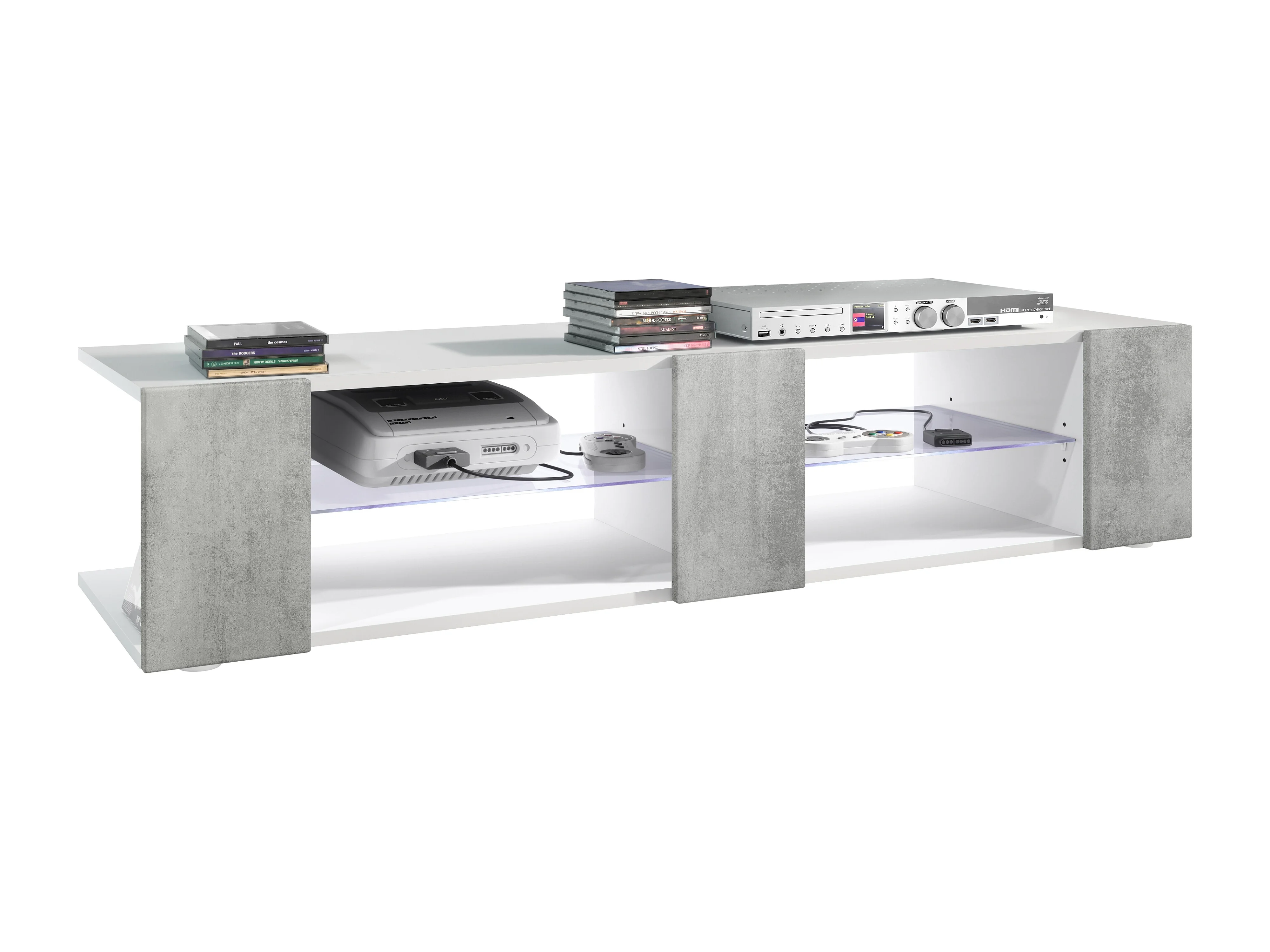 Buffet bas Movie V2, Meuble TV avec 6 compartiments ouverts et placages décoratifs, Blanc mat/Aspect Béton Oxyde, éclairage LED blanc inclus (134x29x39 cm)