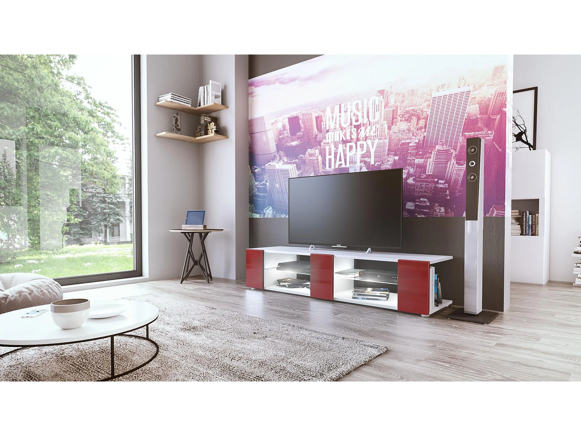 Buffet bas Movie V2, Meuble TV avec 6 compartiments ouverts et placages décoratifs, Blanc mat/Bordeaux brillant, éclairage LED blanc inclus (134 x 29 x 39 cm)