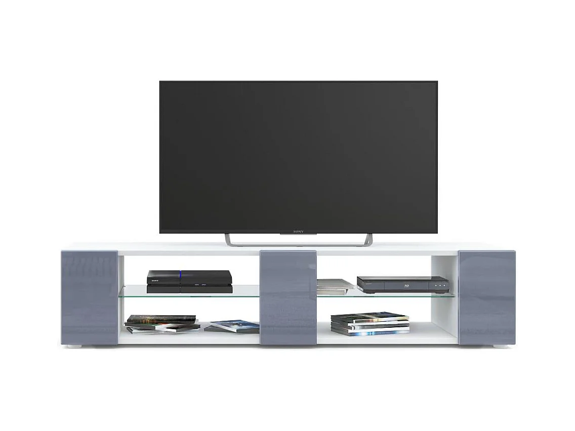 Buffet bas Mogan, Meuble TV avec 2 portes, 1 clapet et 1 compartiment ouvert, Blanc mat/Gris haute brillance (181 x 39 x 35 cm)