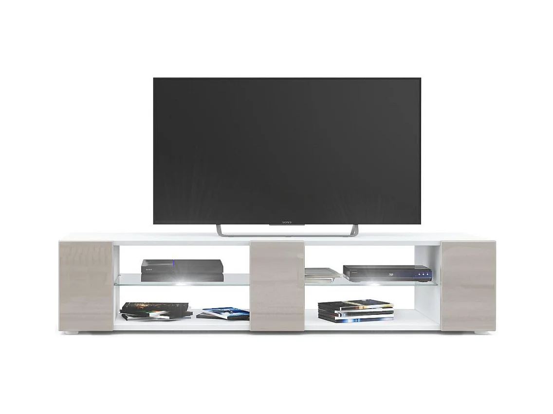 Buffet bas Movie V2, Meuble TV avec 6 compartiments ouverts et placages décoratifs, Blanc mat/Gris sable brillant, éclairage LED blanc inclus (134x29x39 cm)