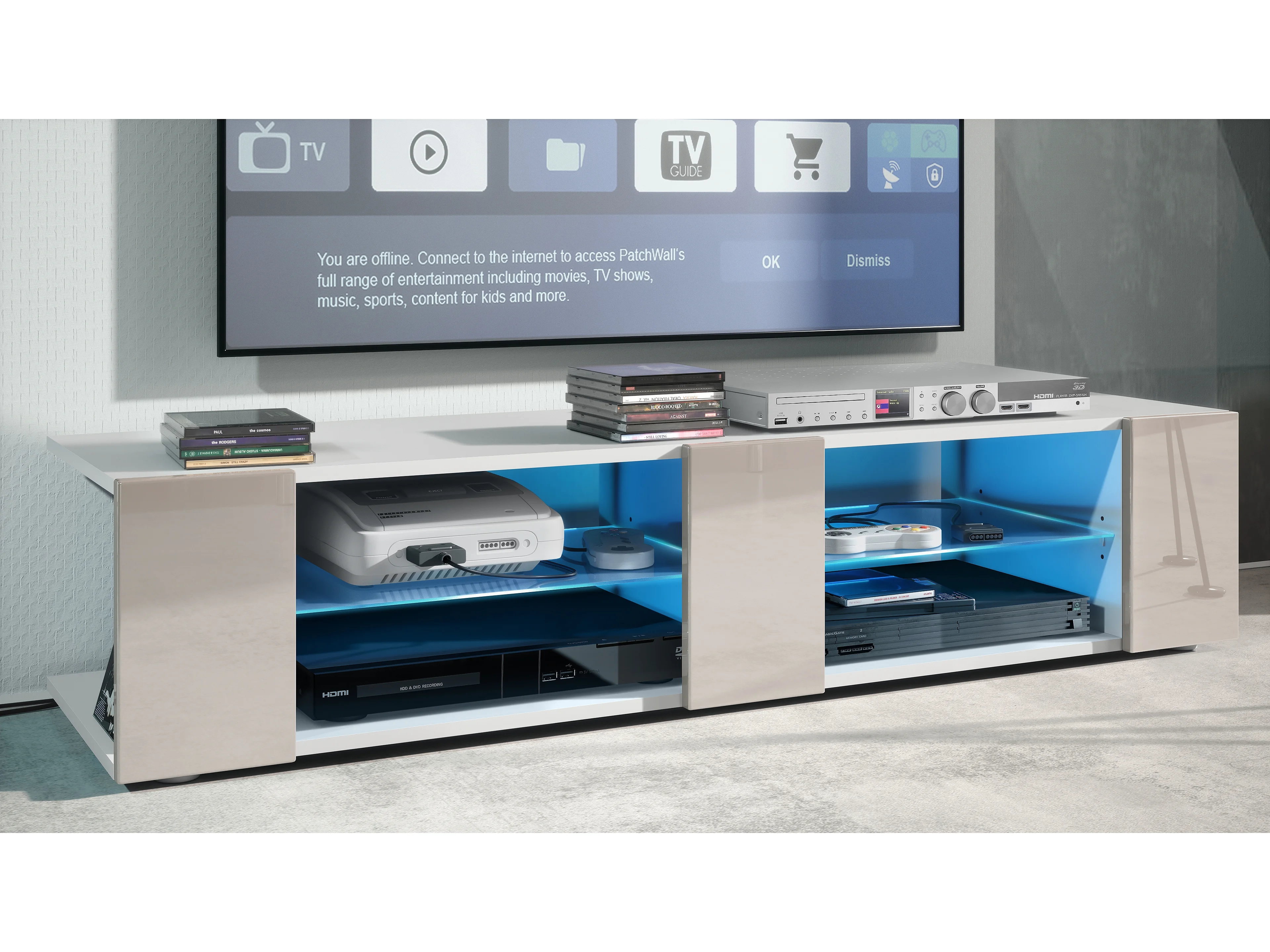 Buffet bas Movie V2, Meuble TV avec 6 compartiments ouverts et placages décoratifs, Blanc mat/Gris sable brillant, éclairage LED bleu inclus (134x29x39 cm)