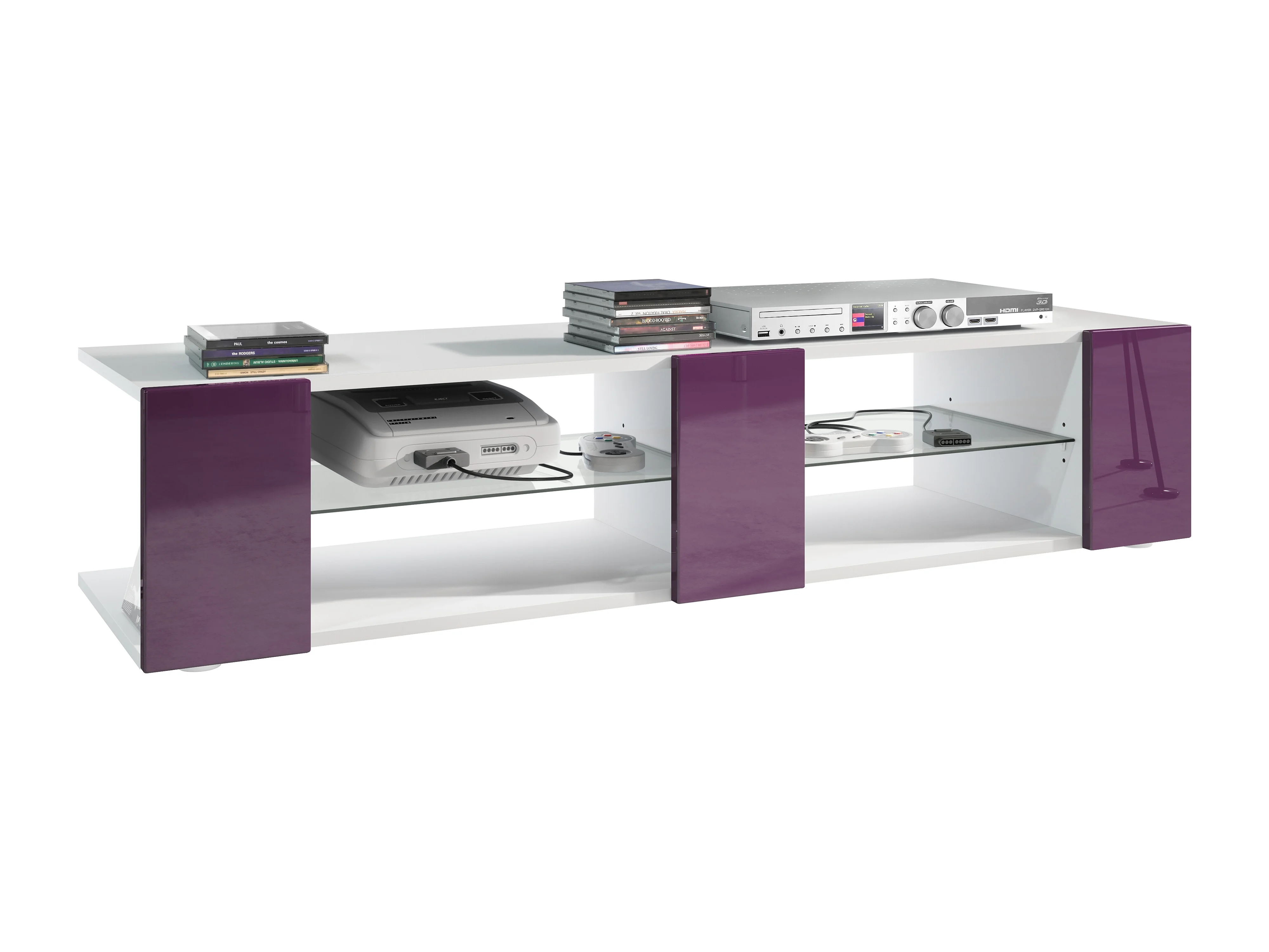 Meuble TV Armoire Metro, Corps en Blanc haute brillance / Façades en Blanc haute brillance avec une insertion en Mûre haute brillance