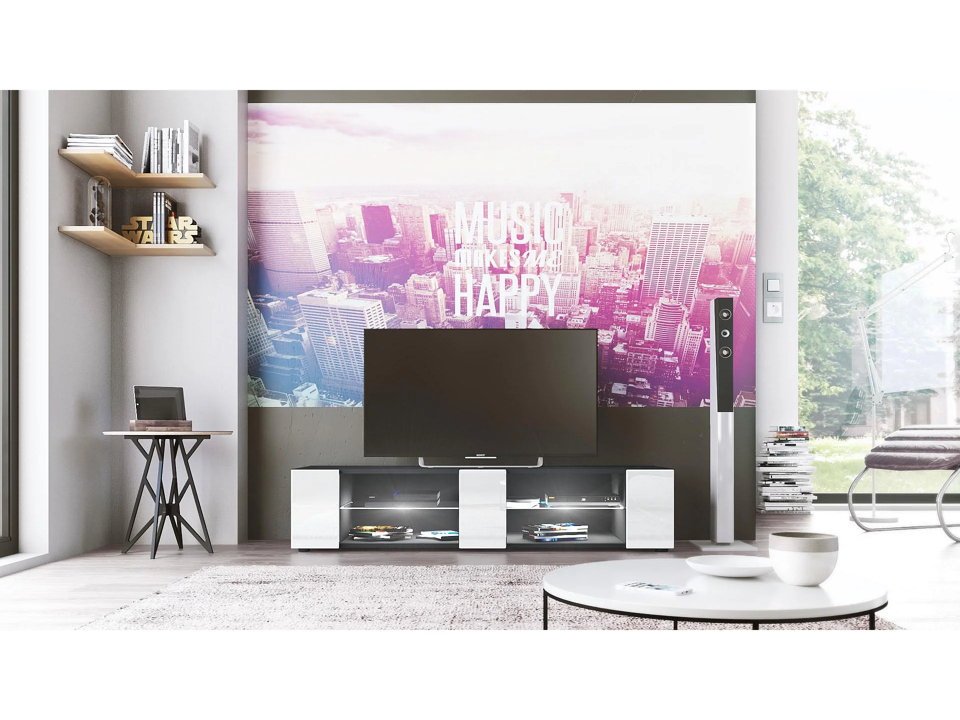 Buffet bas Movie V2, Meuble TV avec 6 compartiments ouverts et placages décoratifs, Noir mat/Blanc brillant, éclairage LED blanc inclus (134 x 29 x 39 cm)