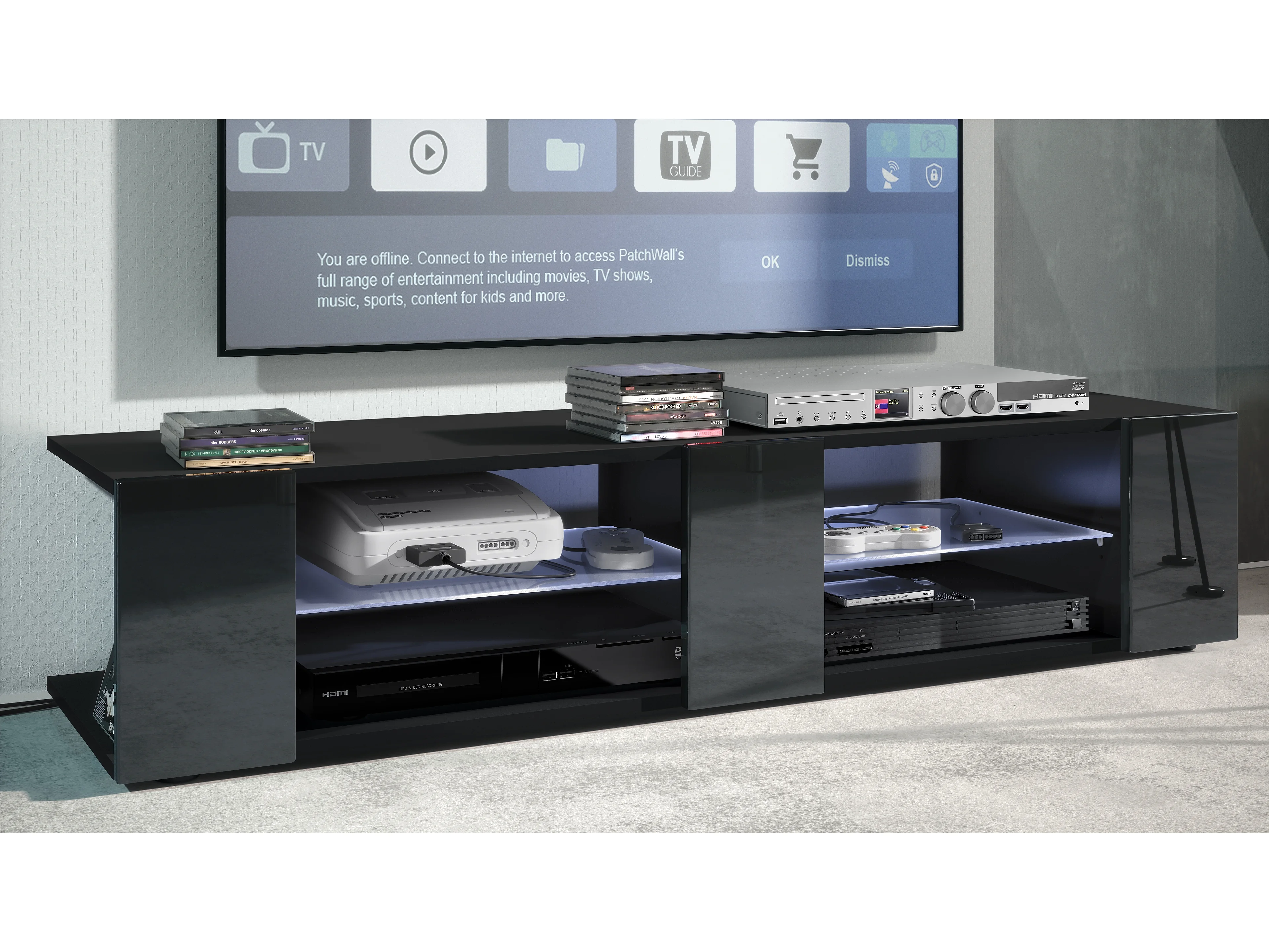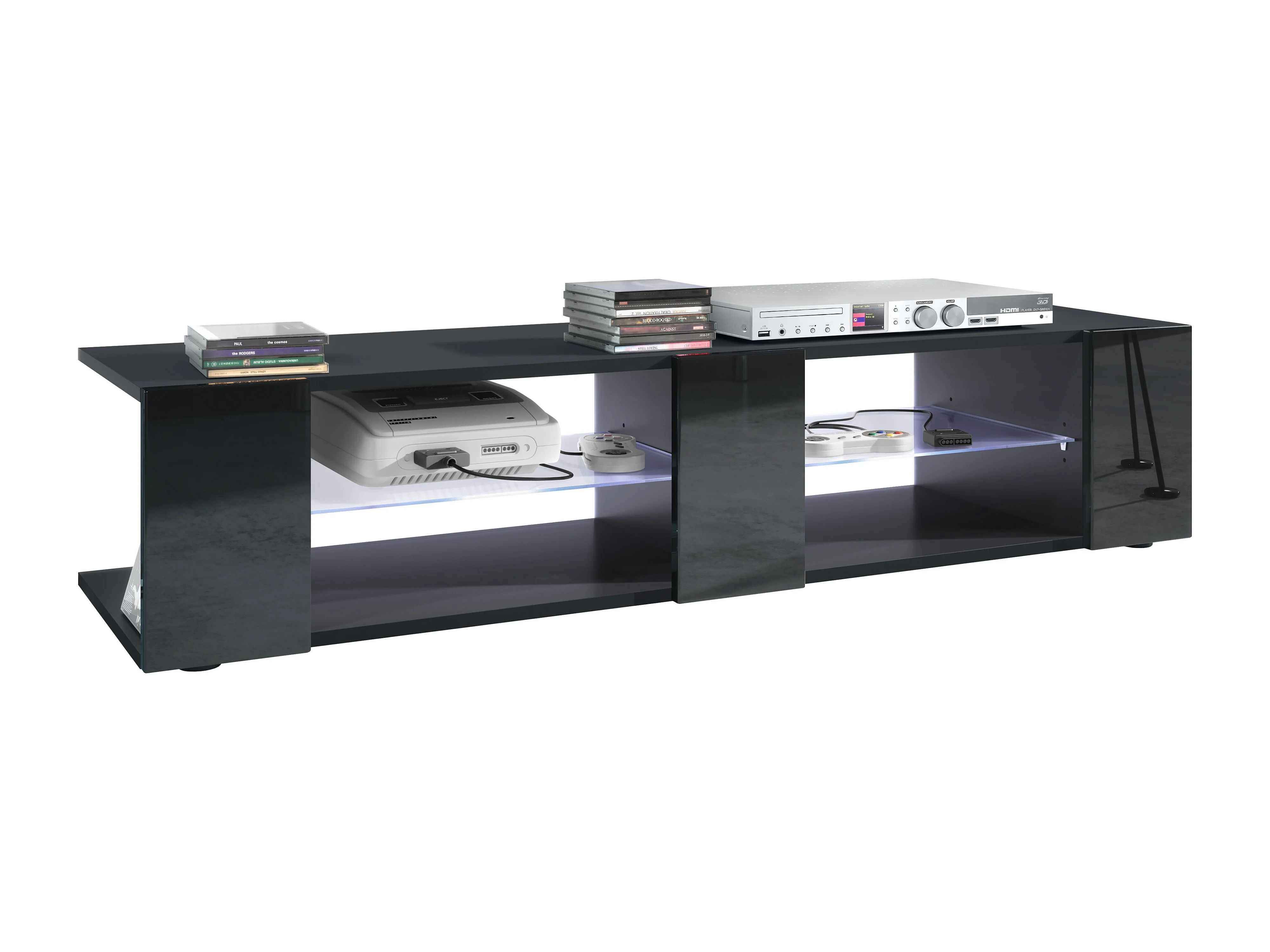 Buffet bas Movie V2, Meuble TV avec 6 compartiments ouverts et placages décoratifs, Noir mat/Noir brillant, éclairage LED blanc inclus (134 x 29 x 39 cm)