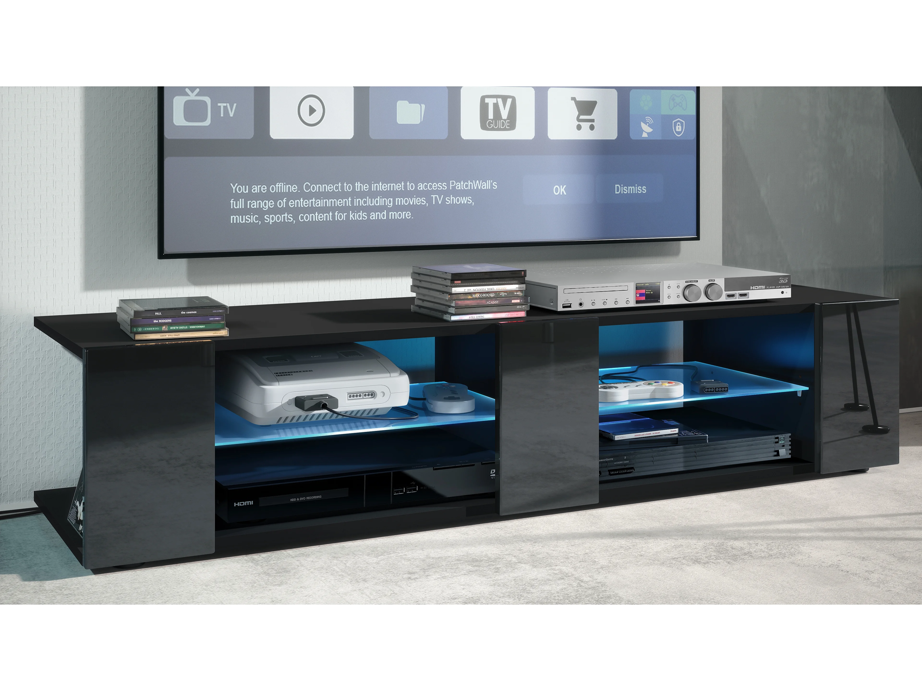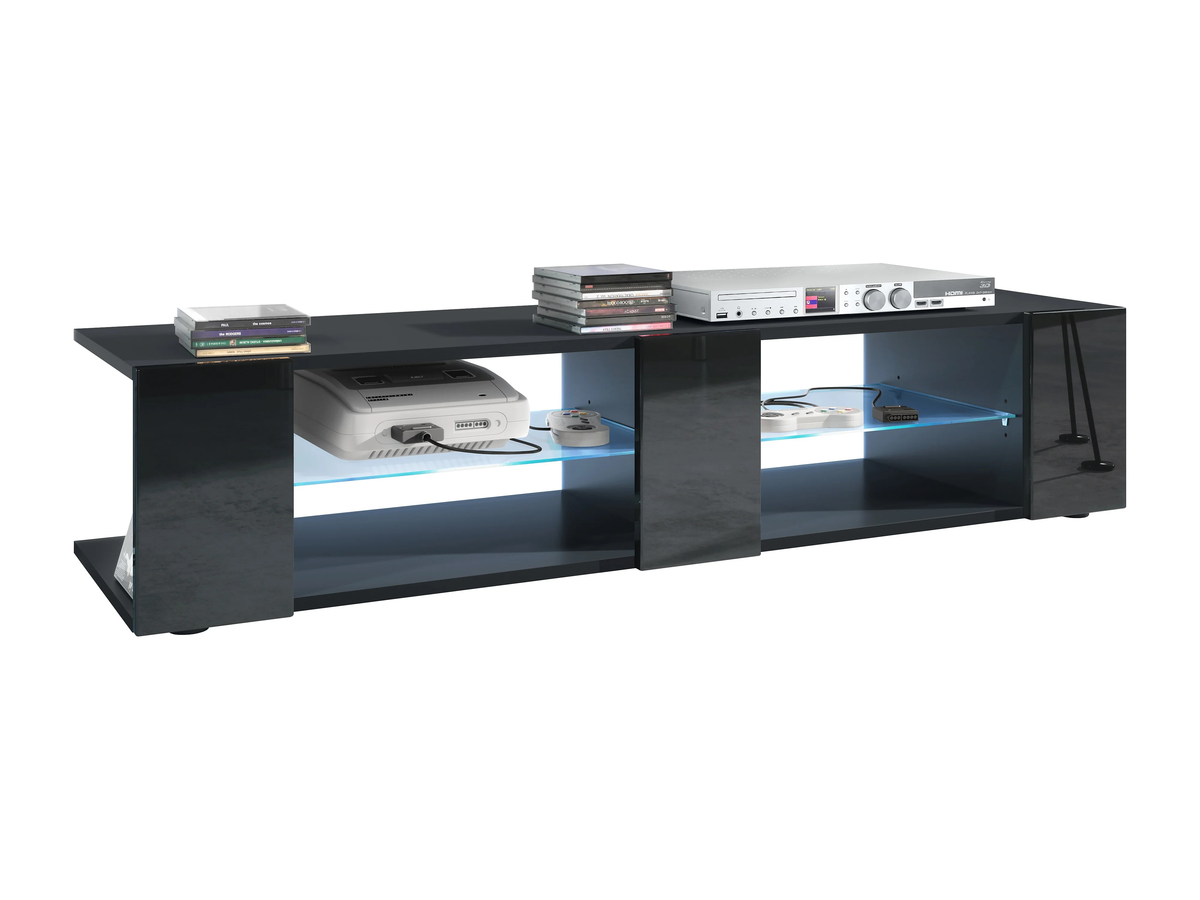Buffet bas Movie V2, Meuble TV avec 6 compartiments ouverts et placages décoratifs, Noir mat/Noir brillant, éclairage LED bleu inclus (134 x 29 x 39 cm)