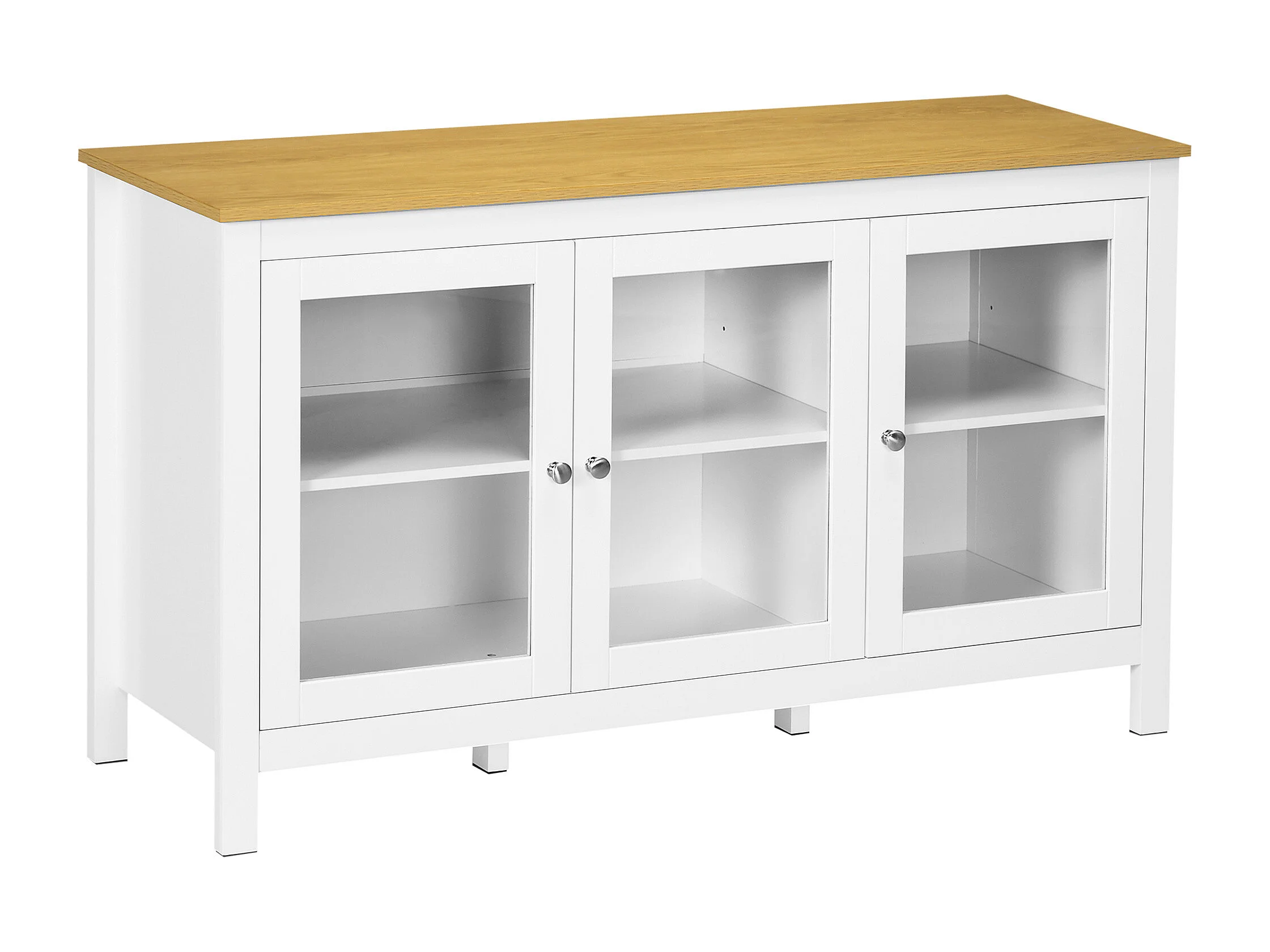 Buffet bas style classique chic - 3 portes vitrine verre, 2 étagères réglables - verre MDF panneaux blanc aspect bois clair