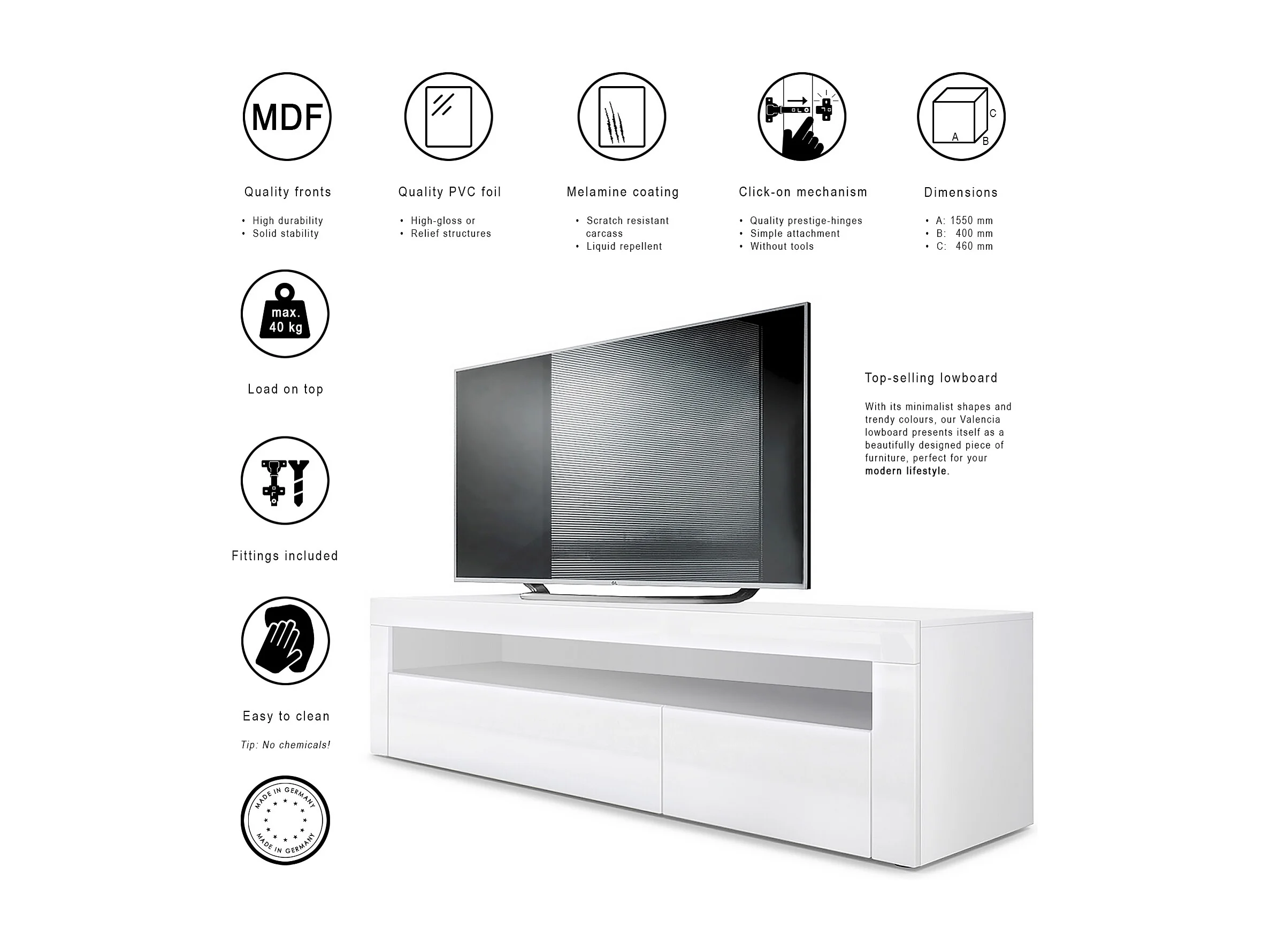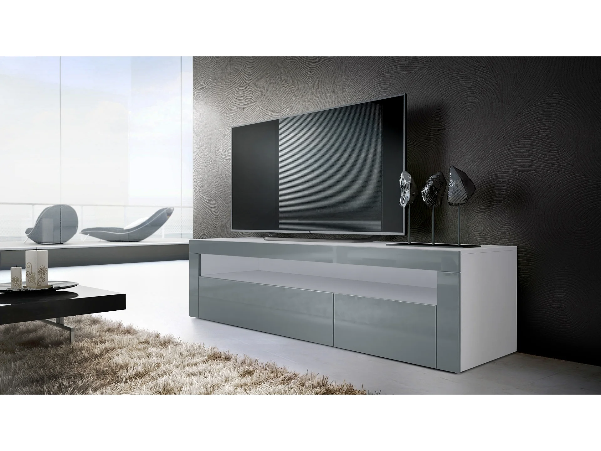 Buffet bas Valencia, Meuble TV avec 1 compartiment ouvert et 2 clapets, Blanc mat/gris haute brillance/gris haute brillance (155 x 46 x 40 cm)