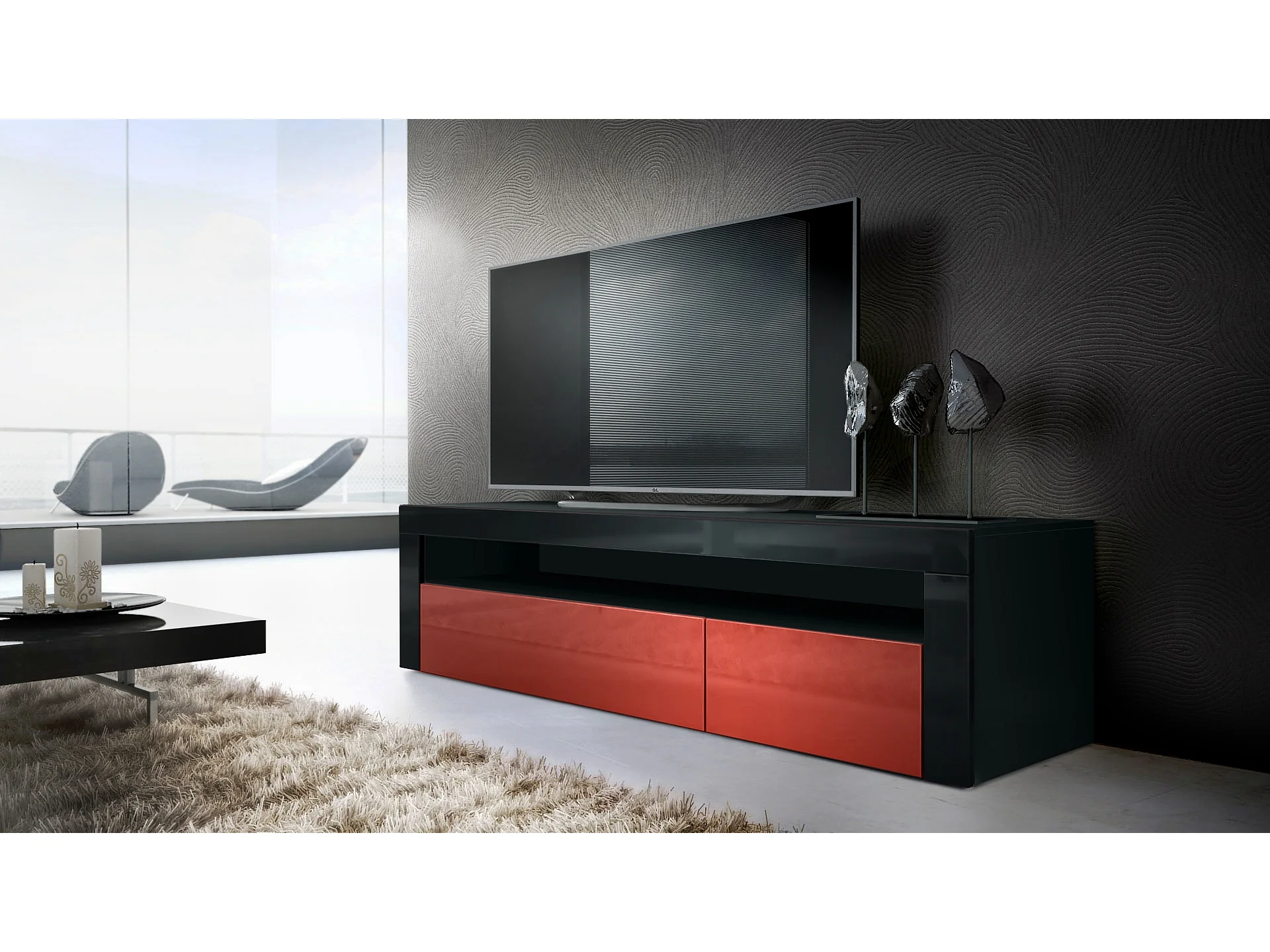 Buffet bas Valencia, Meuble TV avec 1 compartiment ouvert et 2 clapets, Noir mat/bordeaux haute brillance/noir haute brillance (155 x 46 x 40 cm)