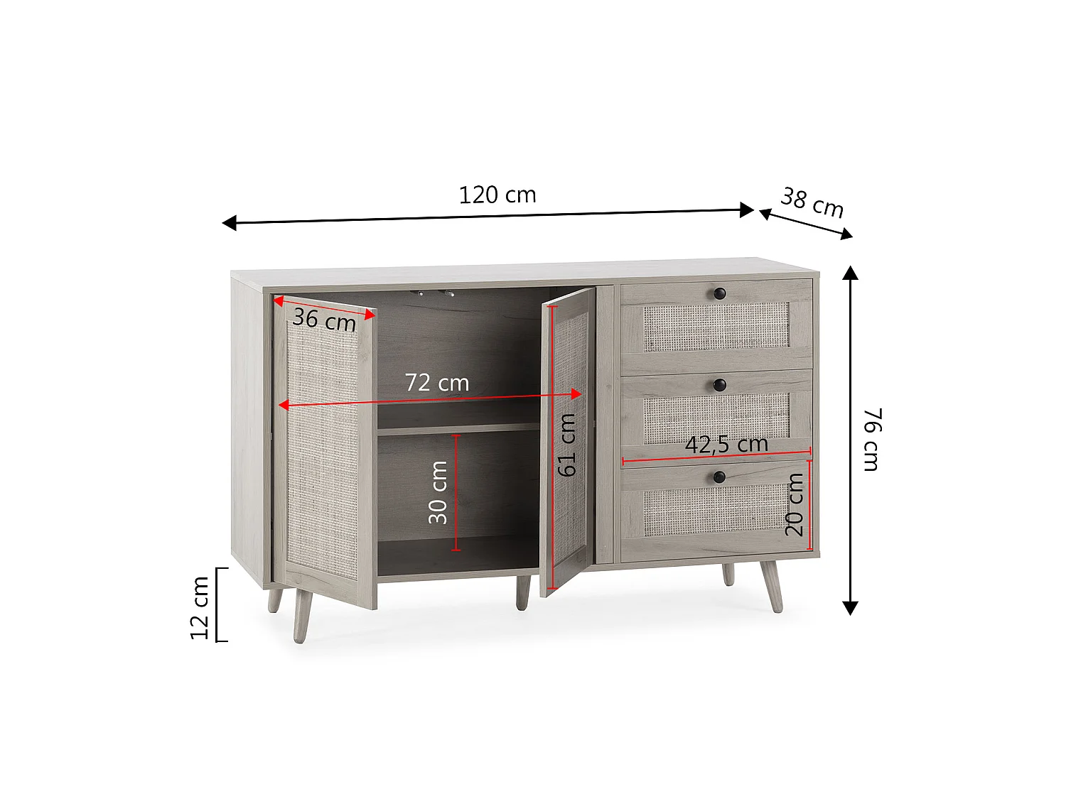 Buffet Bella 3 tiroirs et 2 portes en chêne, 120 cm