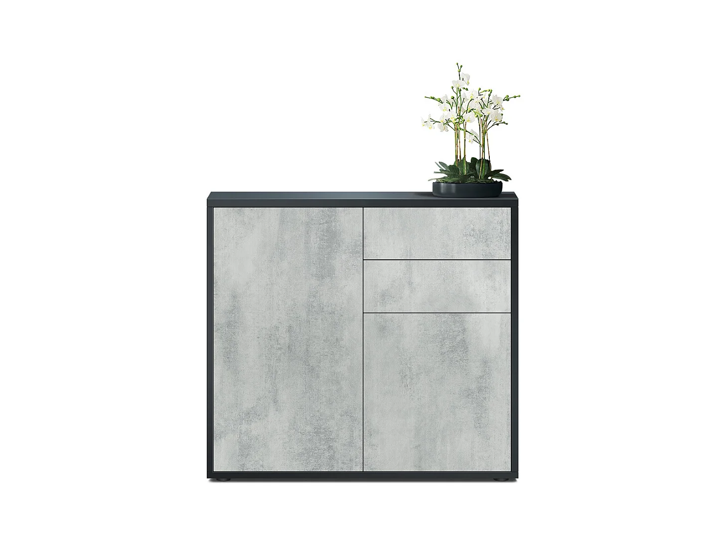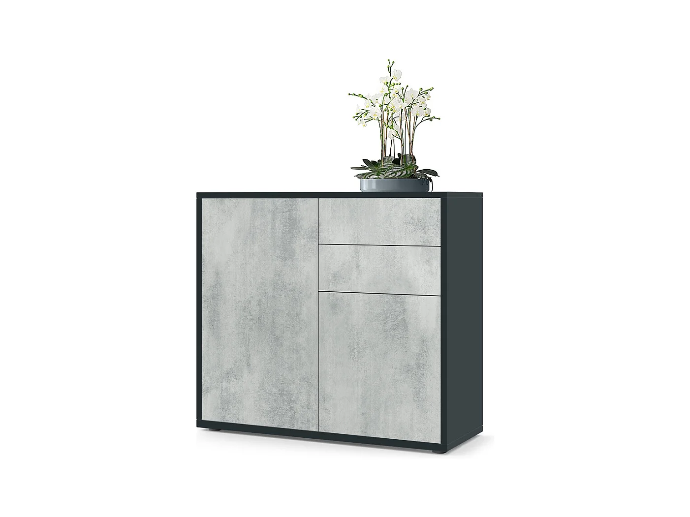 Buffet Ben, Commode avec 2 portes et 2 tiroirs, Noir mat/Aspect Béton Oxyde (79 x 74 x 36 cm)