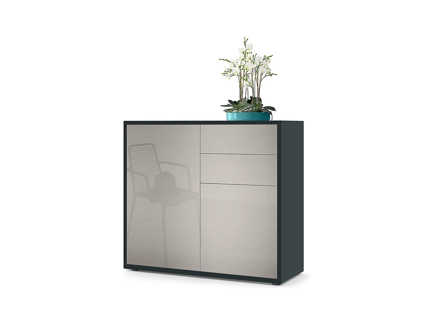 Buffet Ben, Commode avec 2 portes et 2 tiroirs, Noir mat/Gris sable haute brillance (79 x 74 x 36 cm)