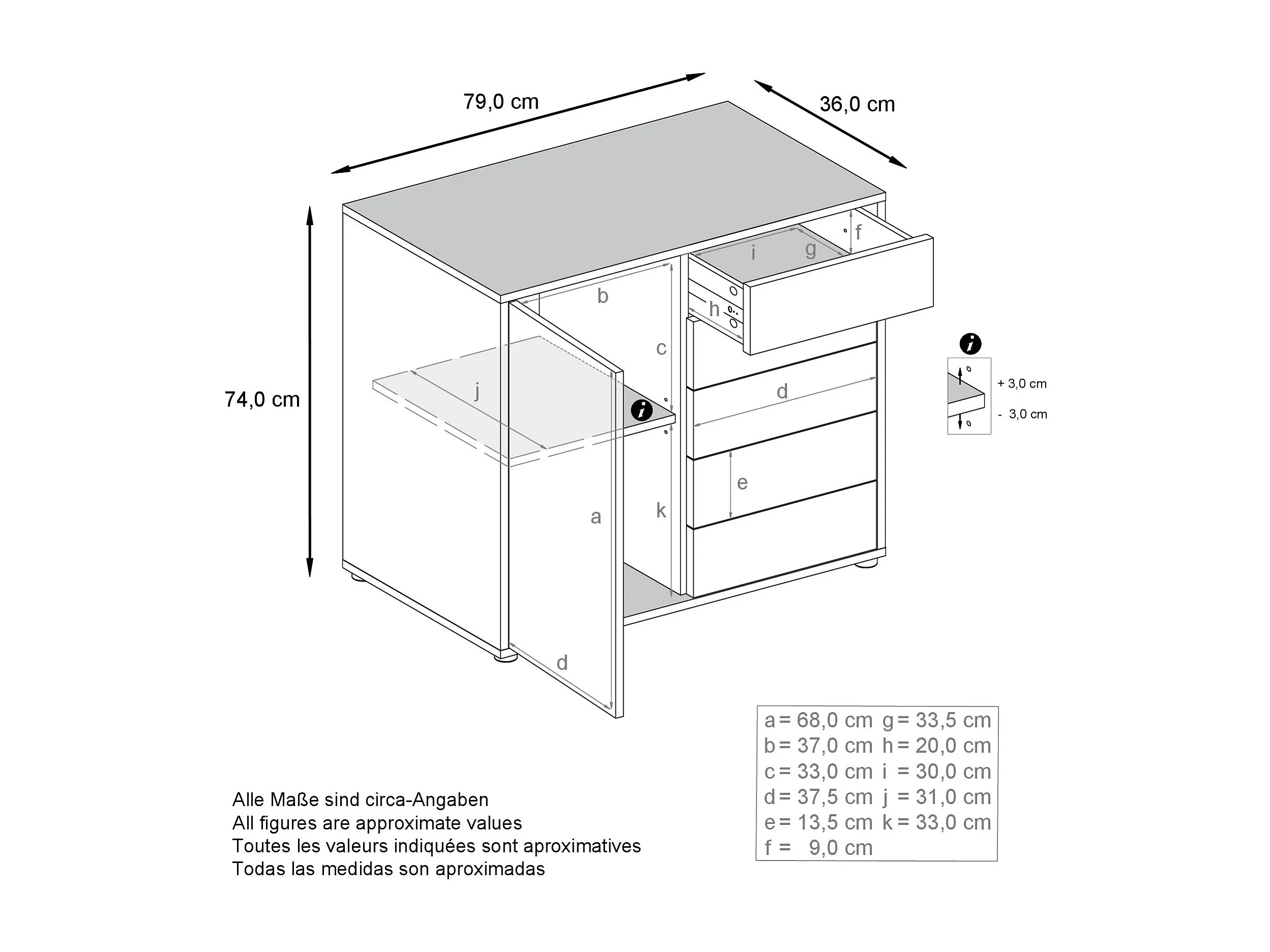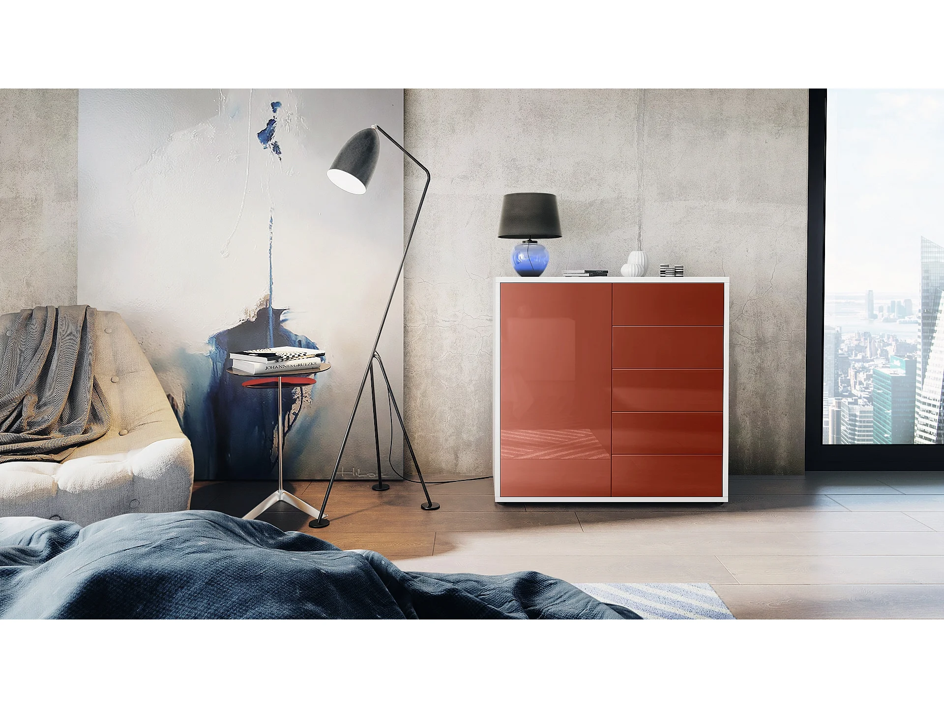 Buffet Ben V2, Commode avec 1 portes et 5 tiroirs, Blanc mat/Bordeaux haute brillance (79 x 74 x 36 cm)