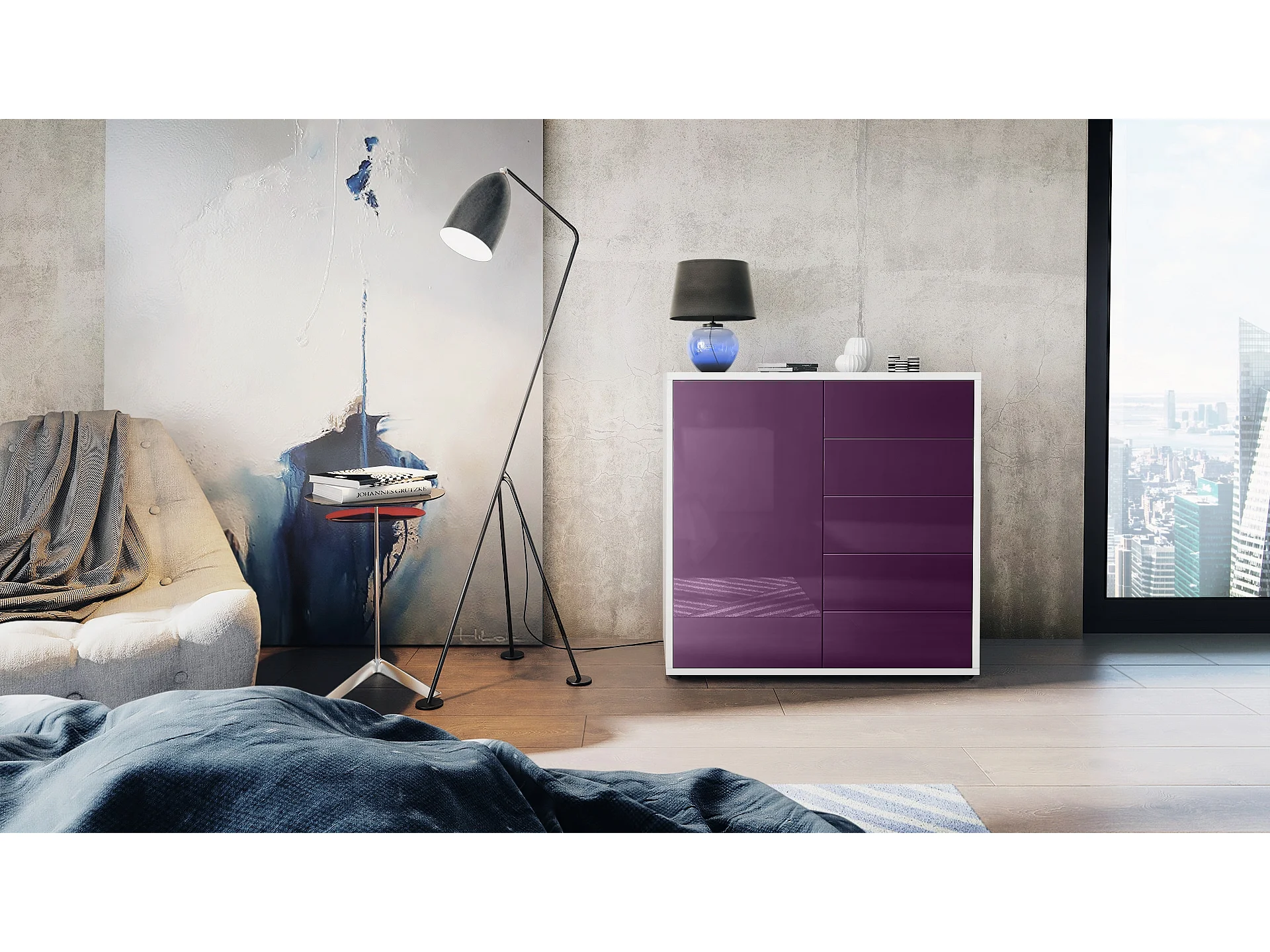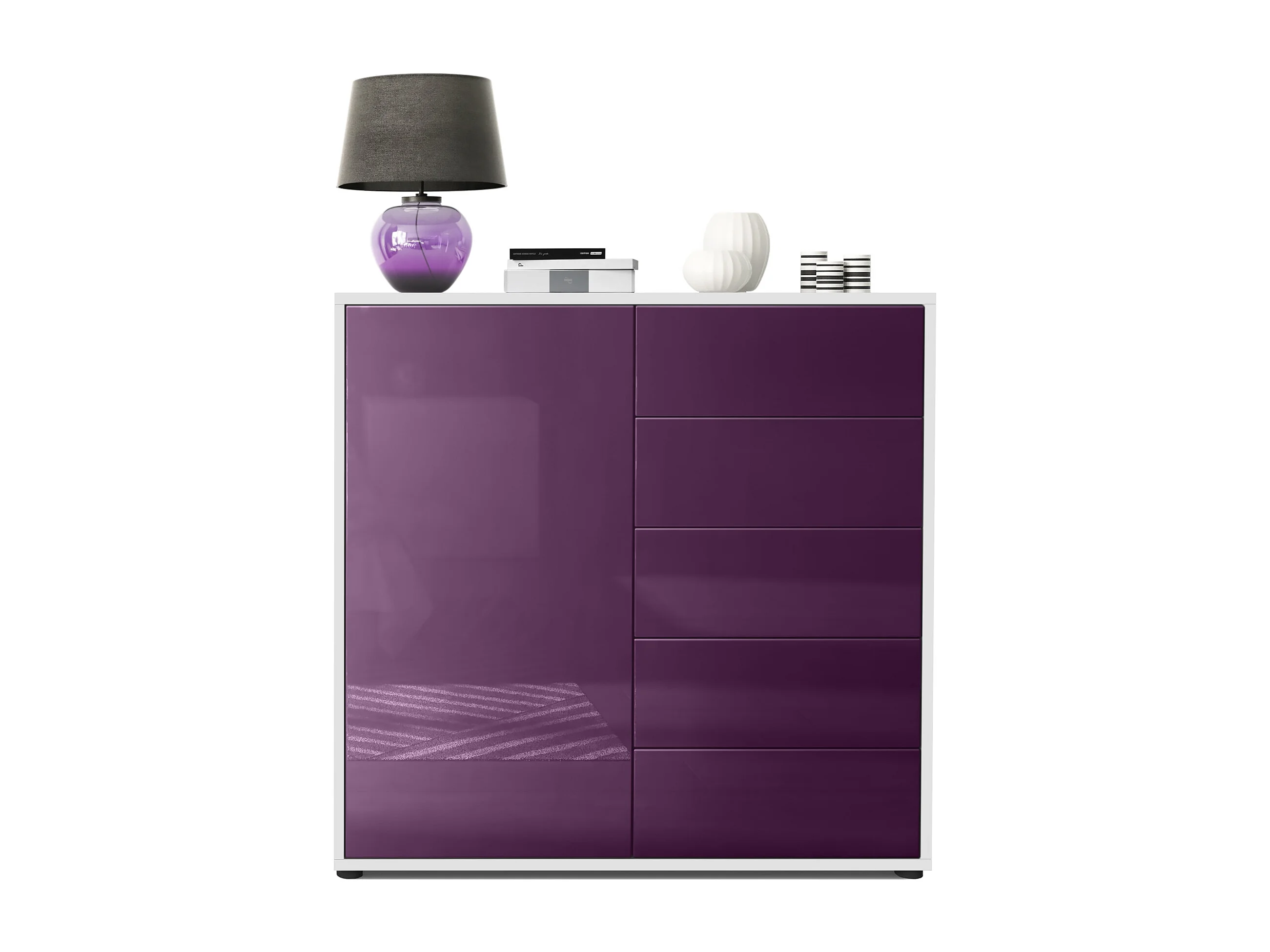 Buffet Ben V2, Commode avec 1 portes et 5 tiroirs, Blanc mat/Mûre haute brillance (79 x 74 x 36 cm)