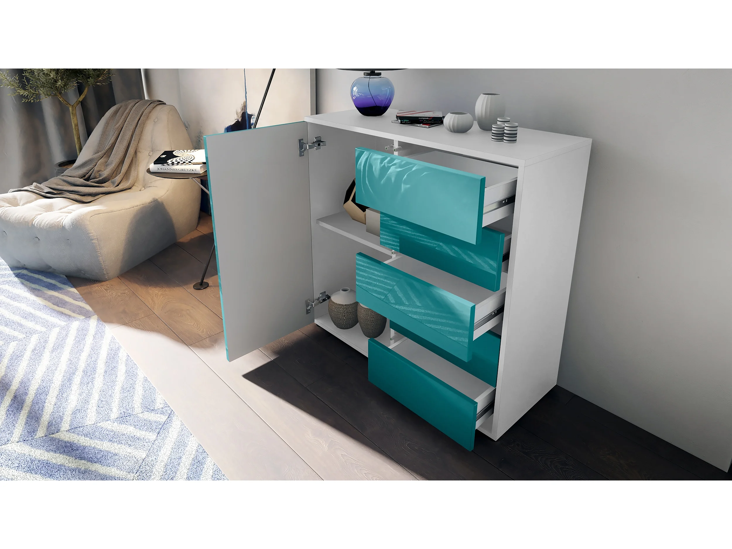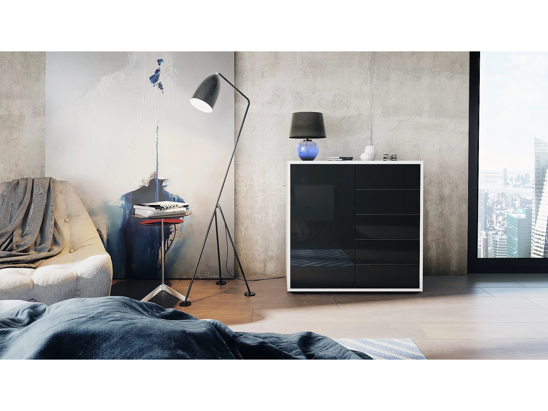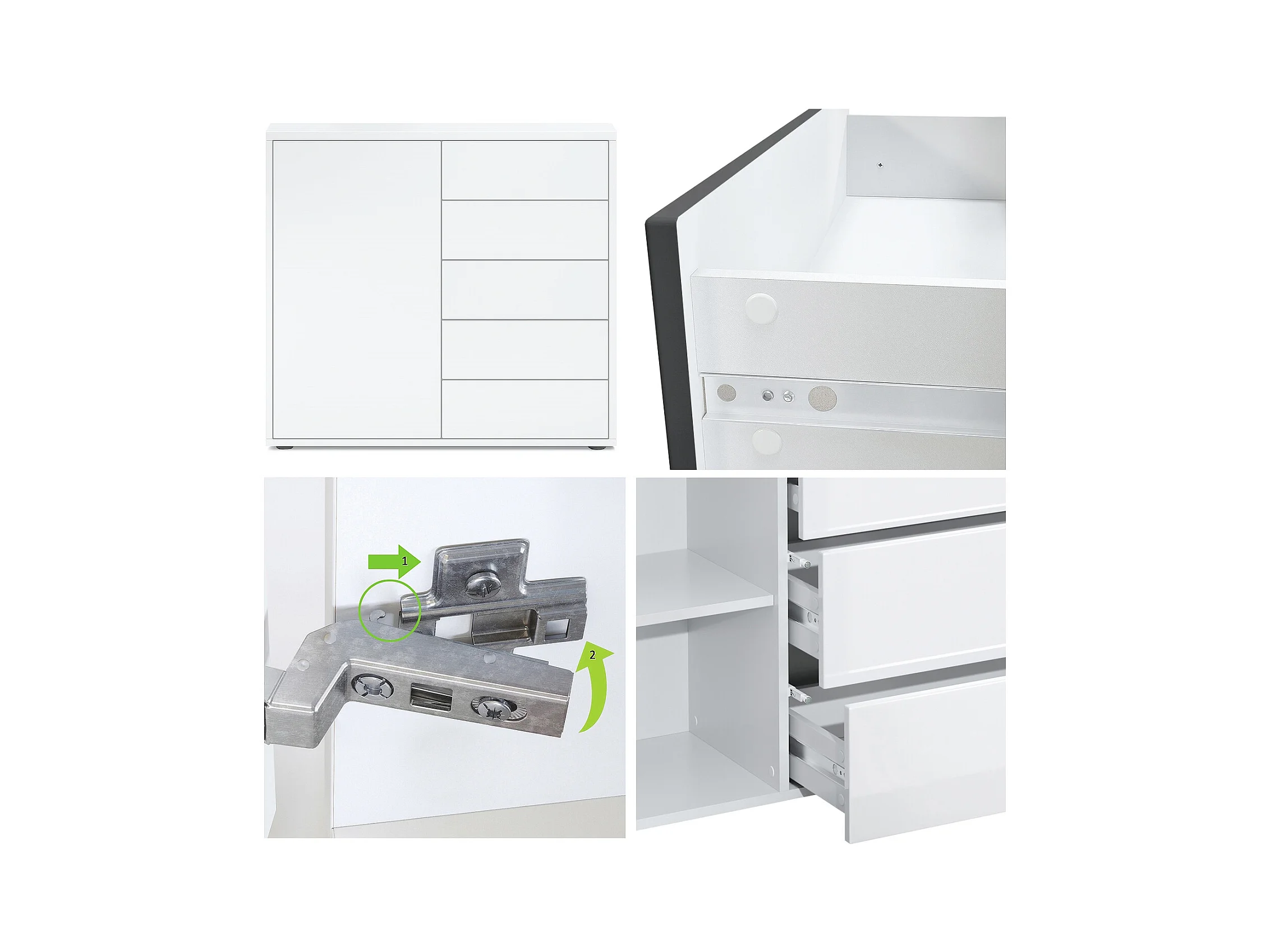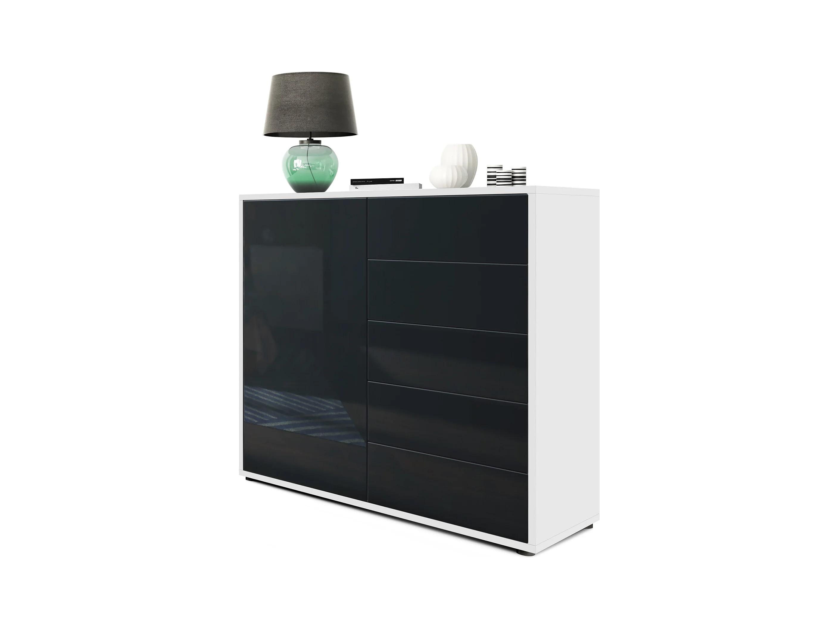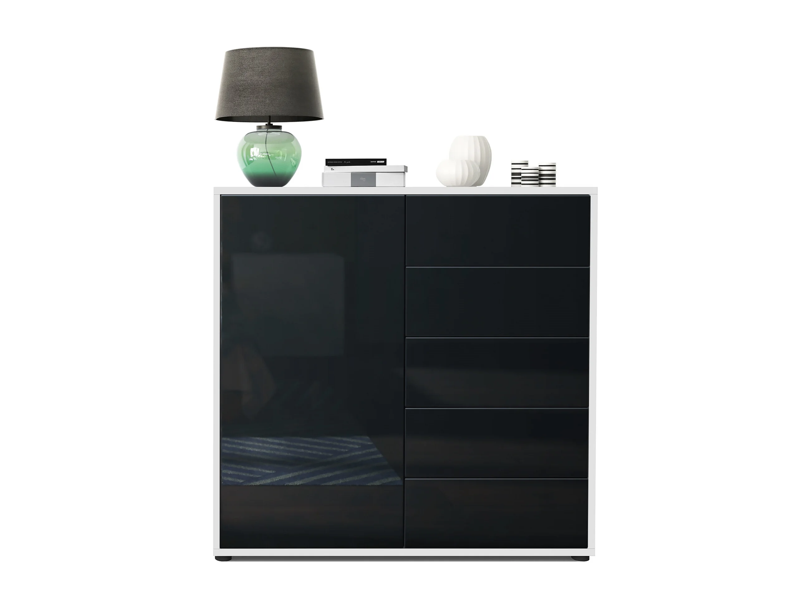 Buffet Ben V2, Commode avec 1 portes et 5 tiroirs, Blanc mat/Noir haute brillance (79 x 74 x 36 cm)