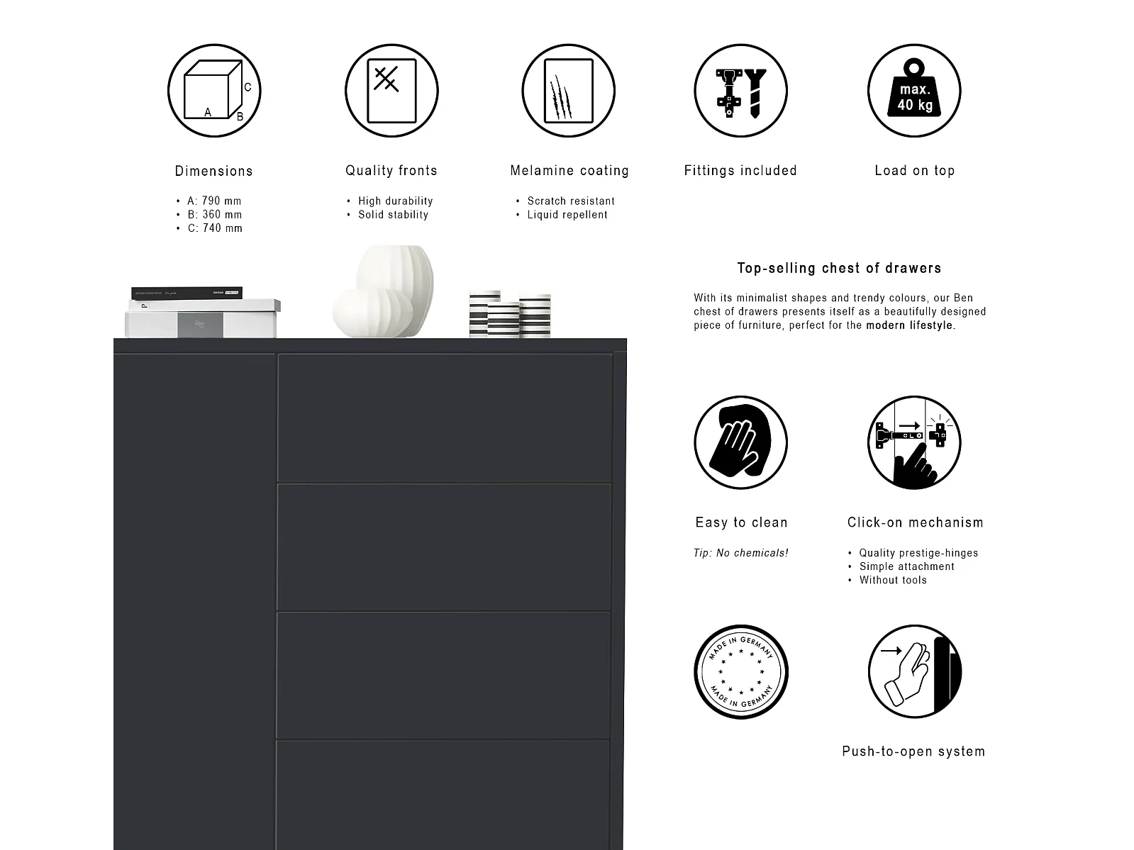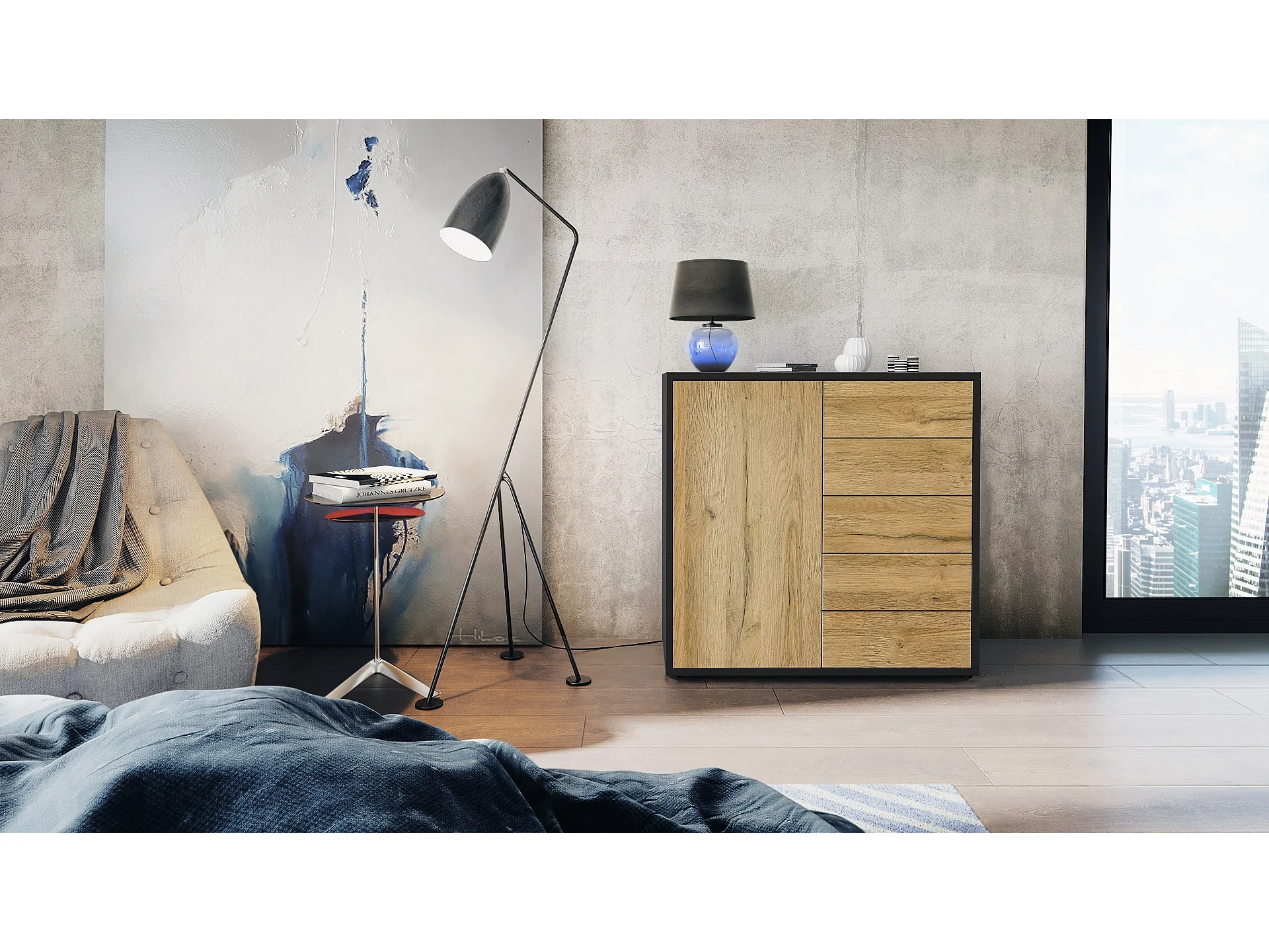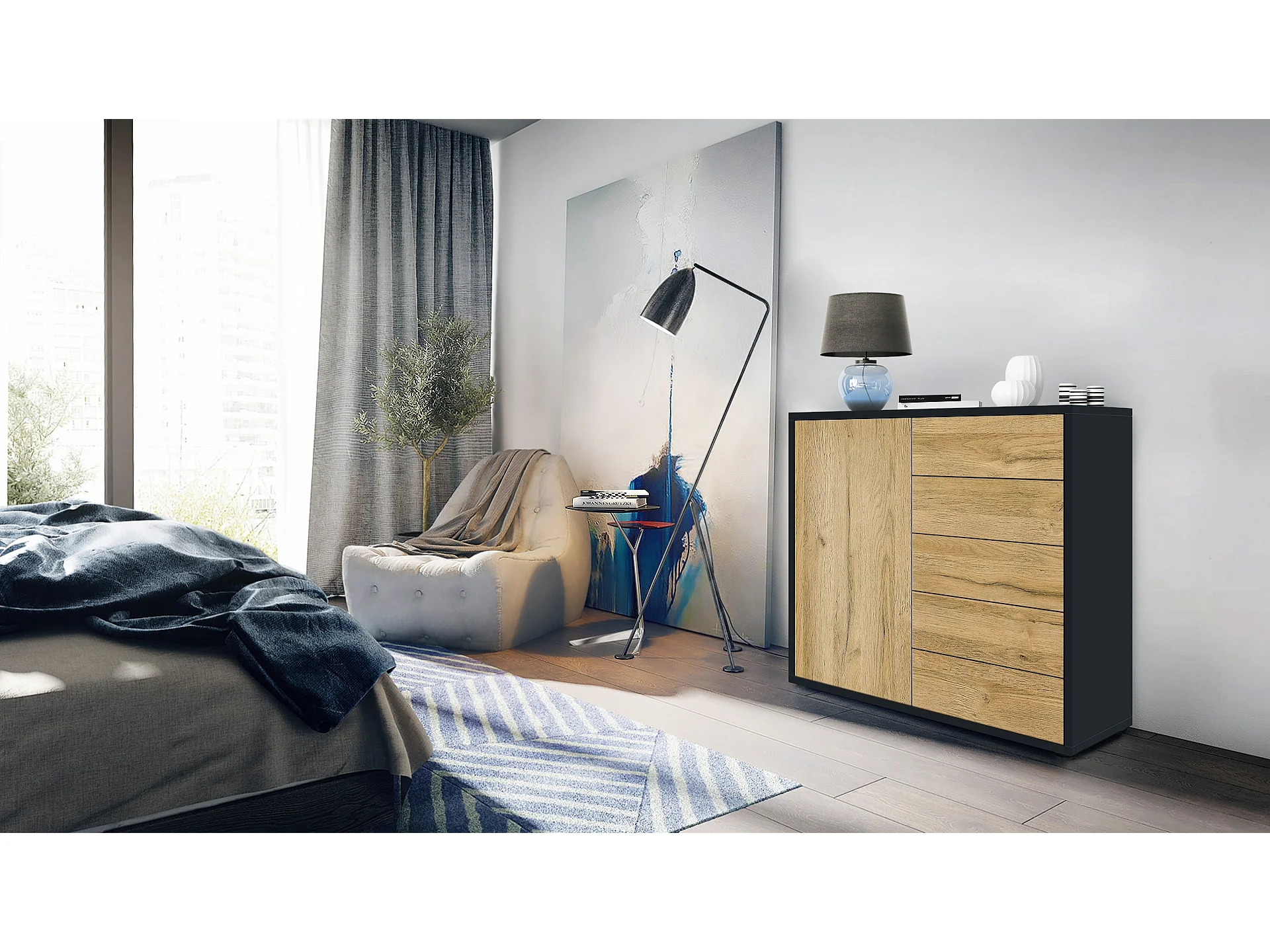 Buffet Ben V2, Commode avec 1 portes et 5 tiroirs, Noir mat/Chêne Nature (79 x 74 x 36 cm)