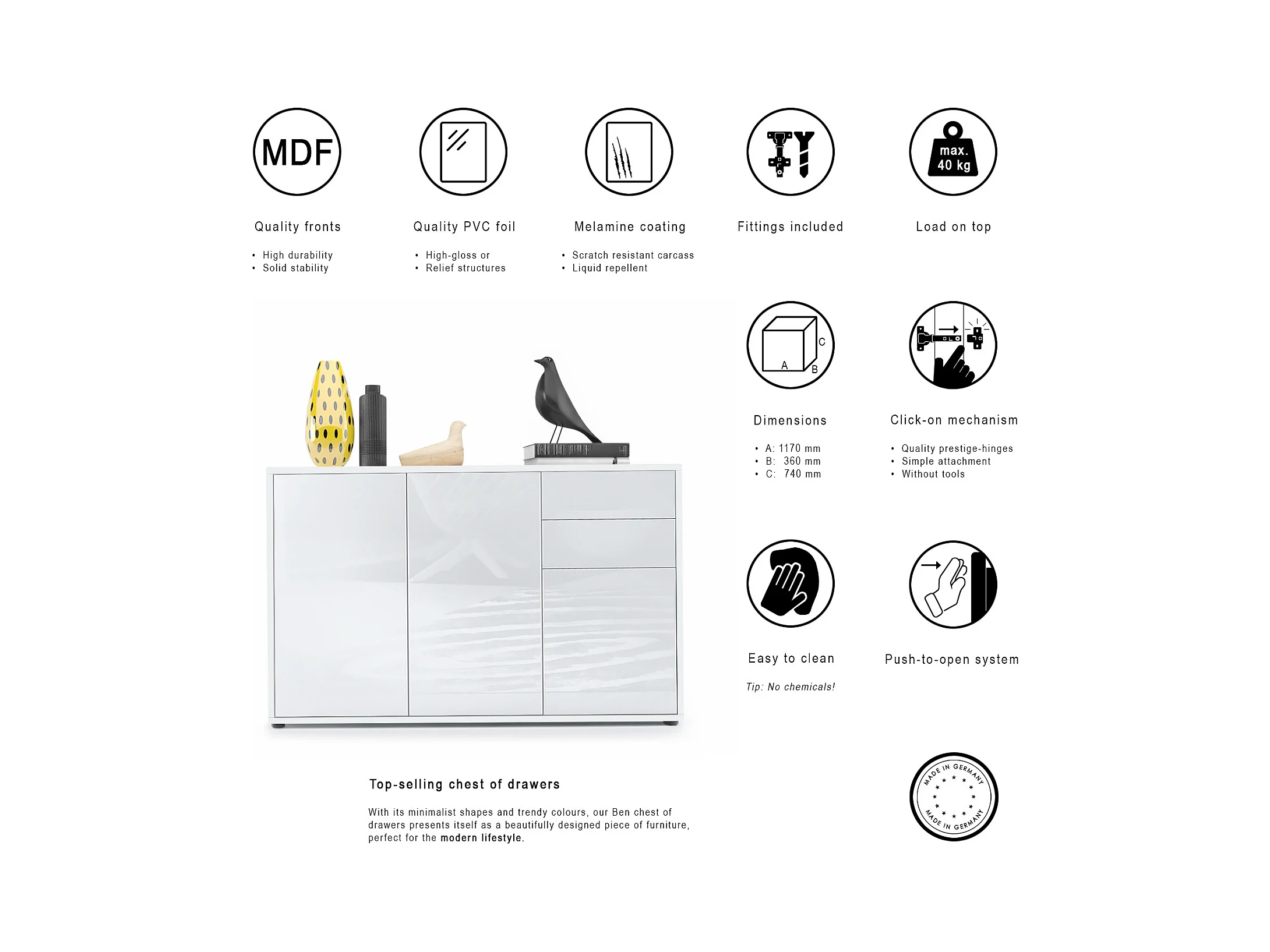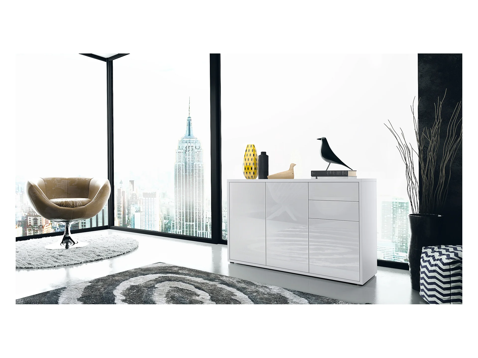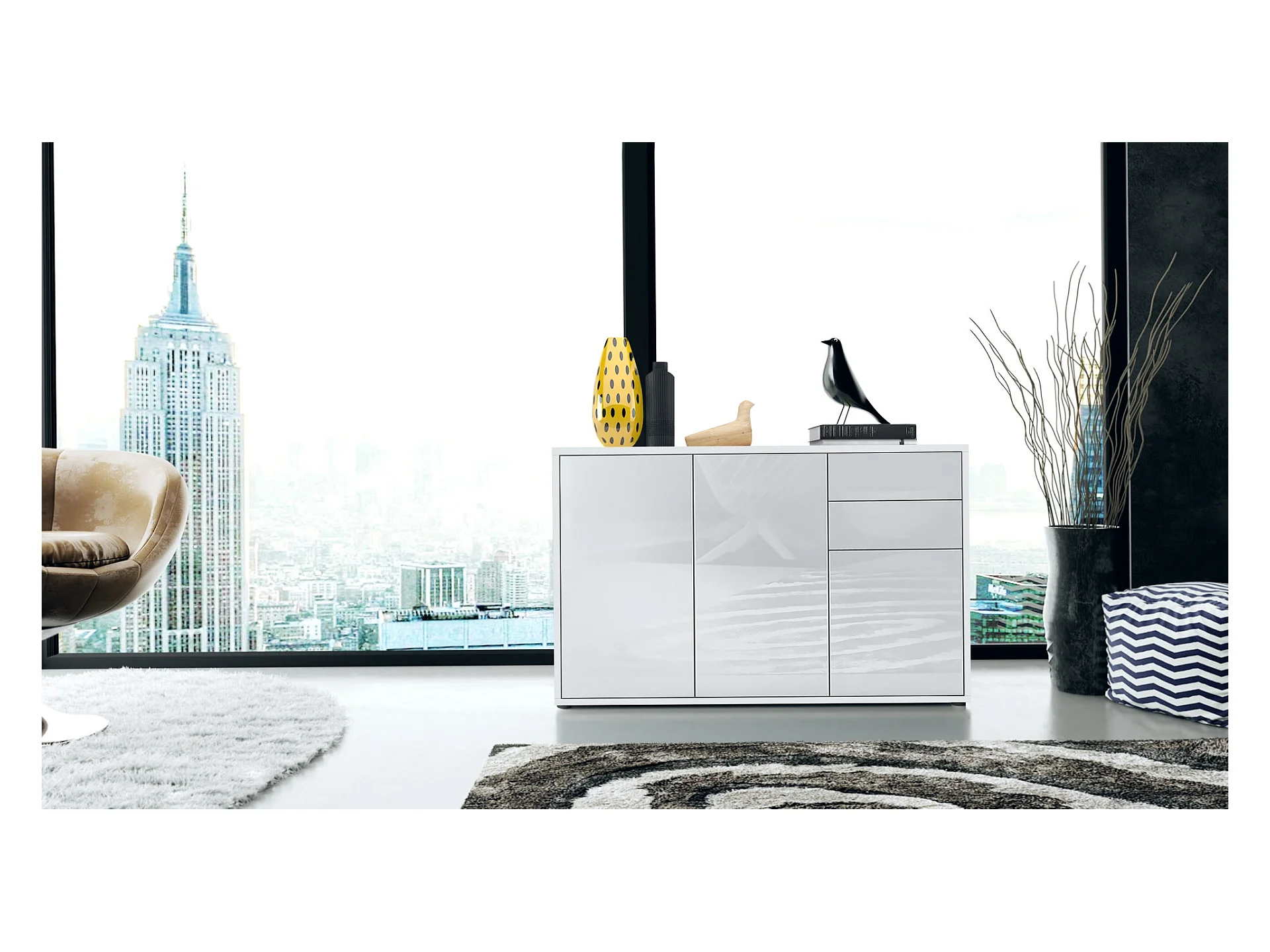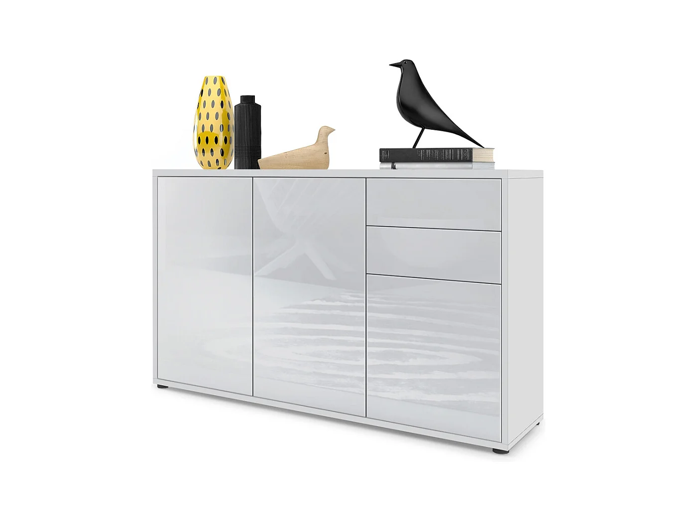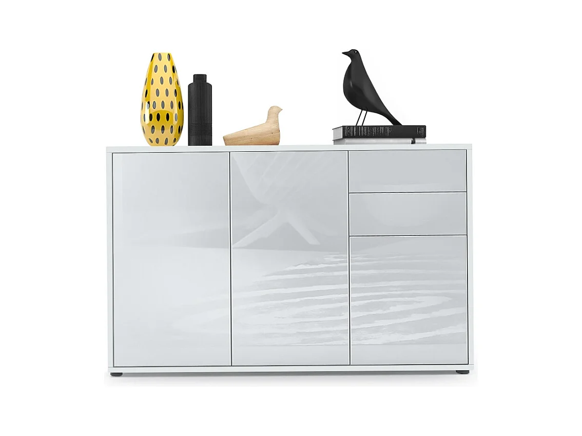 Buffet Ben V3, Commode avec 3 portes et 2 tiroirs, Blanc mat/Blanc haute brillance (117 x 74 x 36 cm)
