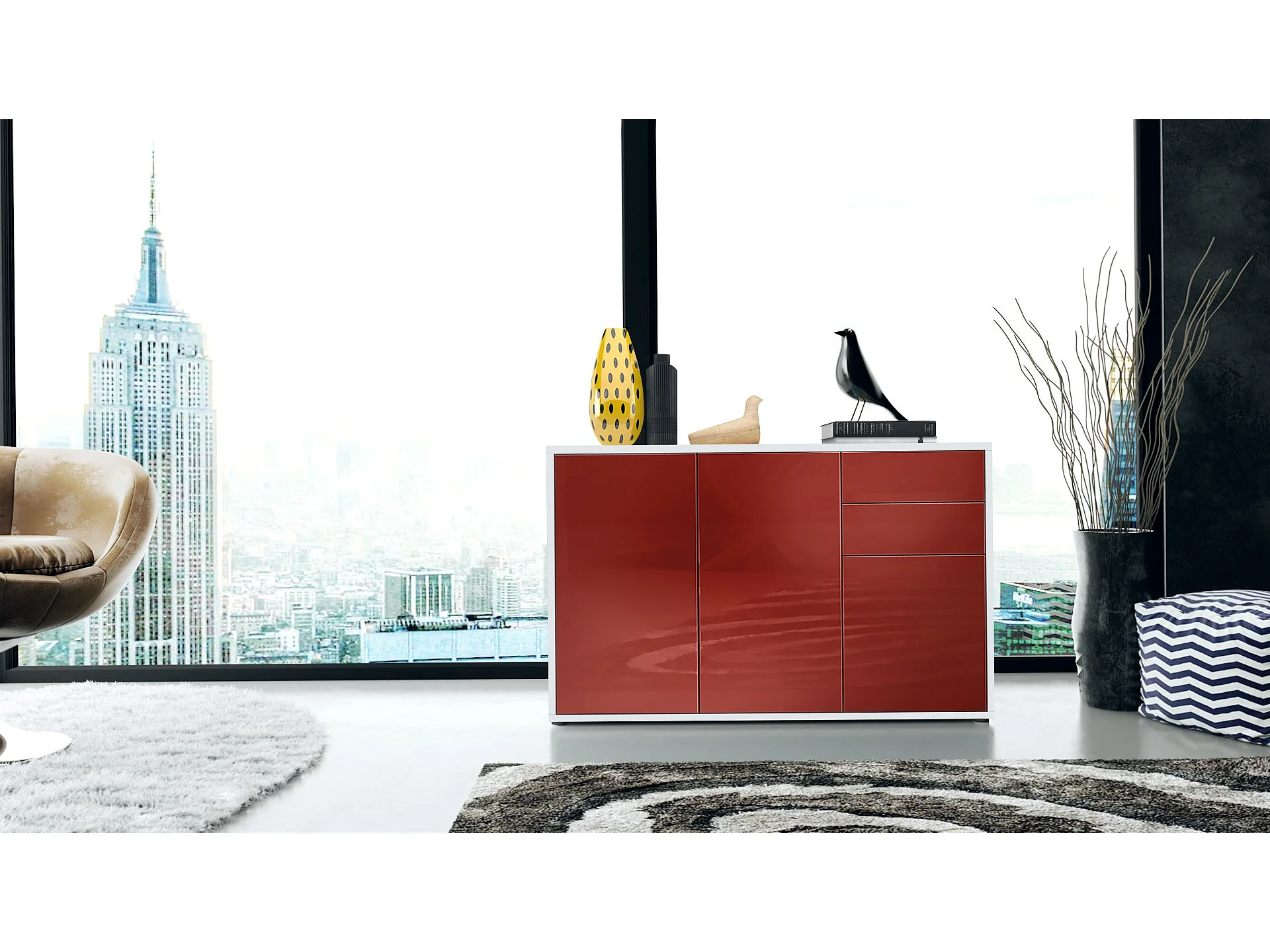 Buffet Ben V3, Commode avec 3 portes et 2 tiroirs, Blanc mat/Bordeaux haute brillance (117 x 74 x 36 cm)