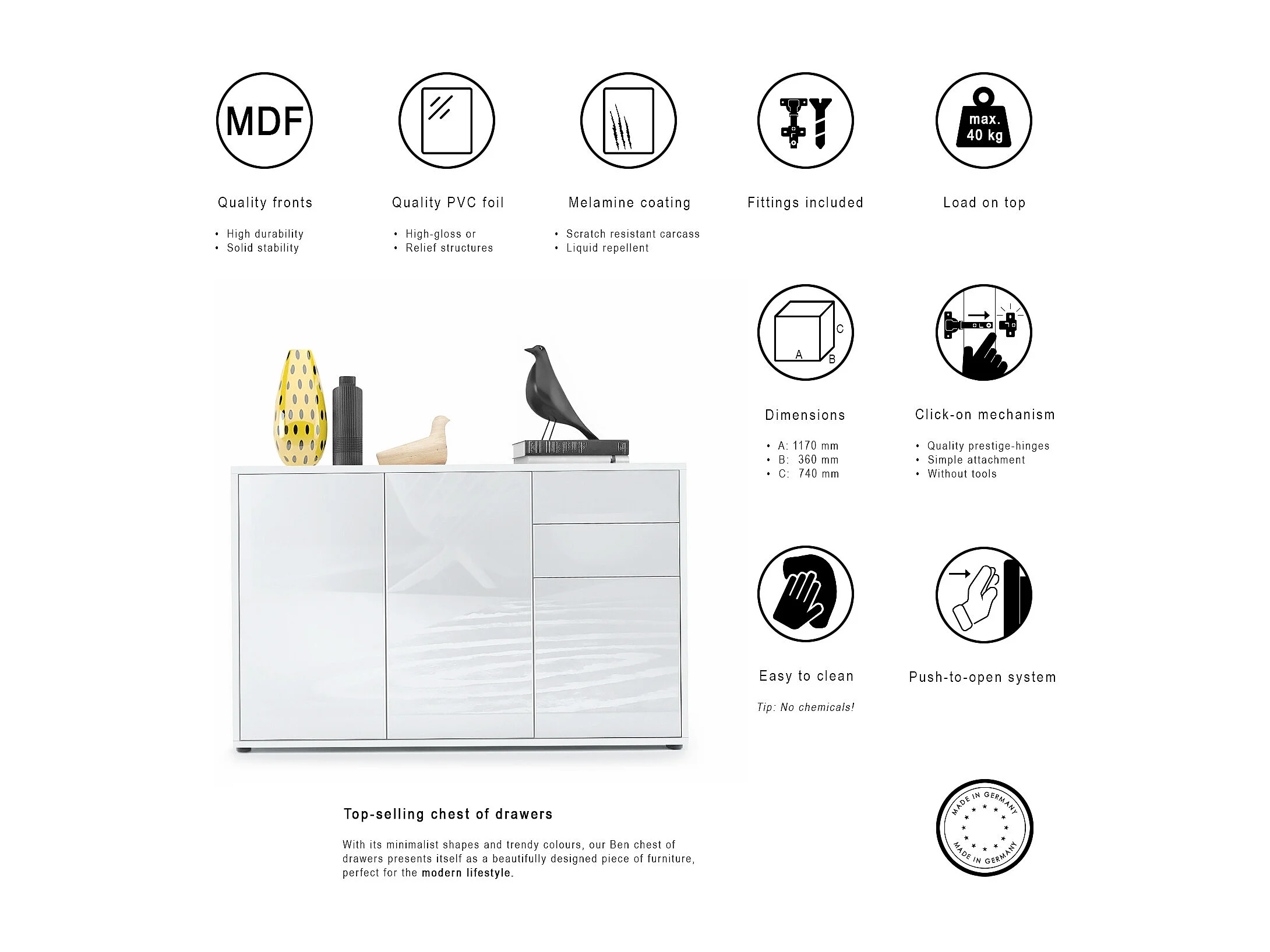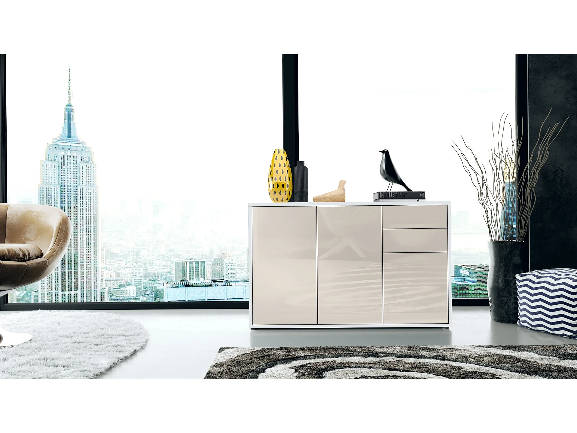 Buffet Ben V3, Commode avec 3 portes et 2 tiroirs, Blanc mat/Crème haute brillance (117 x 74 x 36 cm)