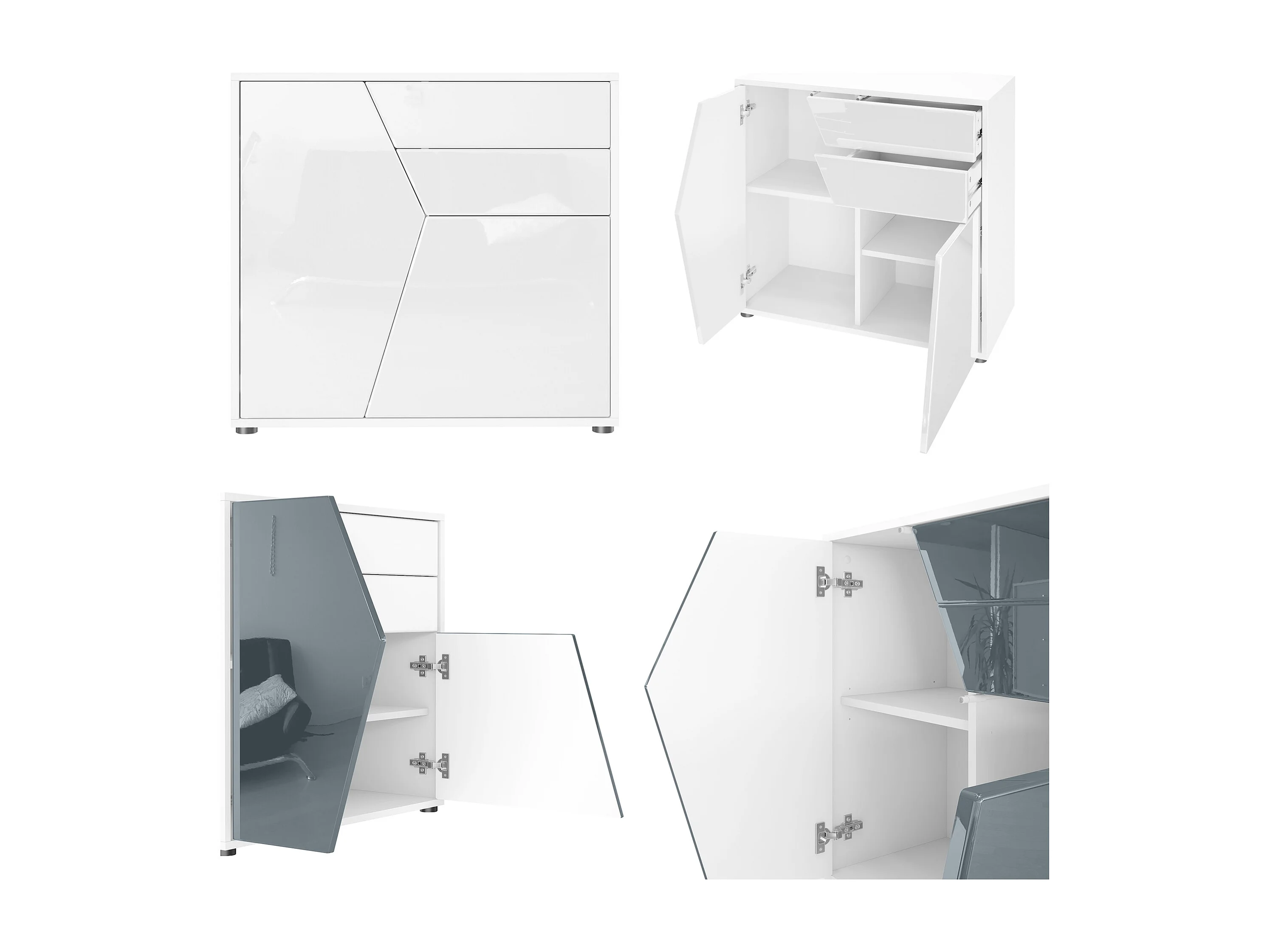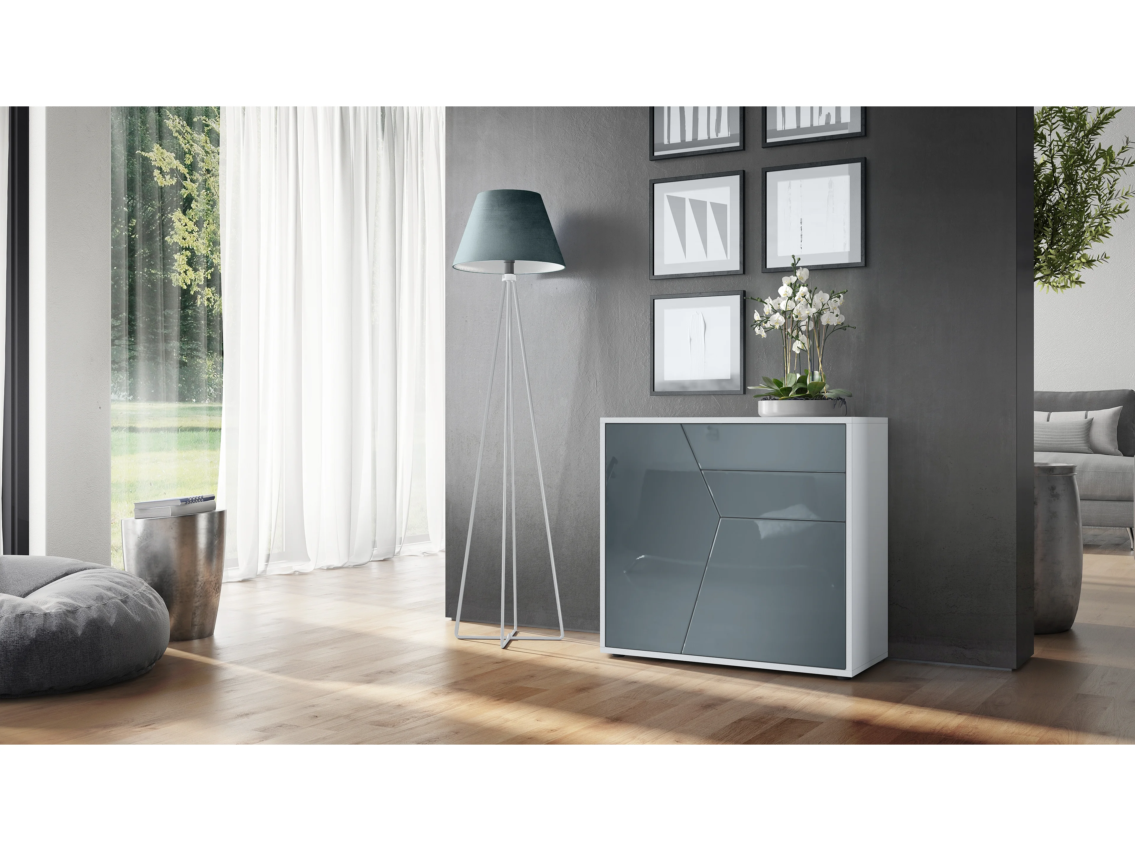 Buffet Benny, Commode avec 2 portes et 2 tiroirs, Blanc mat/Gris haute brillance (79 x 74 x 36 cm)