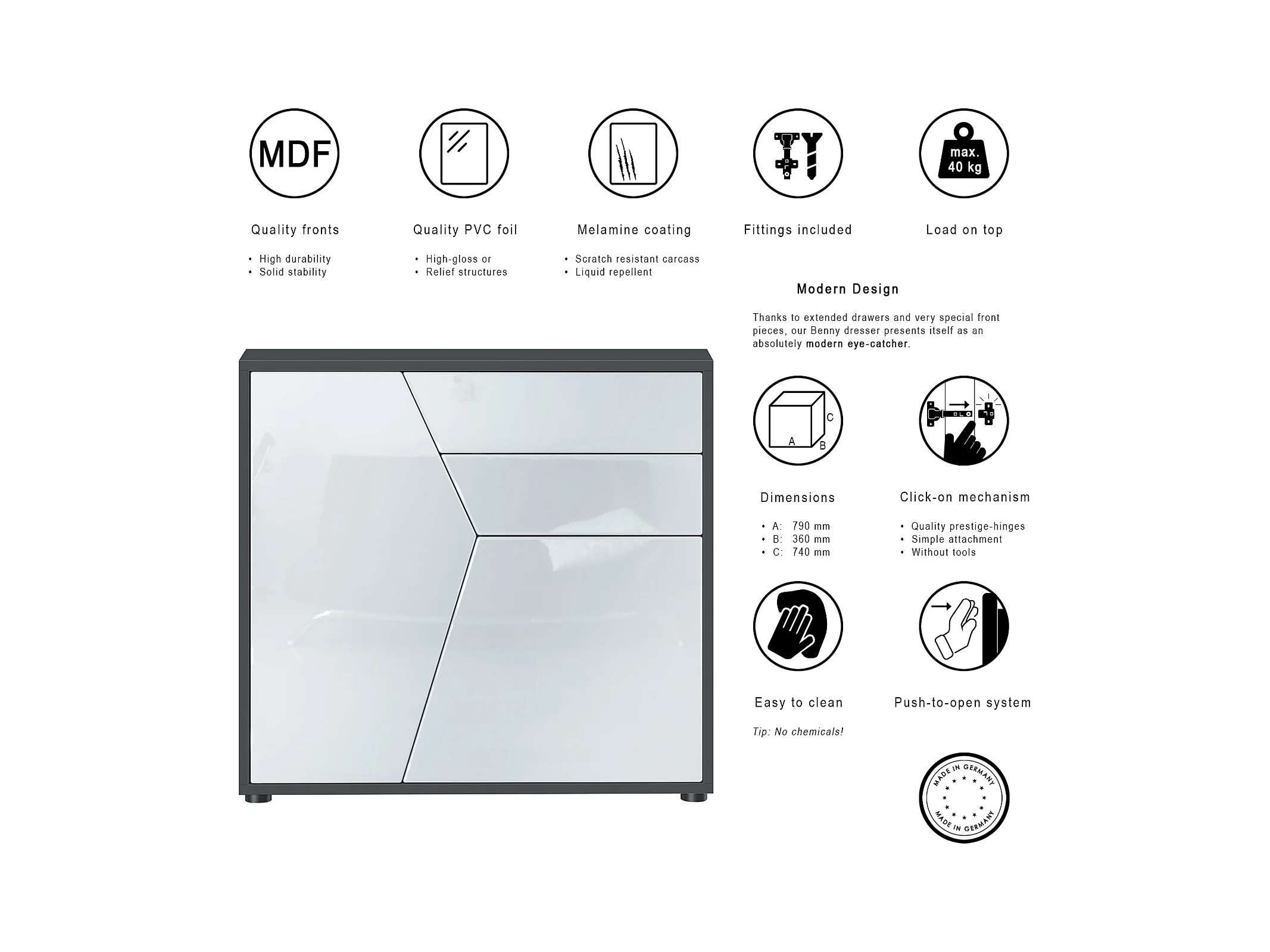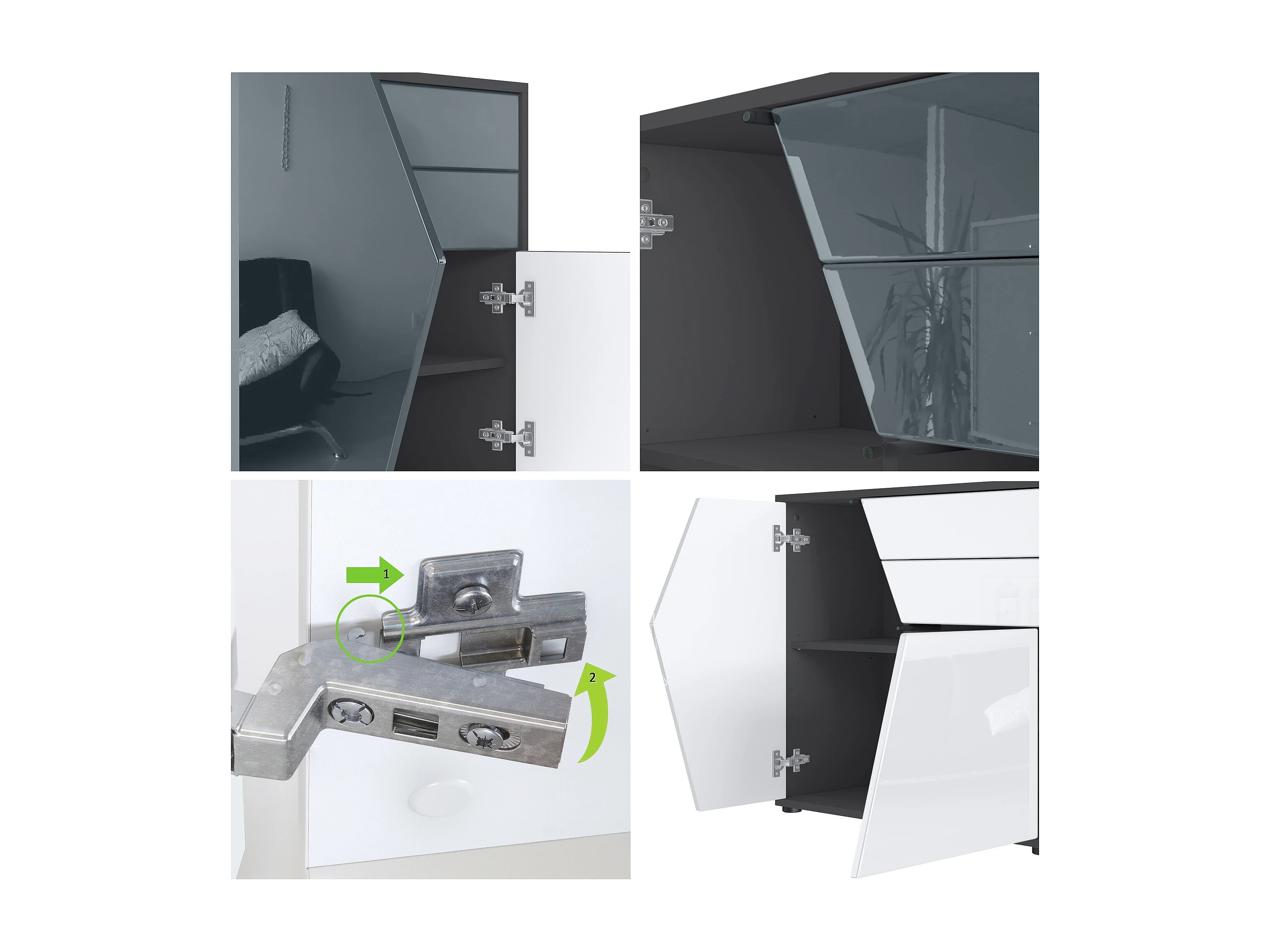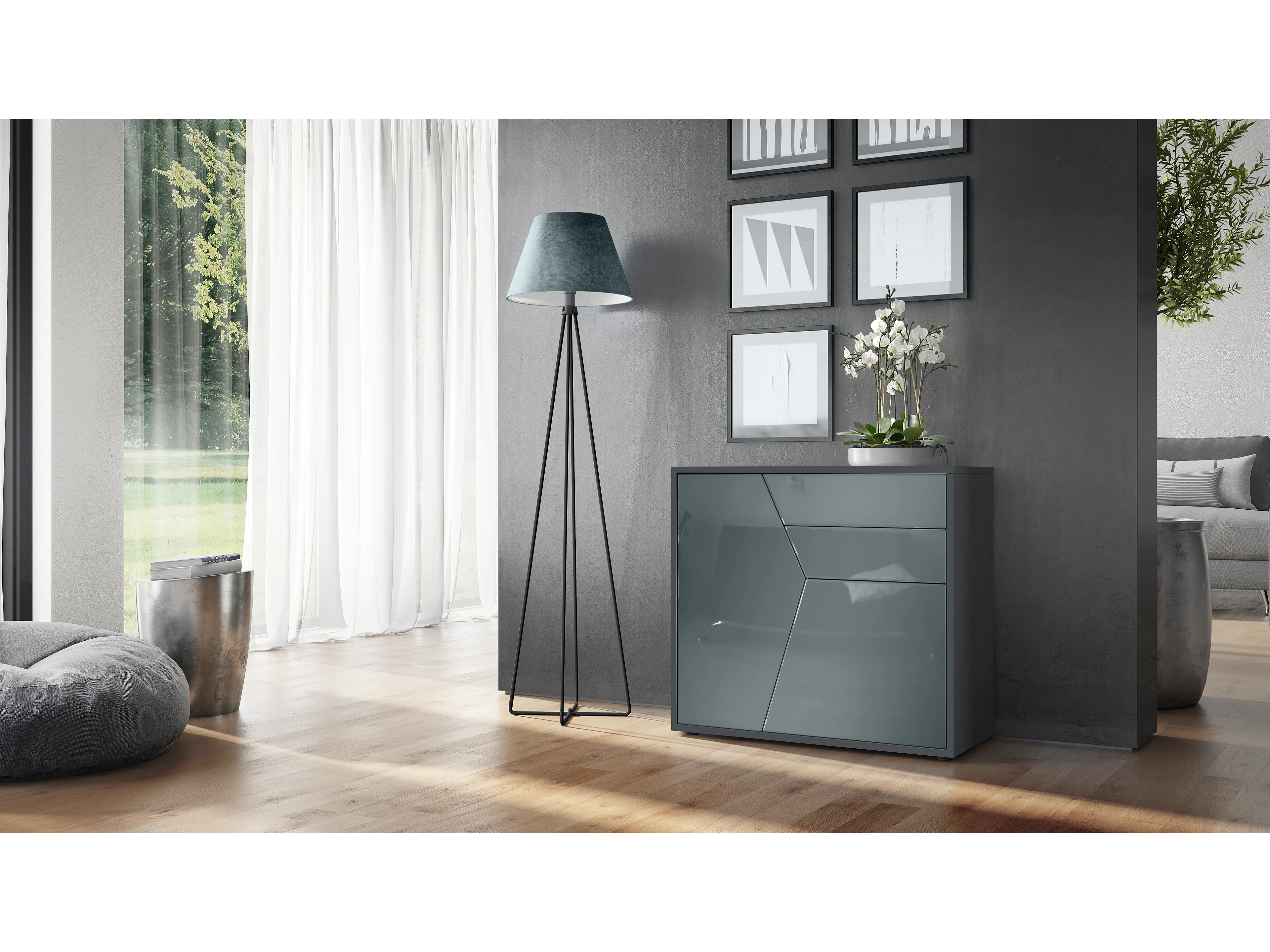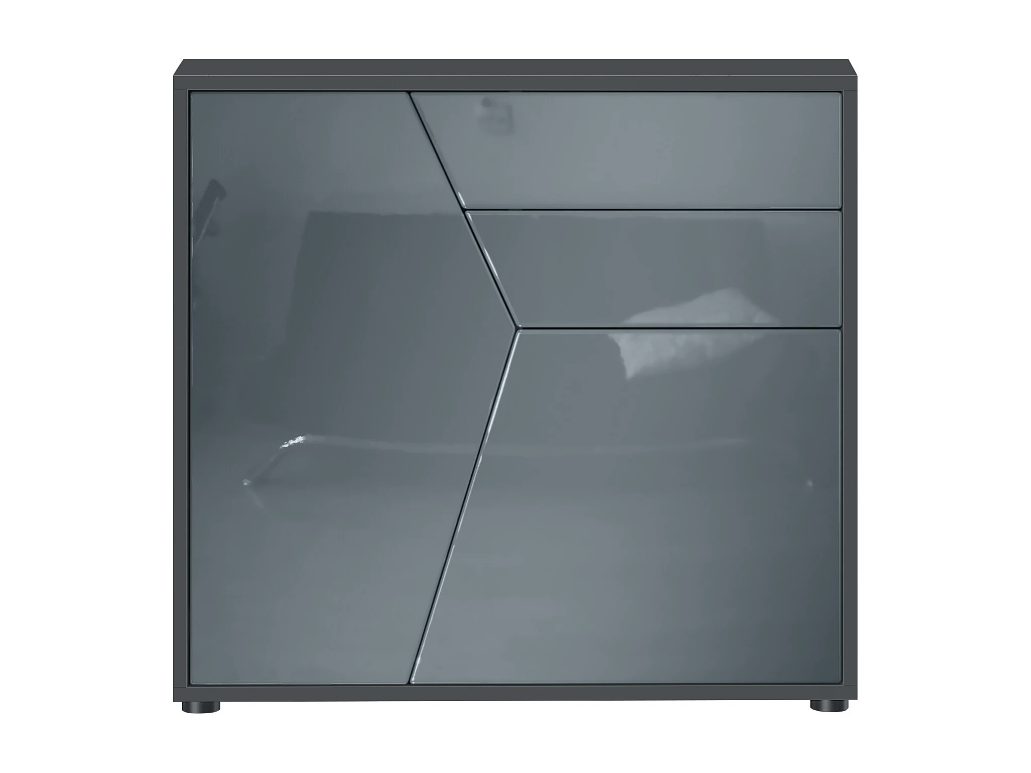 Buffet Benny, Commode avec 2 portes et 2 tiroirs, Noir mat/Gris haute brillance (79 x 74 x 36 cm)