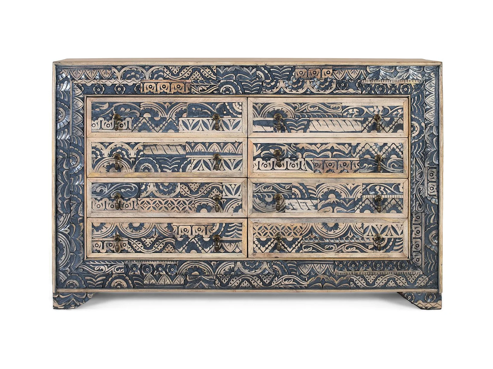 Buffet bicolore en manguier sculpté, naturel et bleu vieilli
