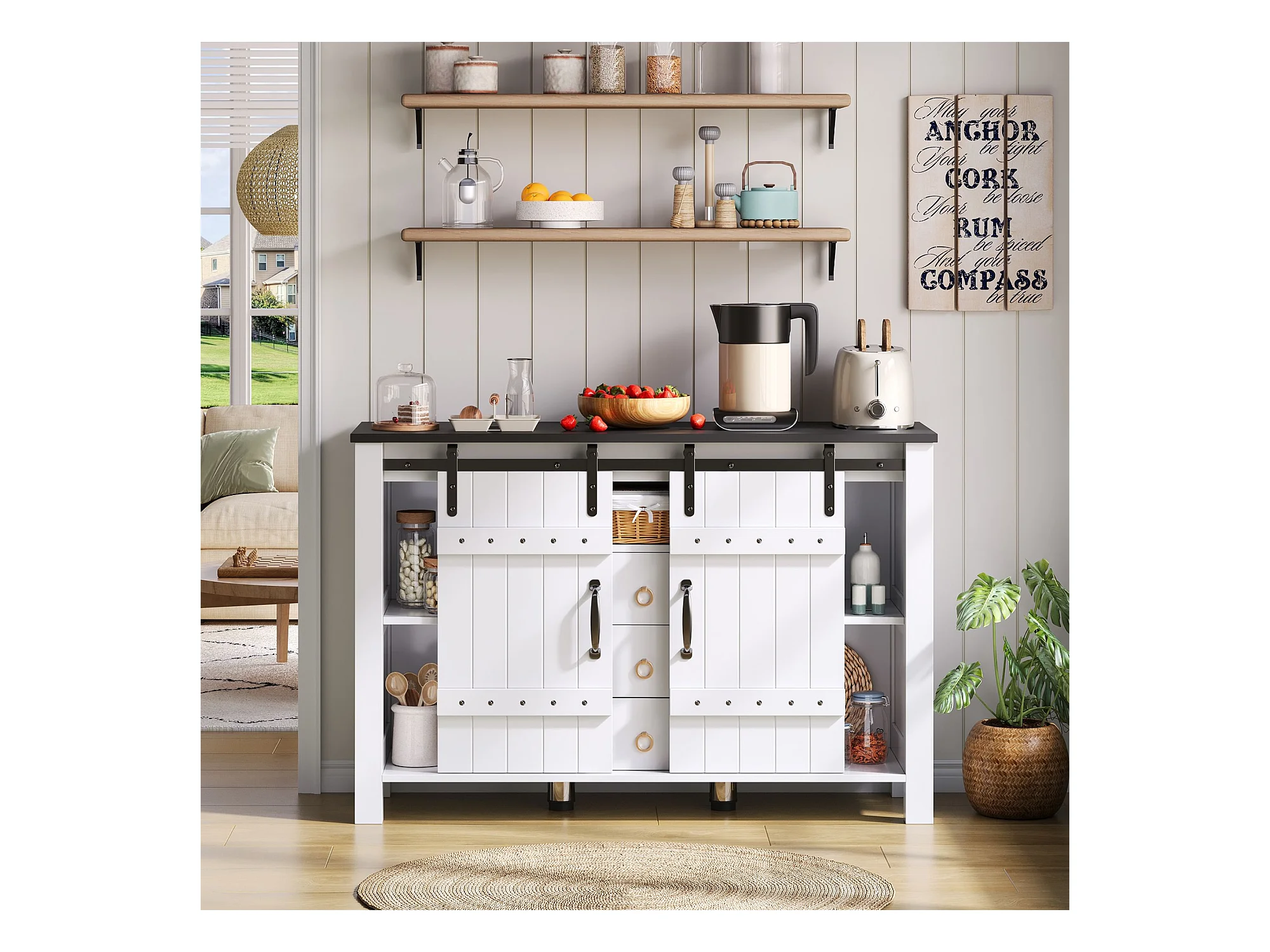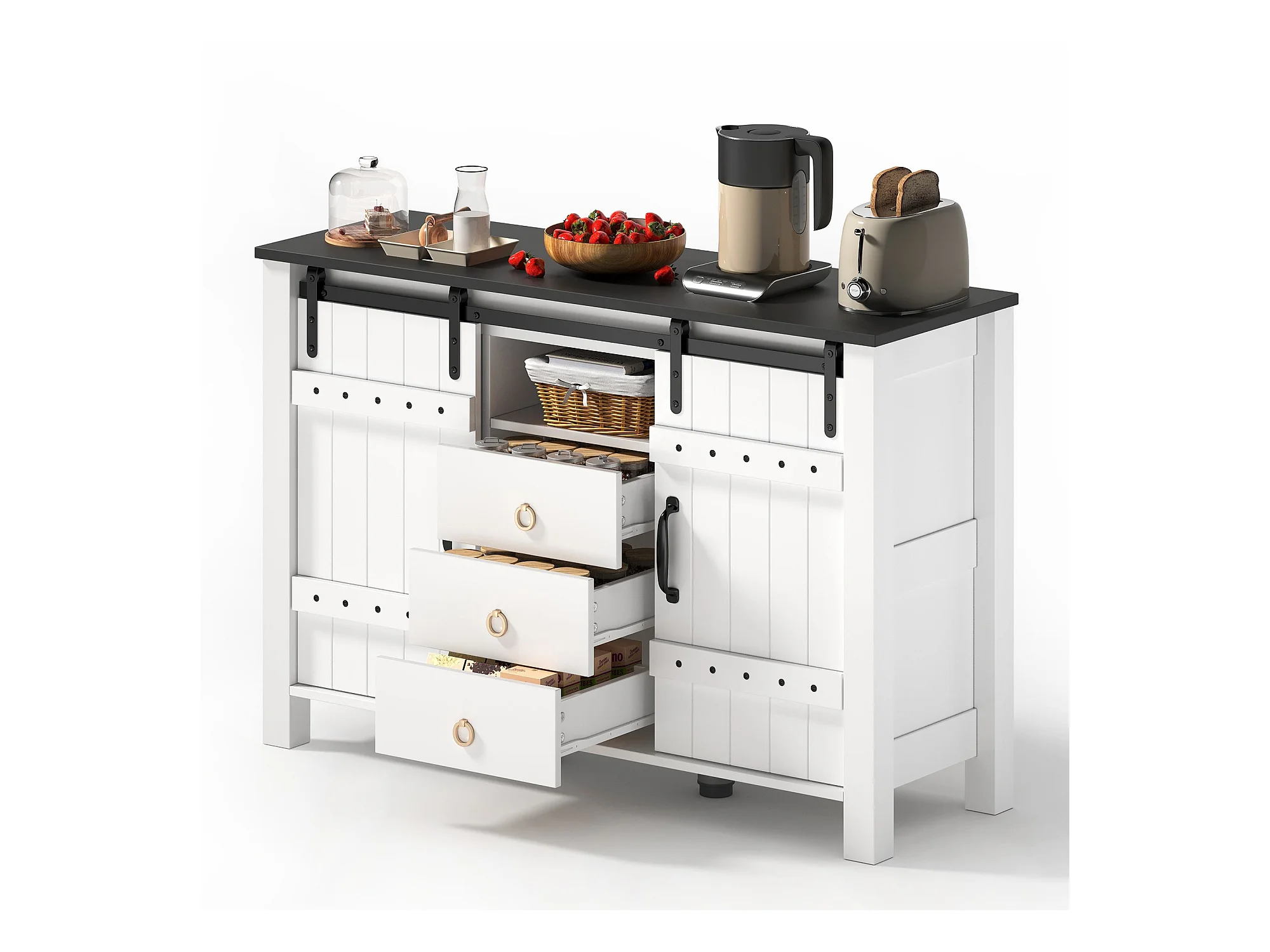 Buffet blanc - Buffet avec 2 portes coulissantes et 3 tiroirs - rangement ouvert - pour salle à manger et salon