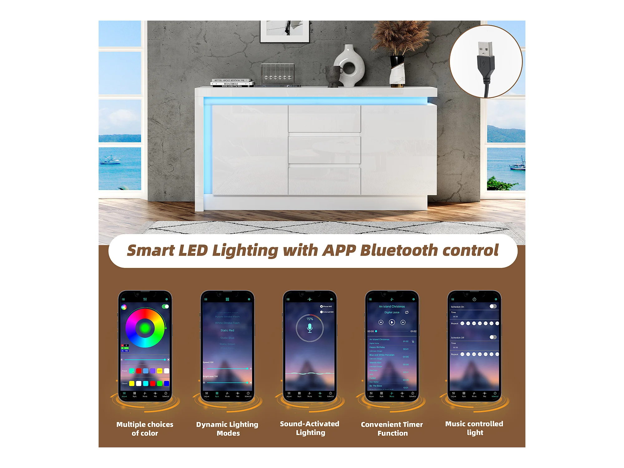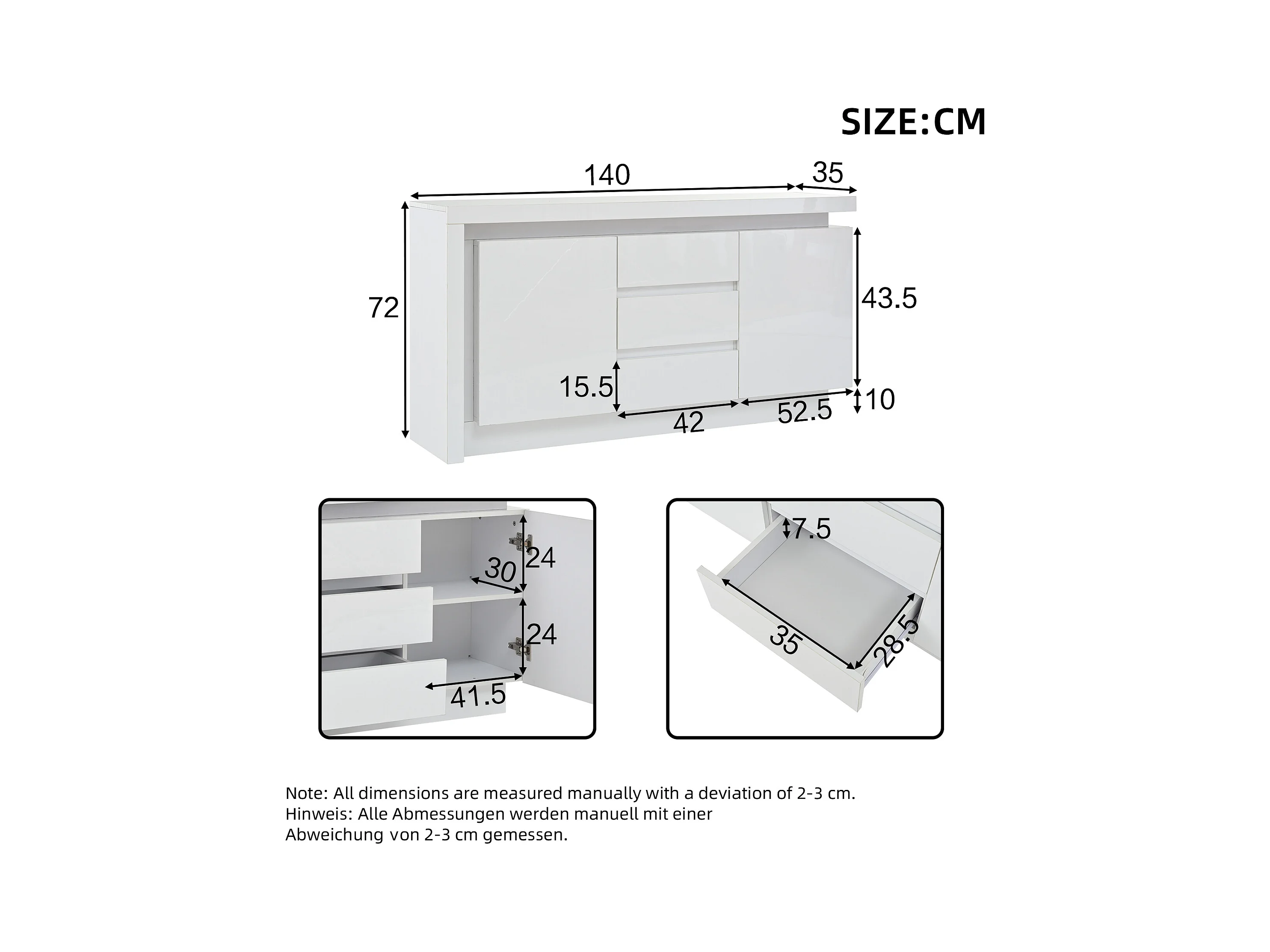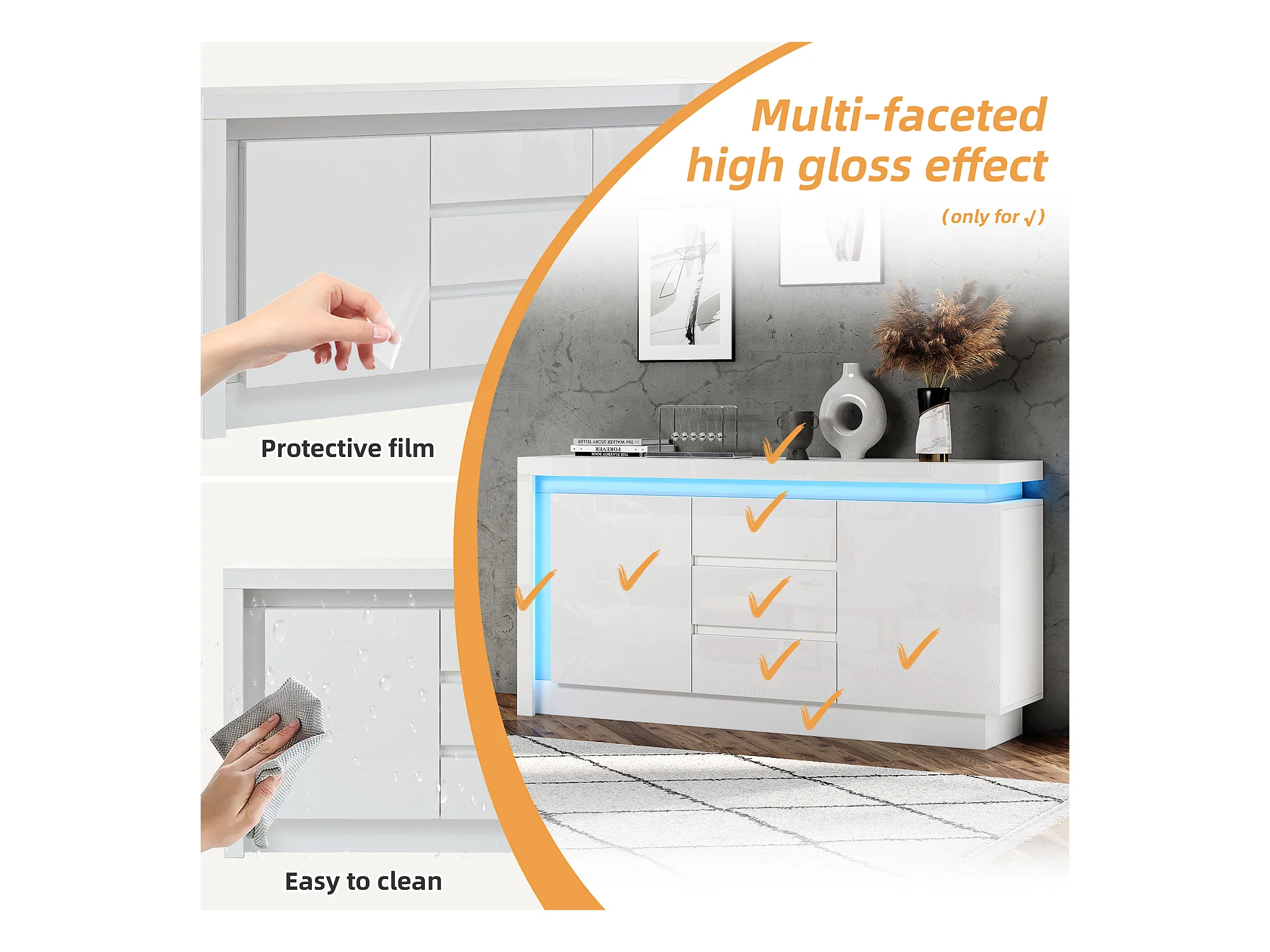 Buffet brillant 140x35x72 cm - 2 portes et 3 tiroirs - avec éclairage LED - avec étagères réglables - blanc
