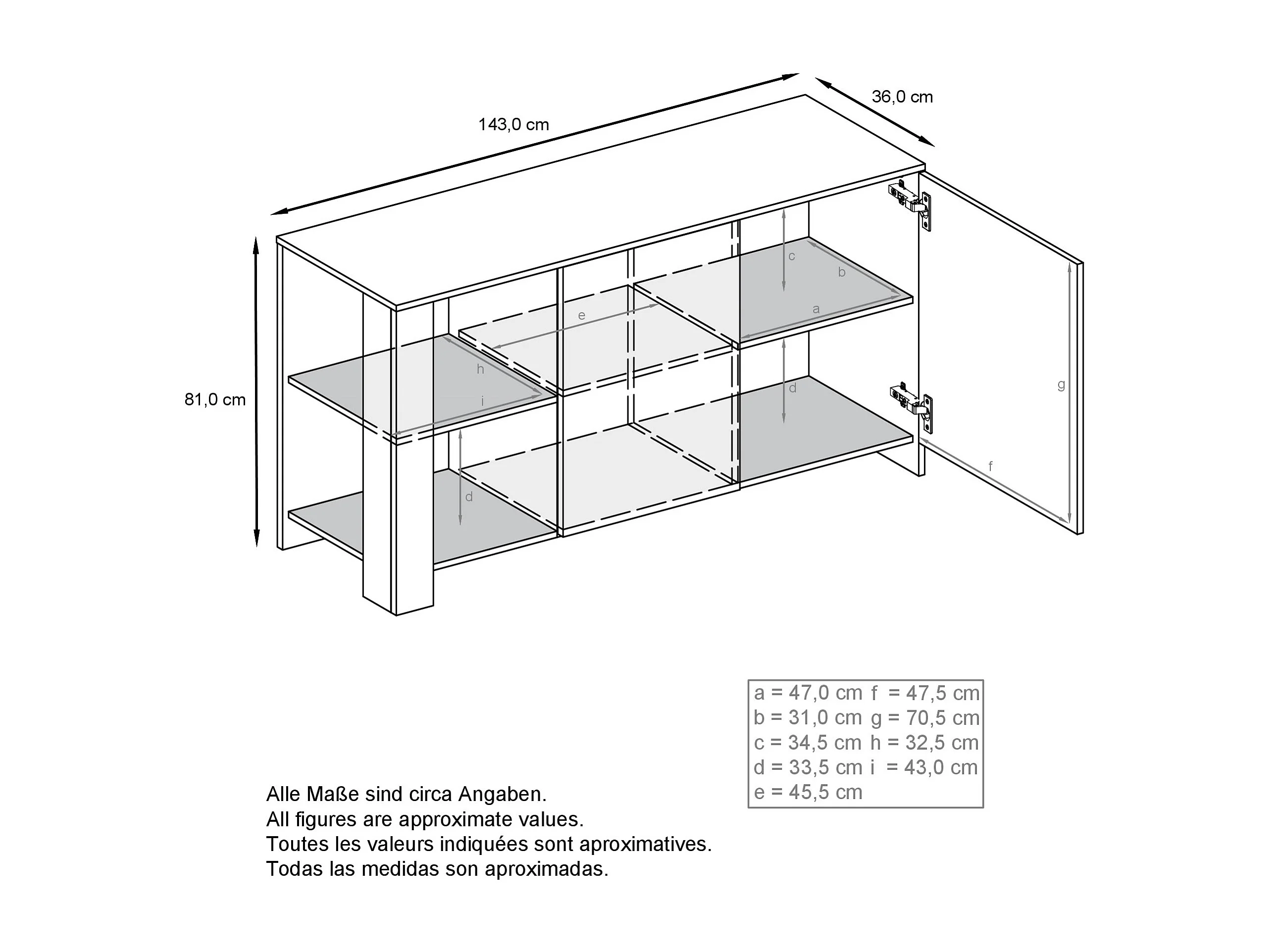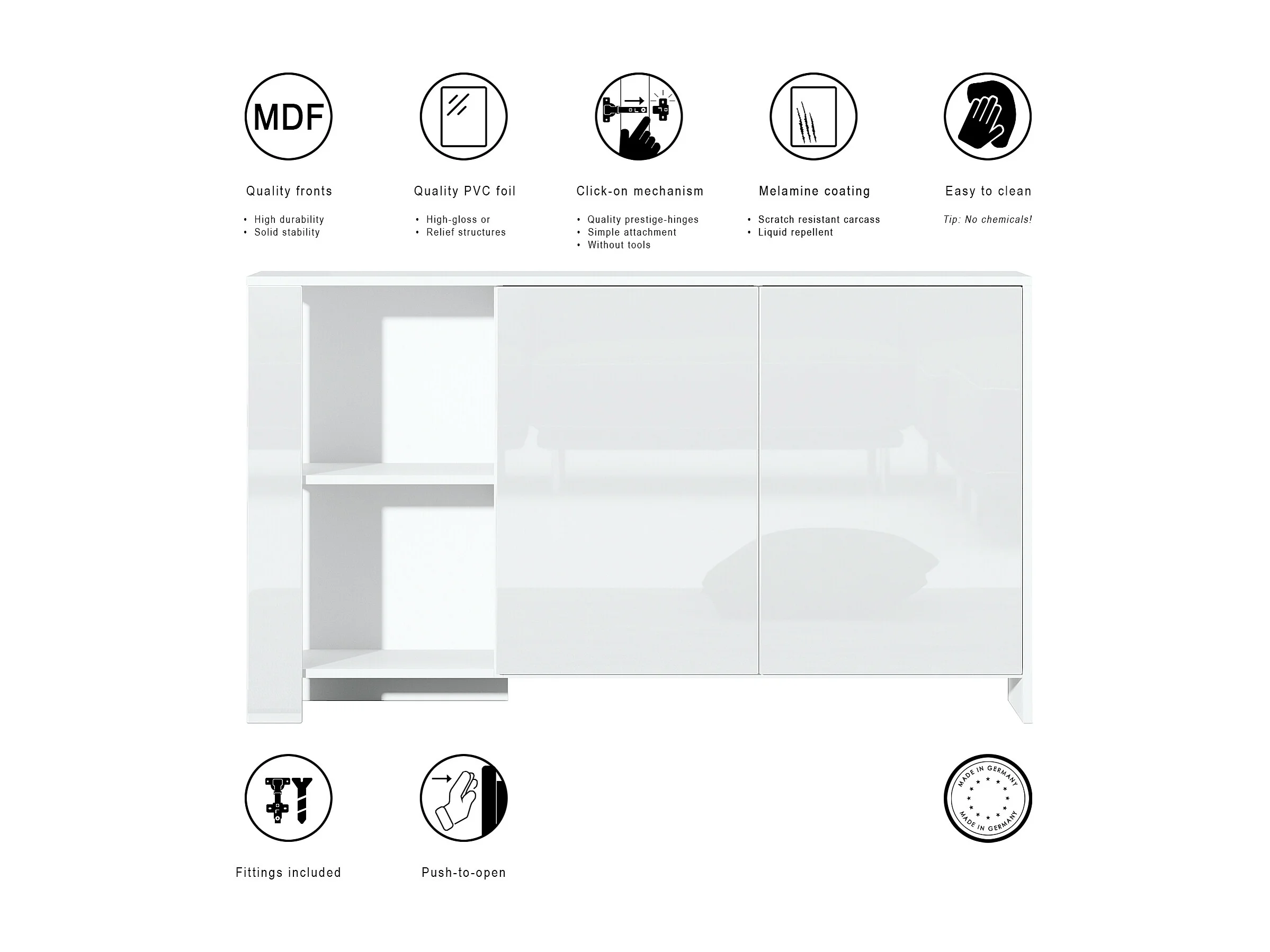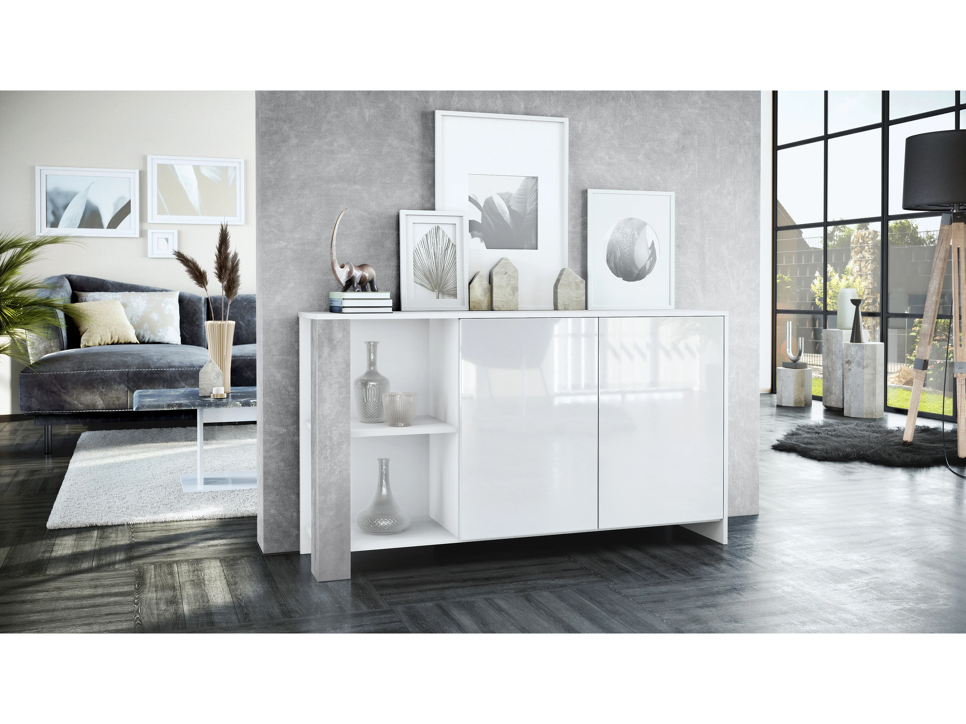 Buffet Canto, long bahut avec 2 portes et 6 compartiments, corps blanc mat, façades blanc brillant, panneaux décoratifs aspect béton oxyde (143 x 81 x 36 cm)
