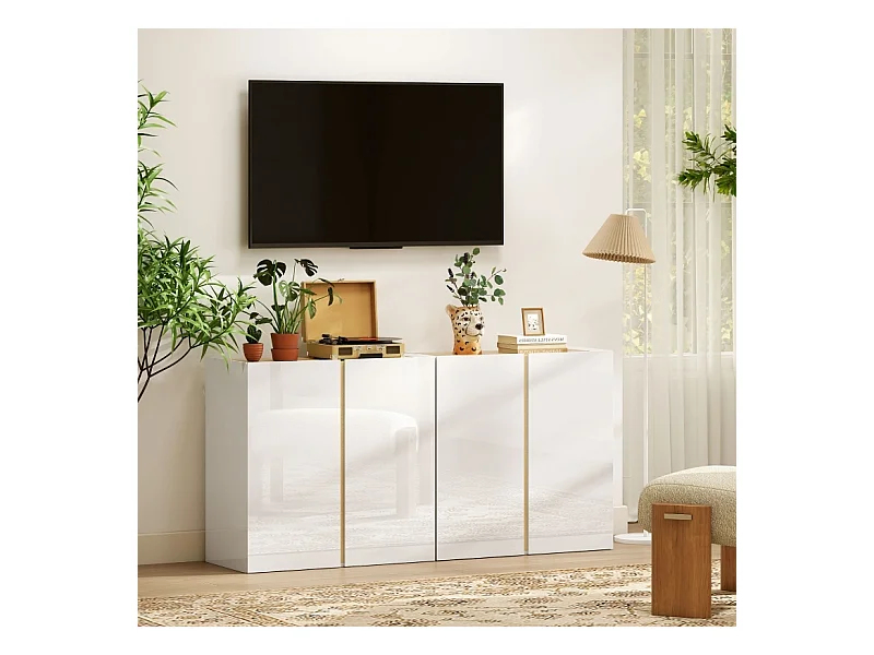 Buffet laqué 140 x 40 x 80 cm – 4 portes, poignées et pieds en métal – Design géométrique blanc pour salon