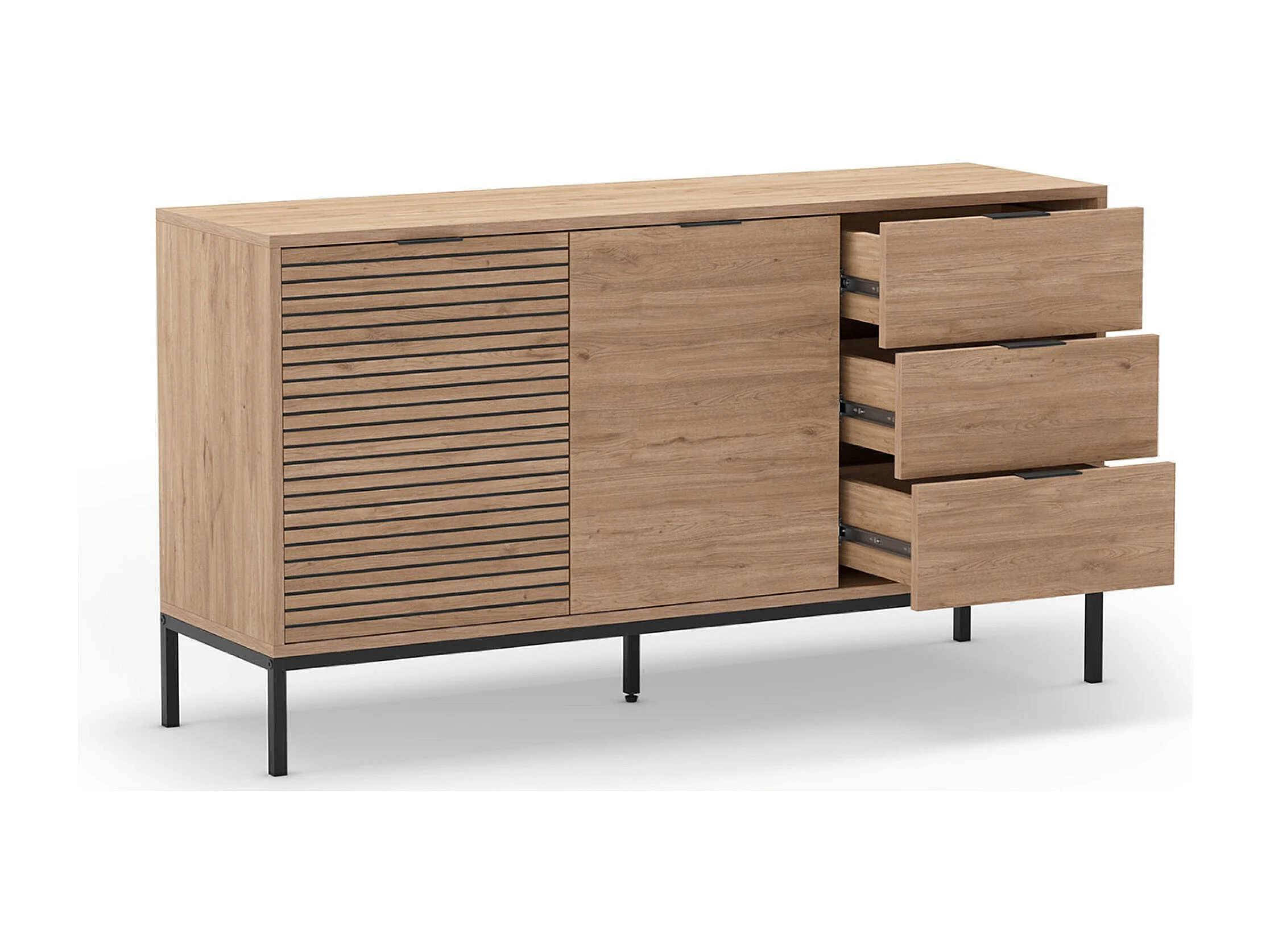 Buffet, commode de rangement avec 2 portes et 3 tiroirs aspect bois coloris naturel, pieds en métal coloris noir - Longueur 140 x Profondeur 40 x Hauteur 80 cm