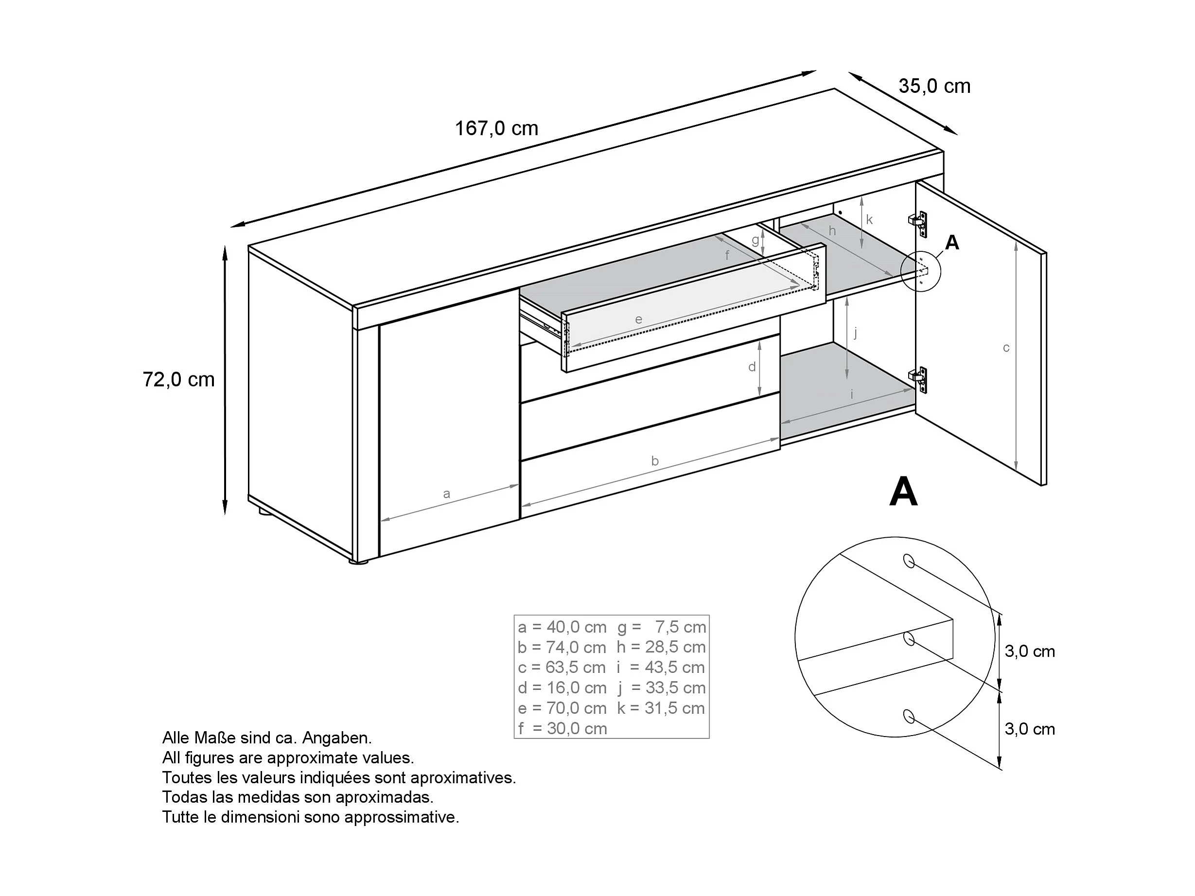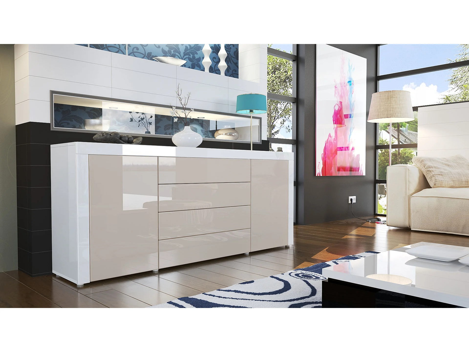 Buffet commode La Paz, Corps en Blanc haute brillance / Façades en gris sable haute brillance avec une bordure en blanc haute brillance