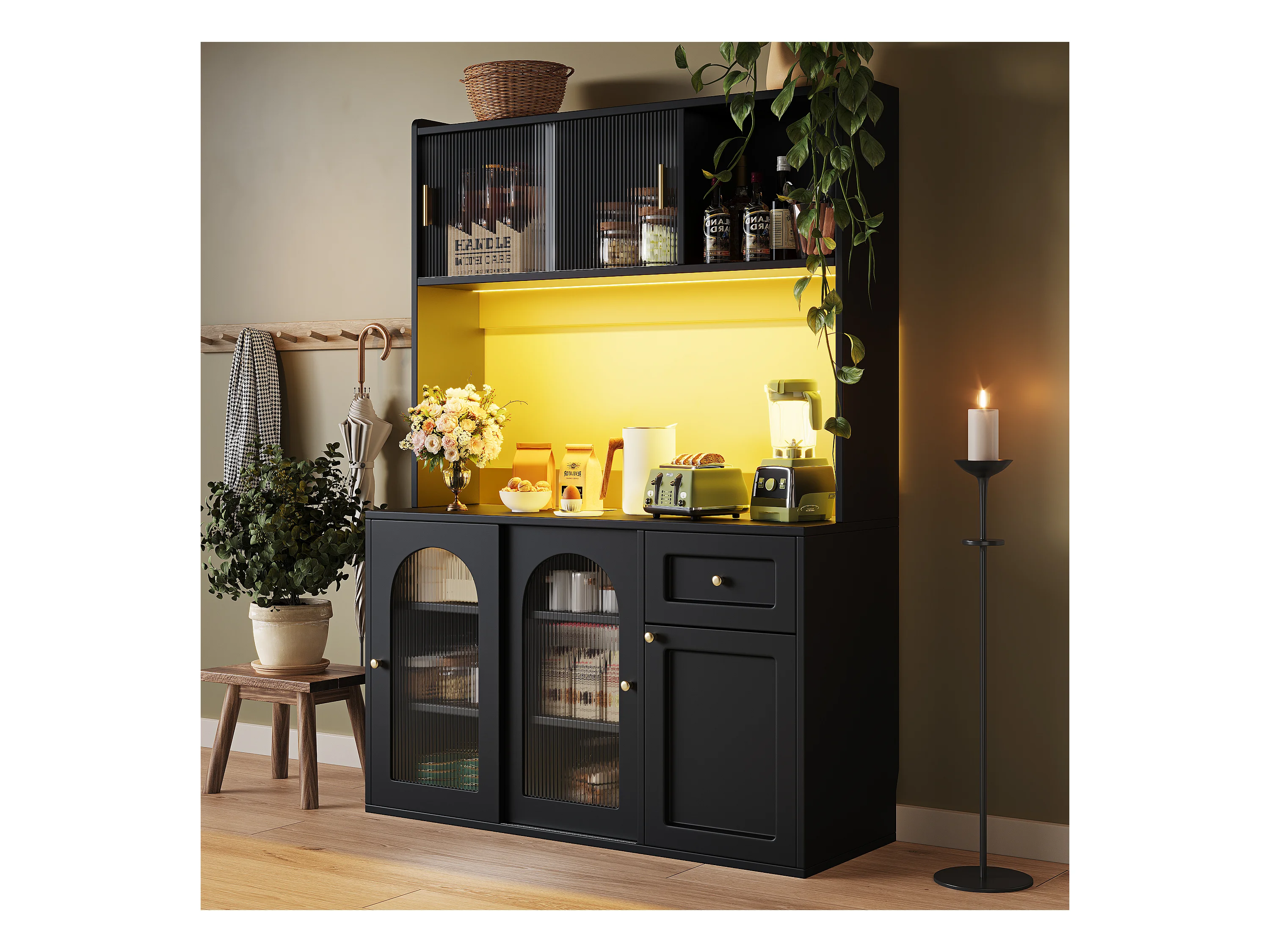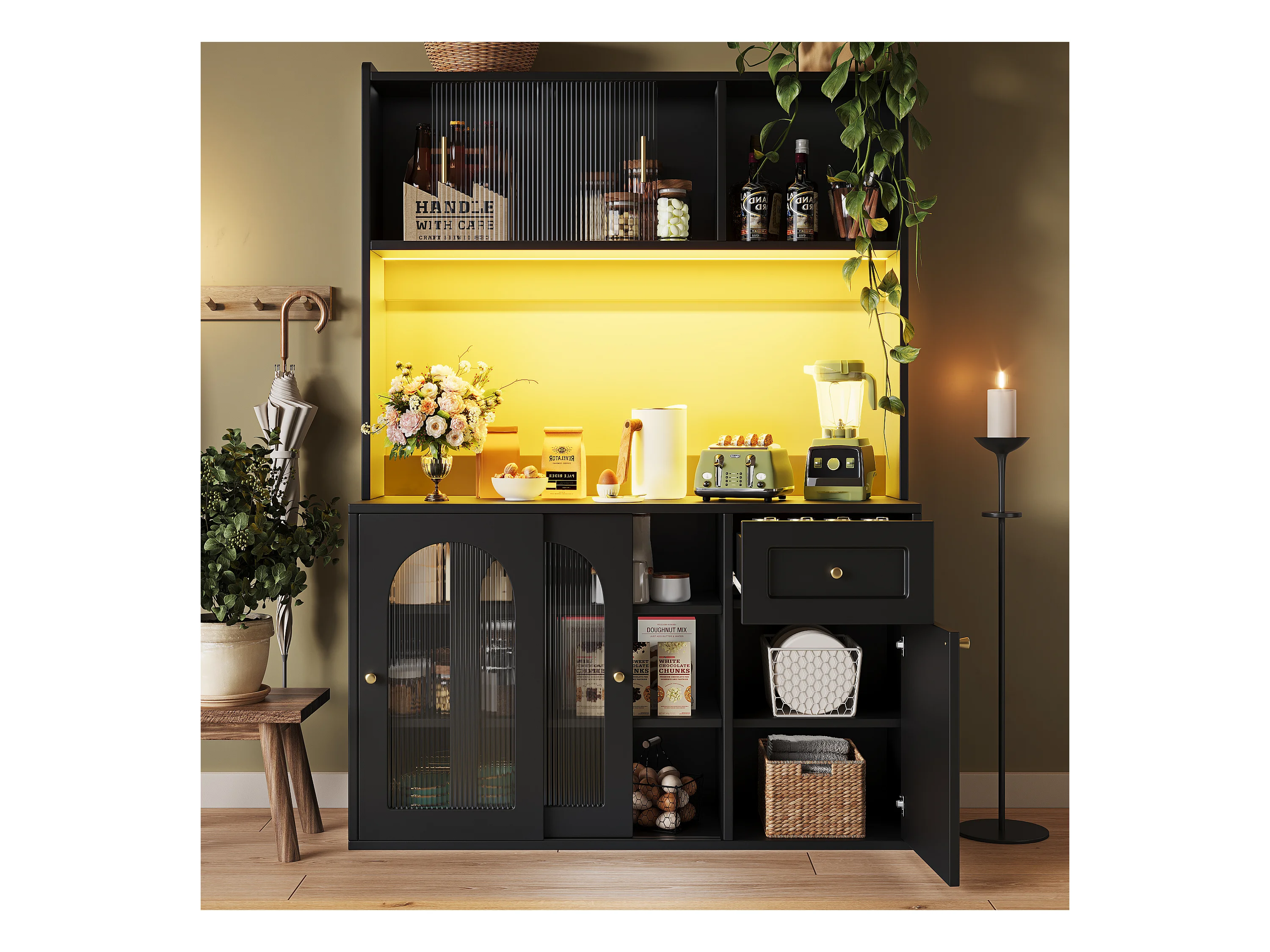 Buffet cuisine haut - 120 x 35 x 167 cm - avec étagères réglables + 3 portes + 1 tiroirs + Leds - MDF + PB - noir