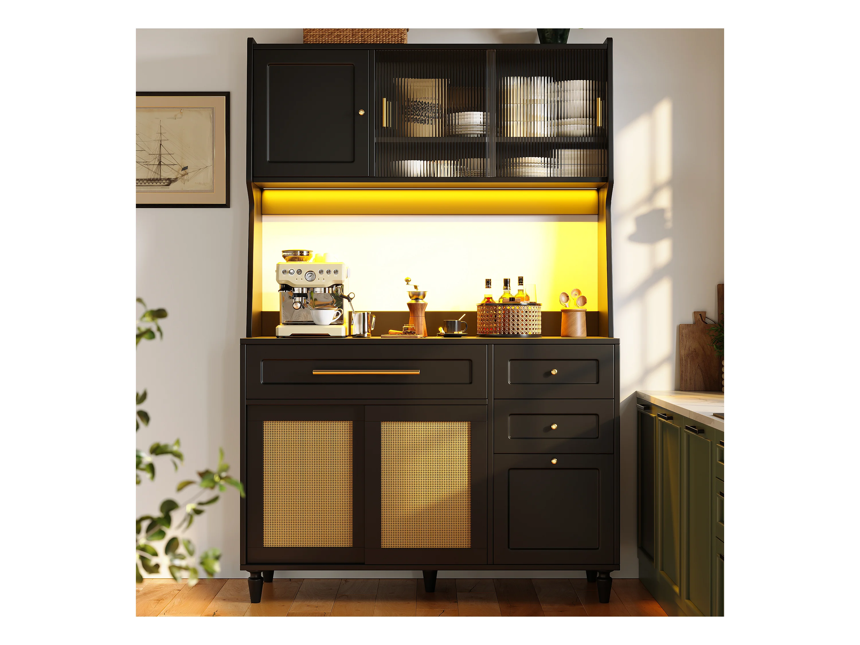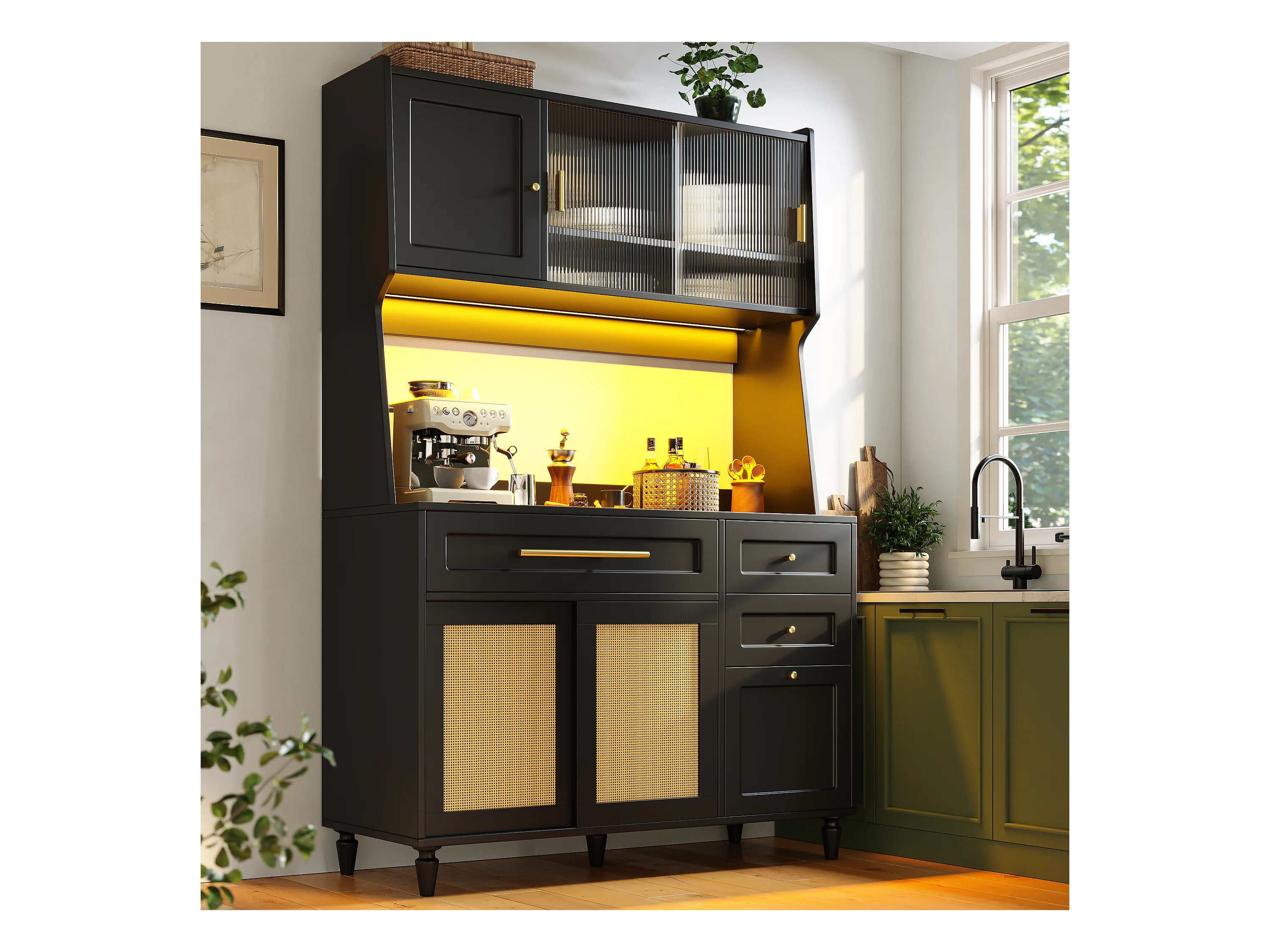 Buffet cuisine haut - 120 x 45 x 195.5 cm - avec étagères réglables + 3 tiroirs + 3 portes + Leds - MDF + rotin PE - noir