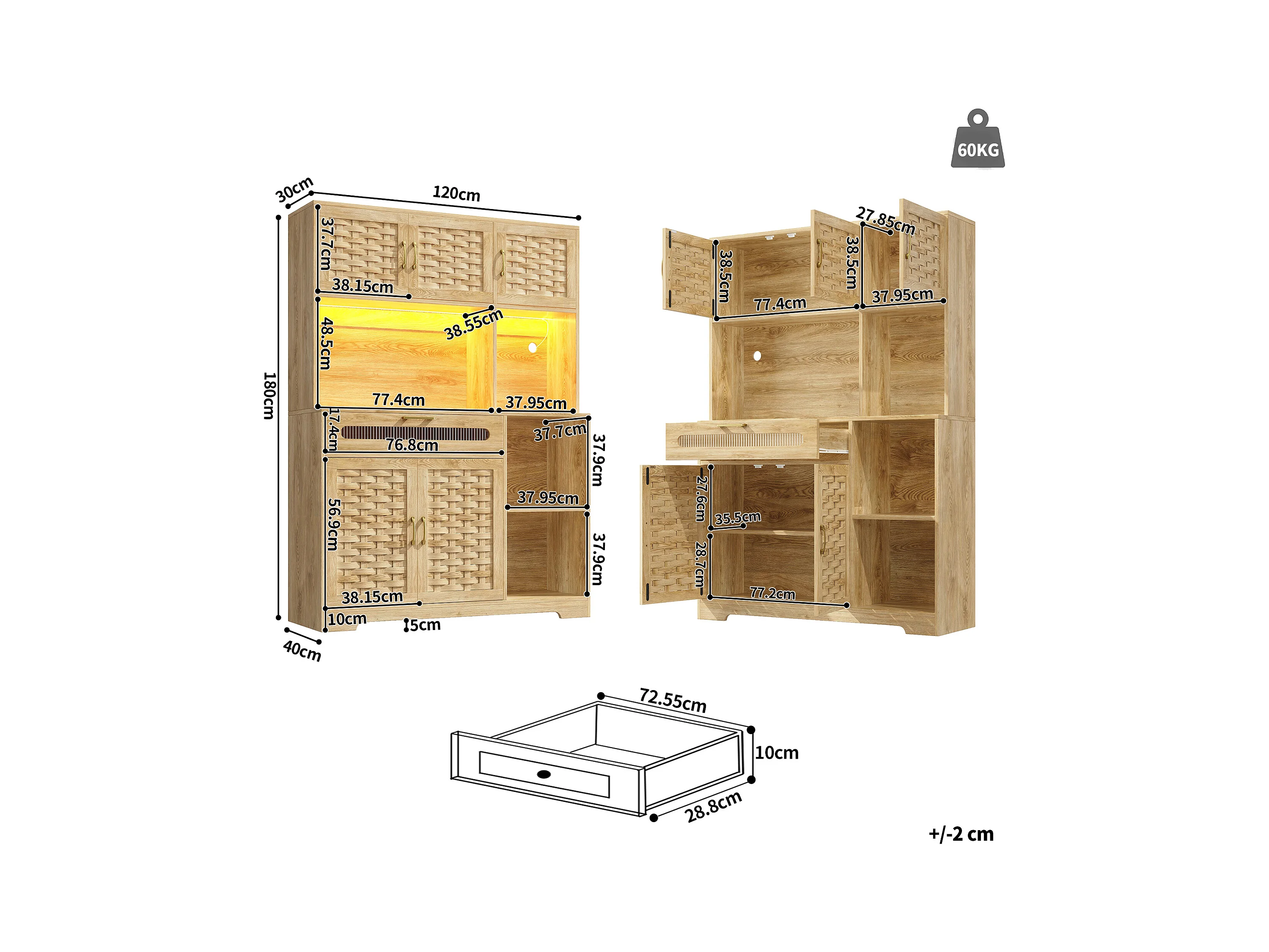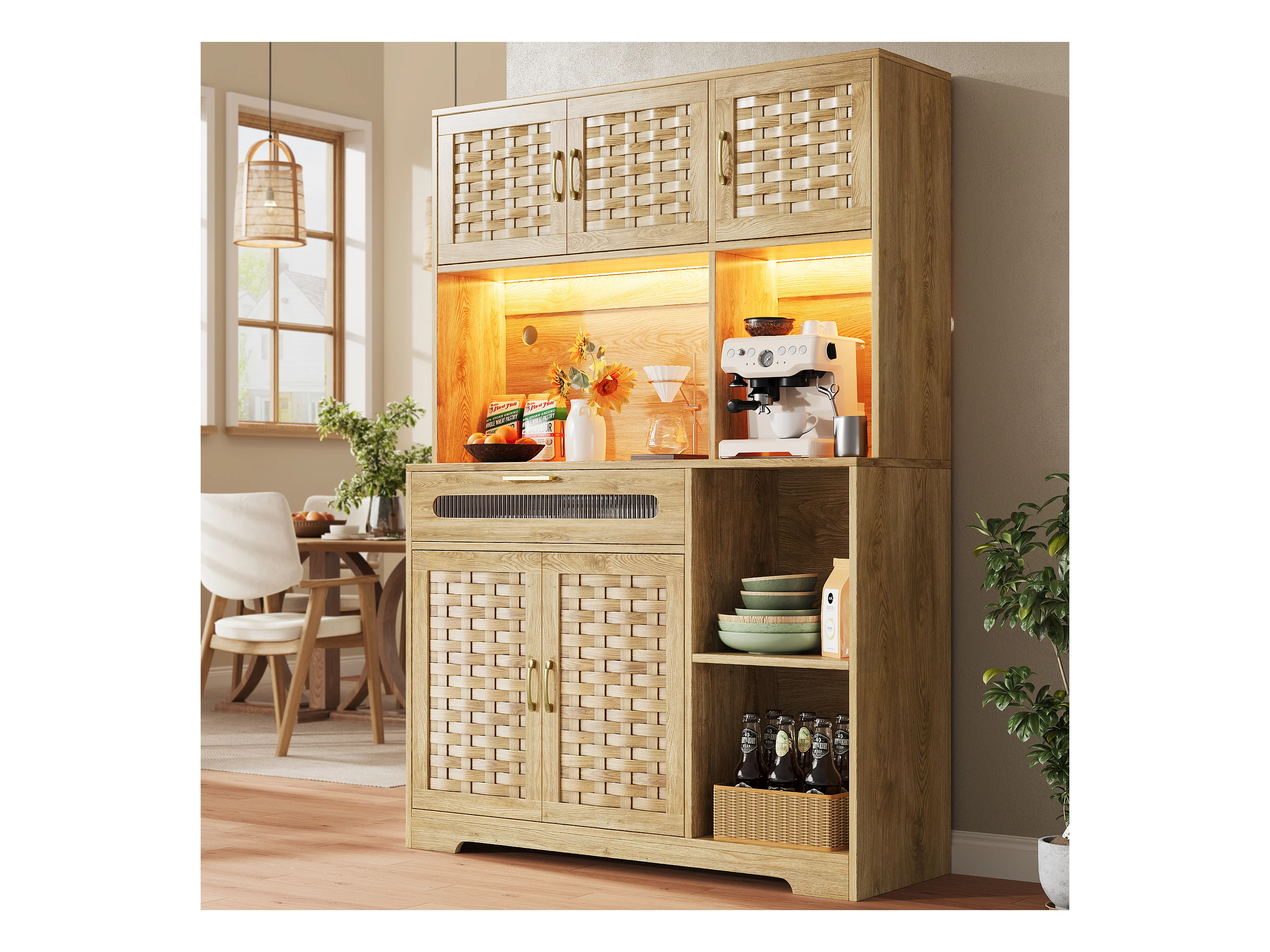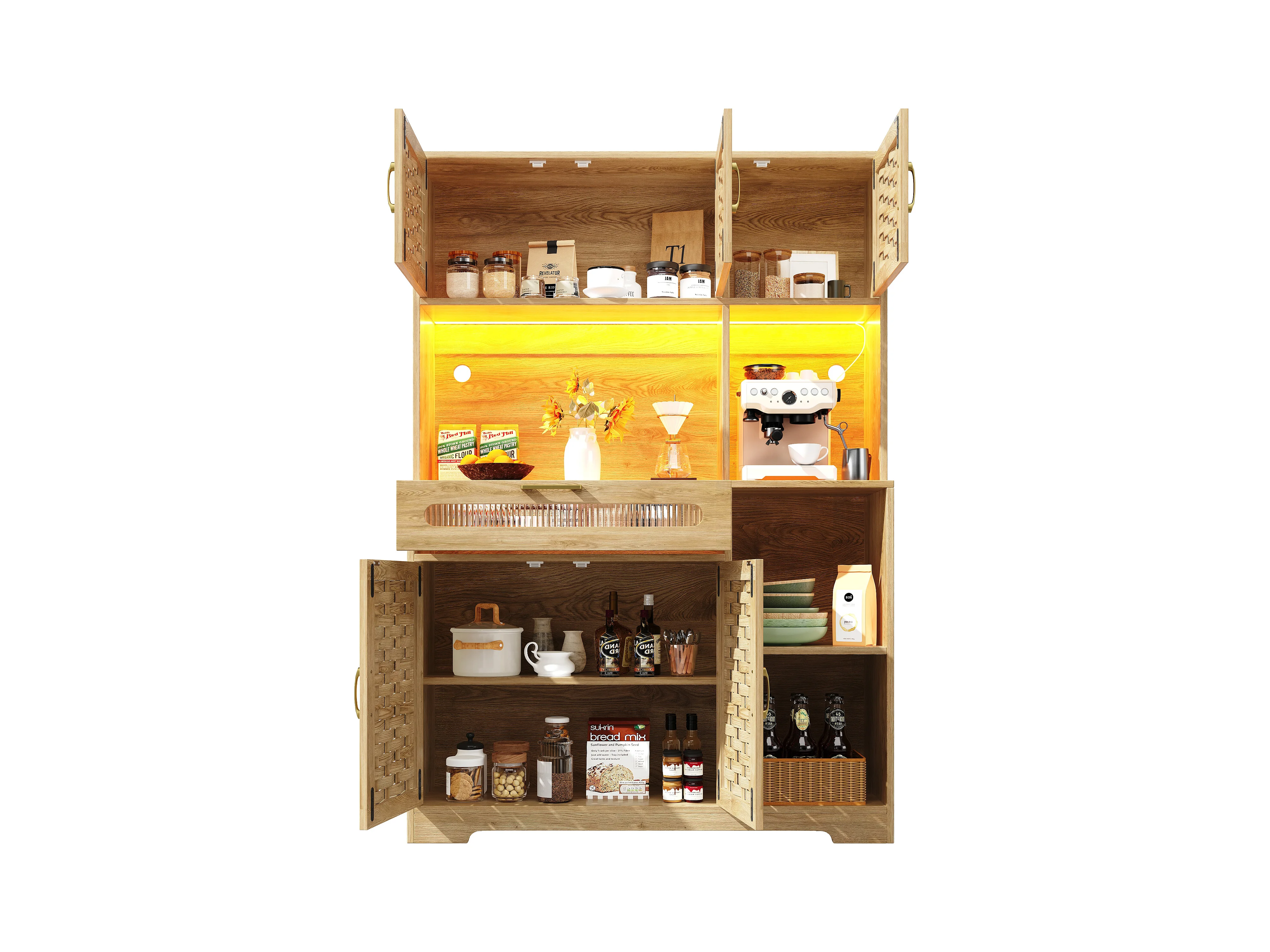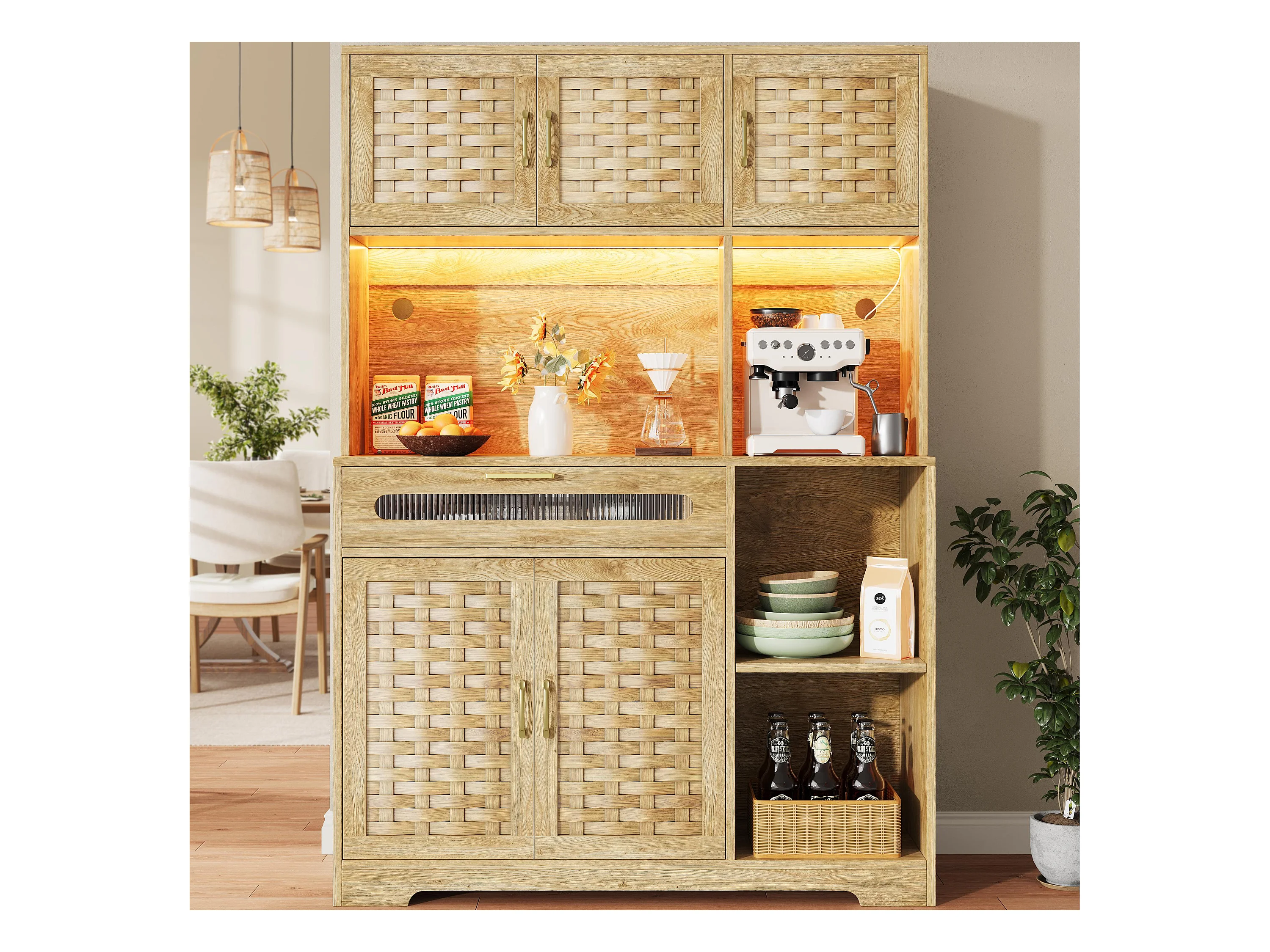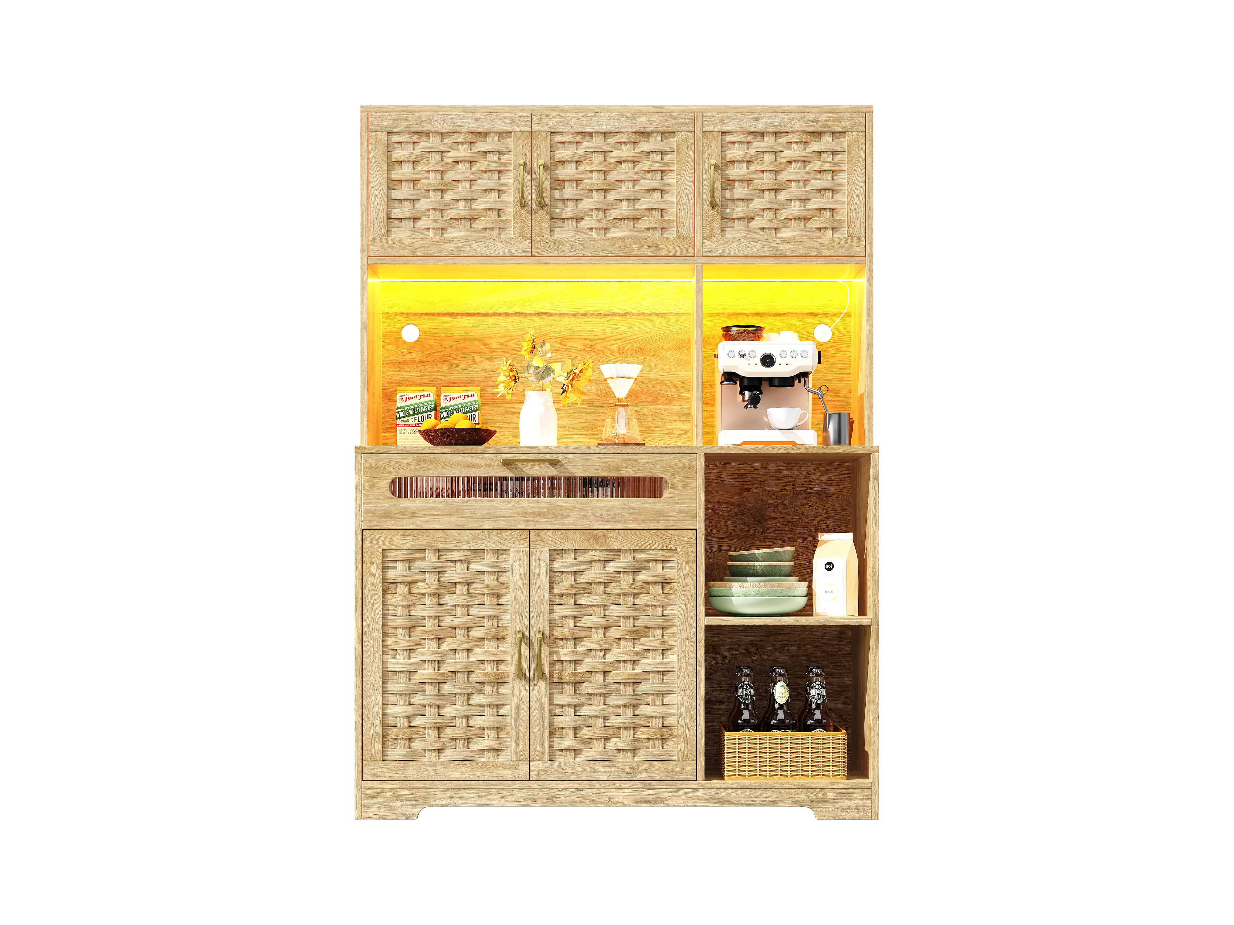 Buffet de cuisine 120x40x180cm - 5 portes + 1 tiroir - LED - meuble haut - buffet polyvalent - Décoration en rotin - Naturel