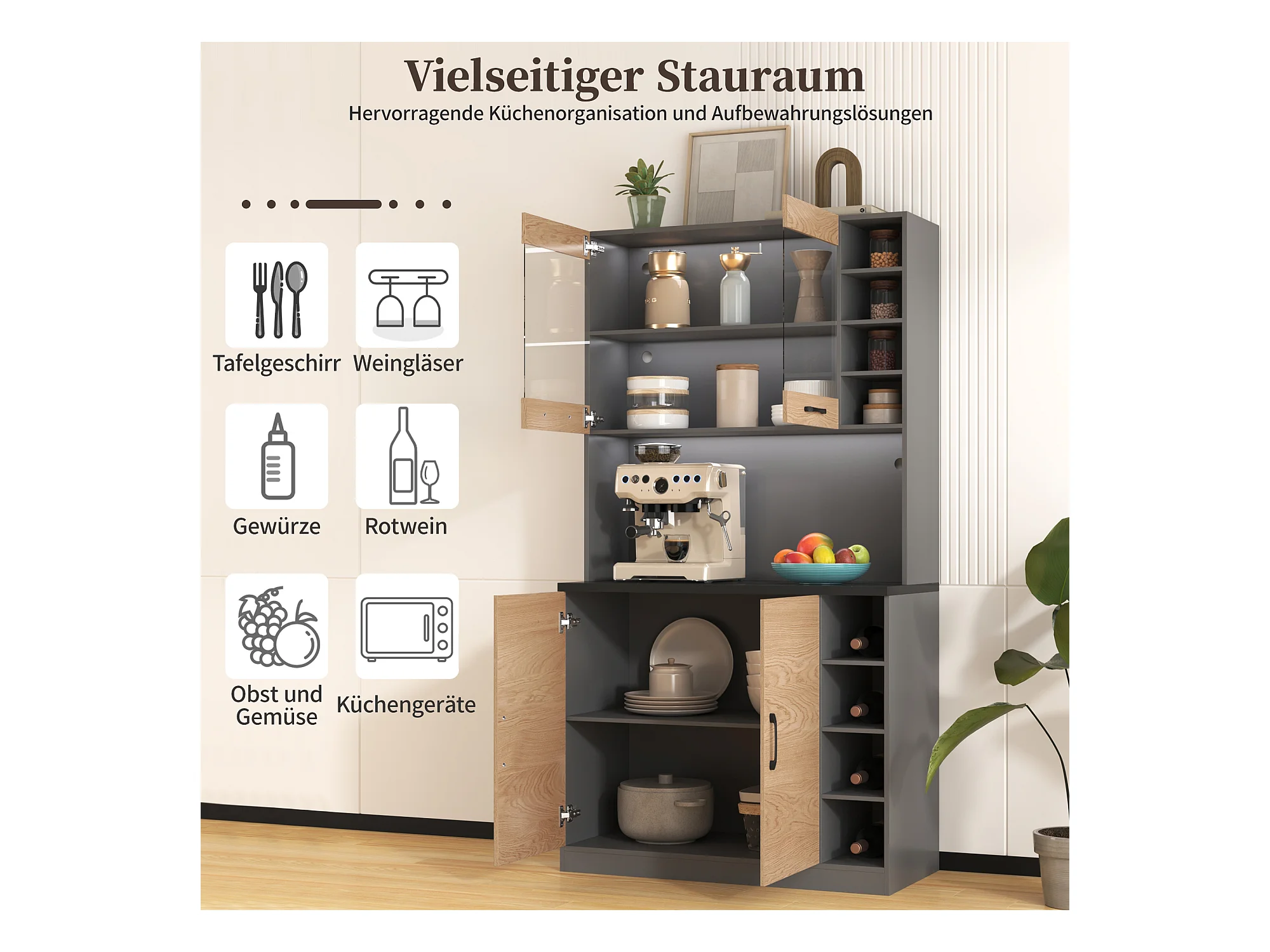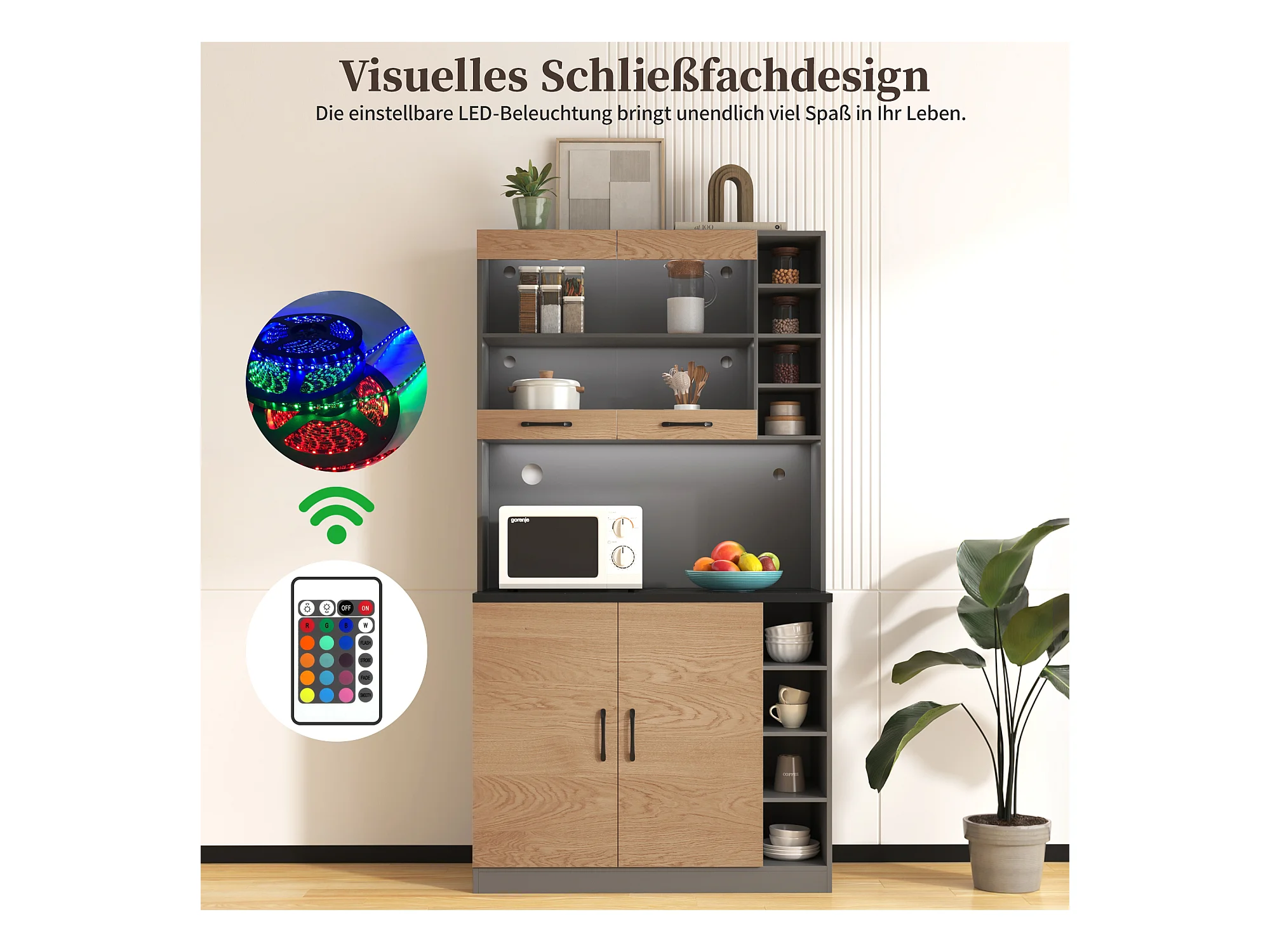 Buffet de cuisine avec 4 portes et compartiments - 100 x 47 x 187 cm - Bois MDF - LEDs et passe-câbles - Naturel + gris