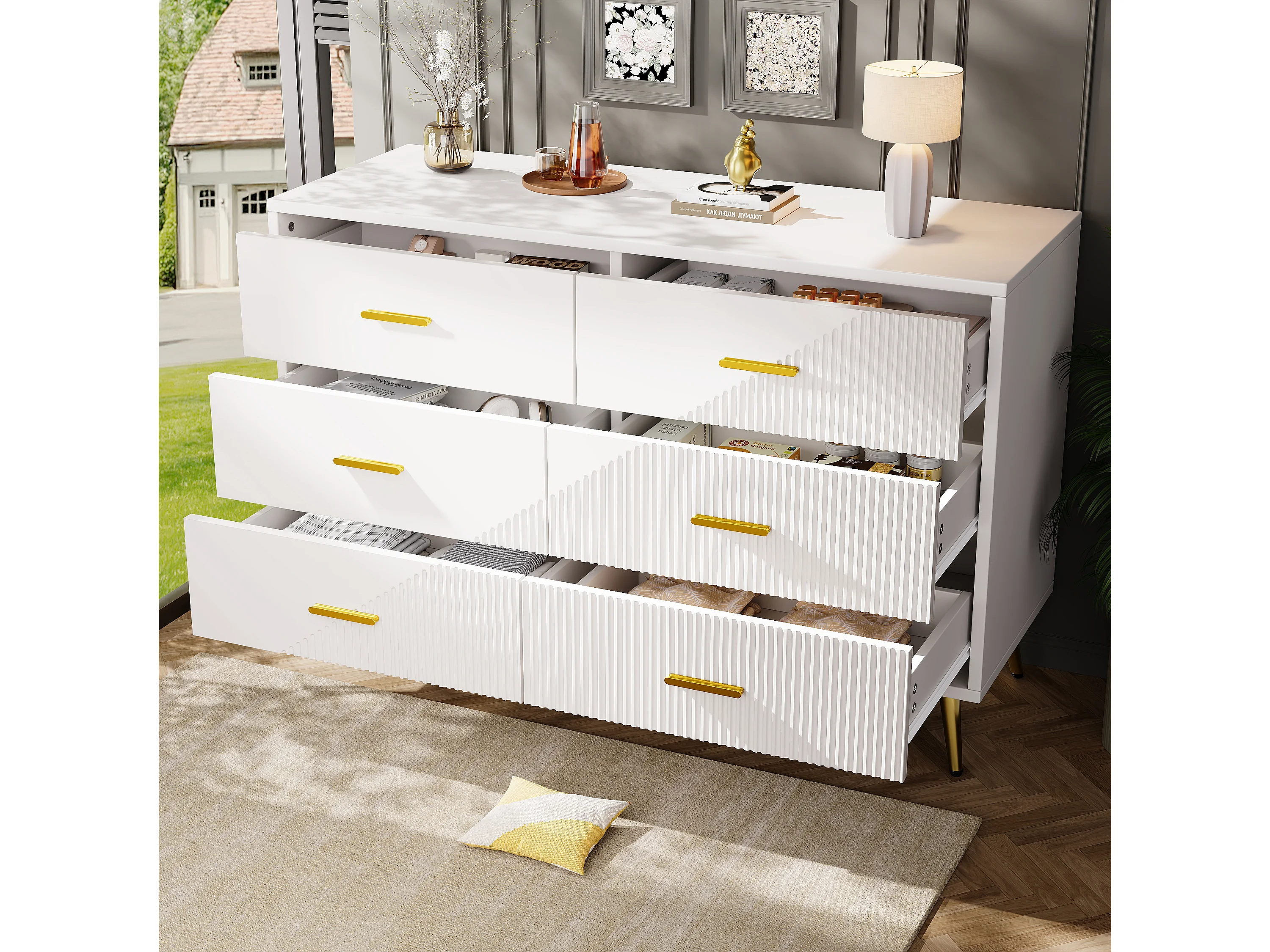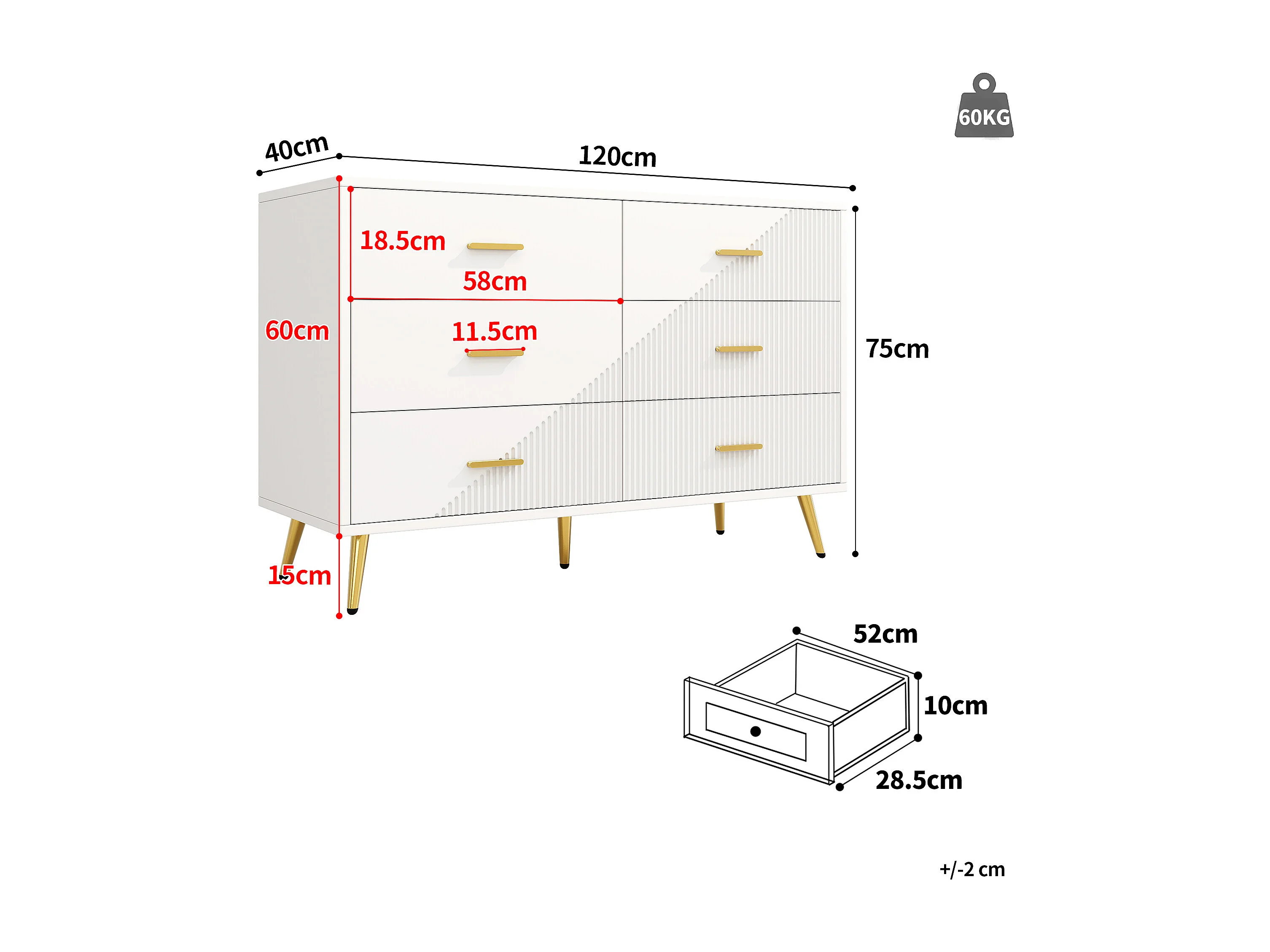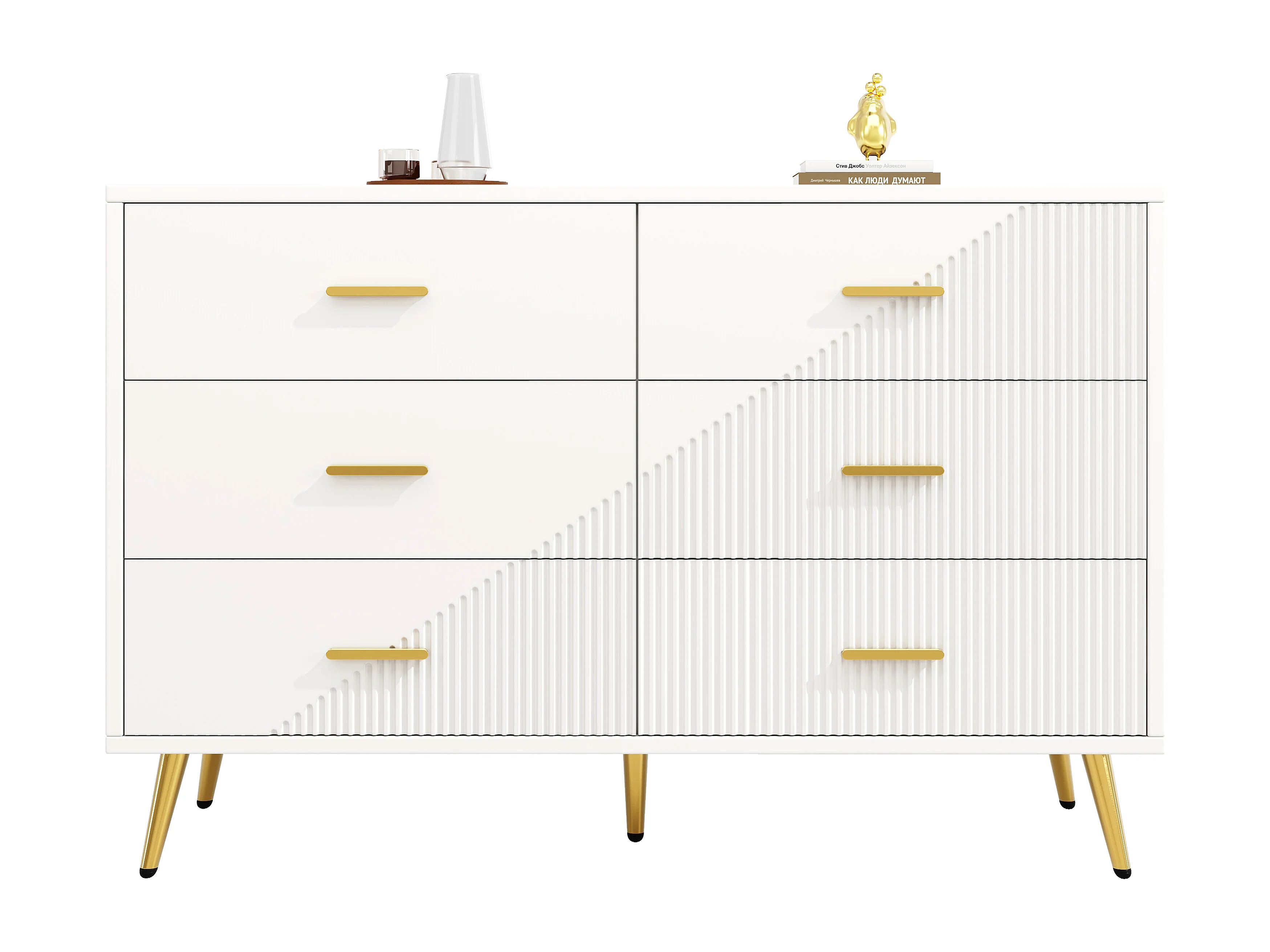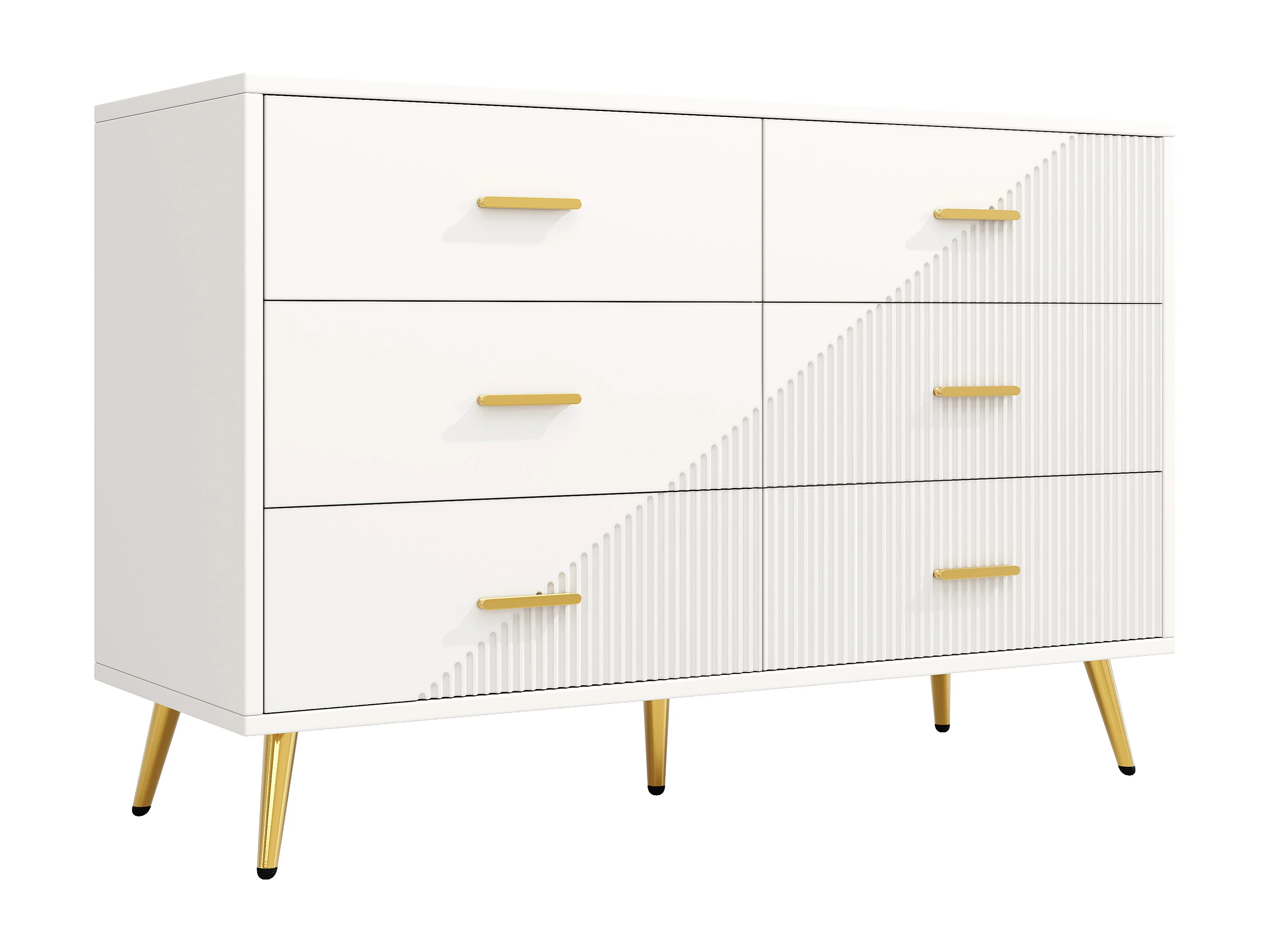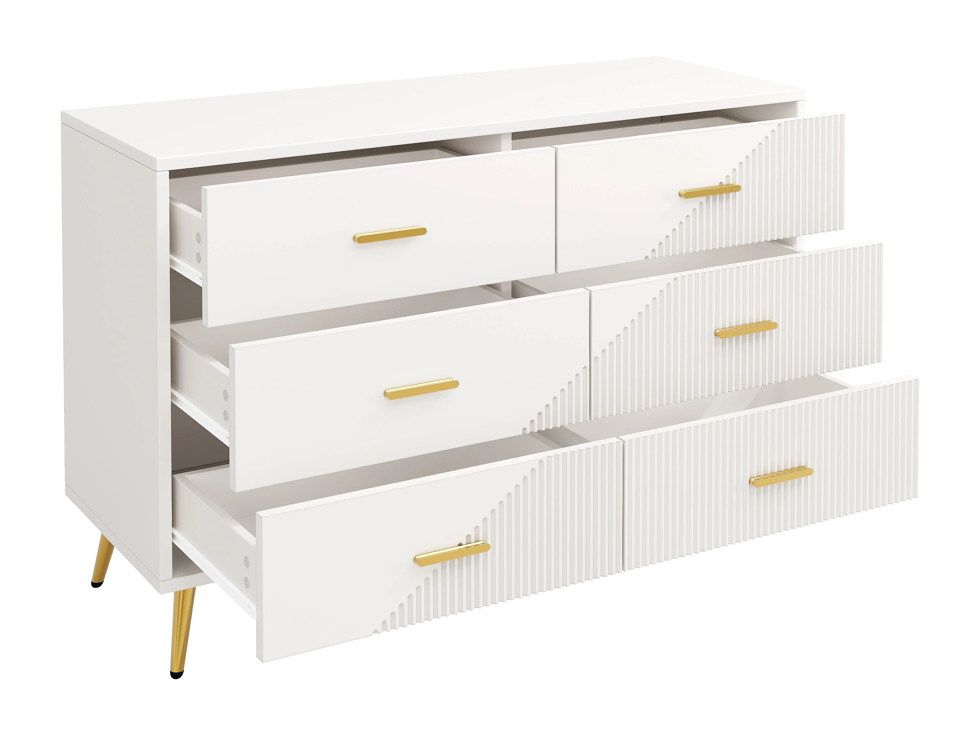 Buffet de cuisine avec 6 tiroirs, corps blanc, poignées et pieds en métal doré - 120x40x75cm
