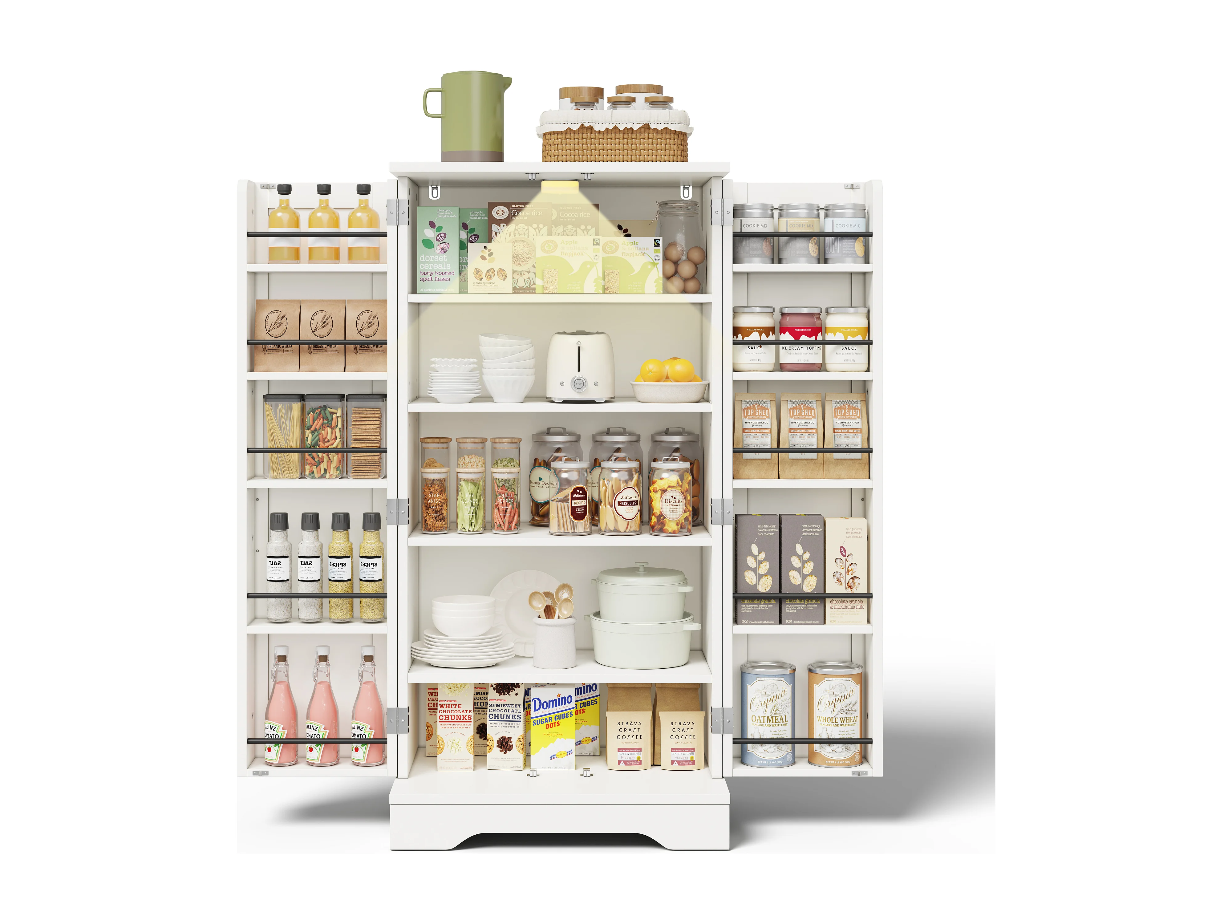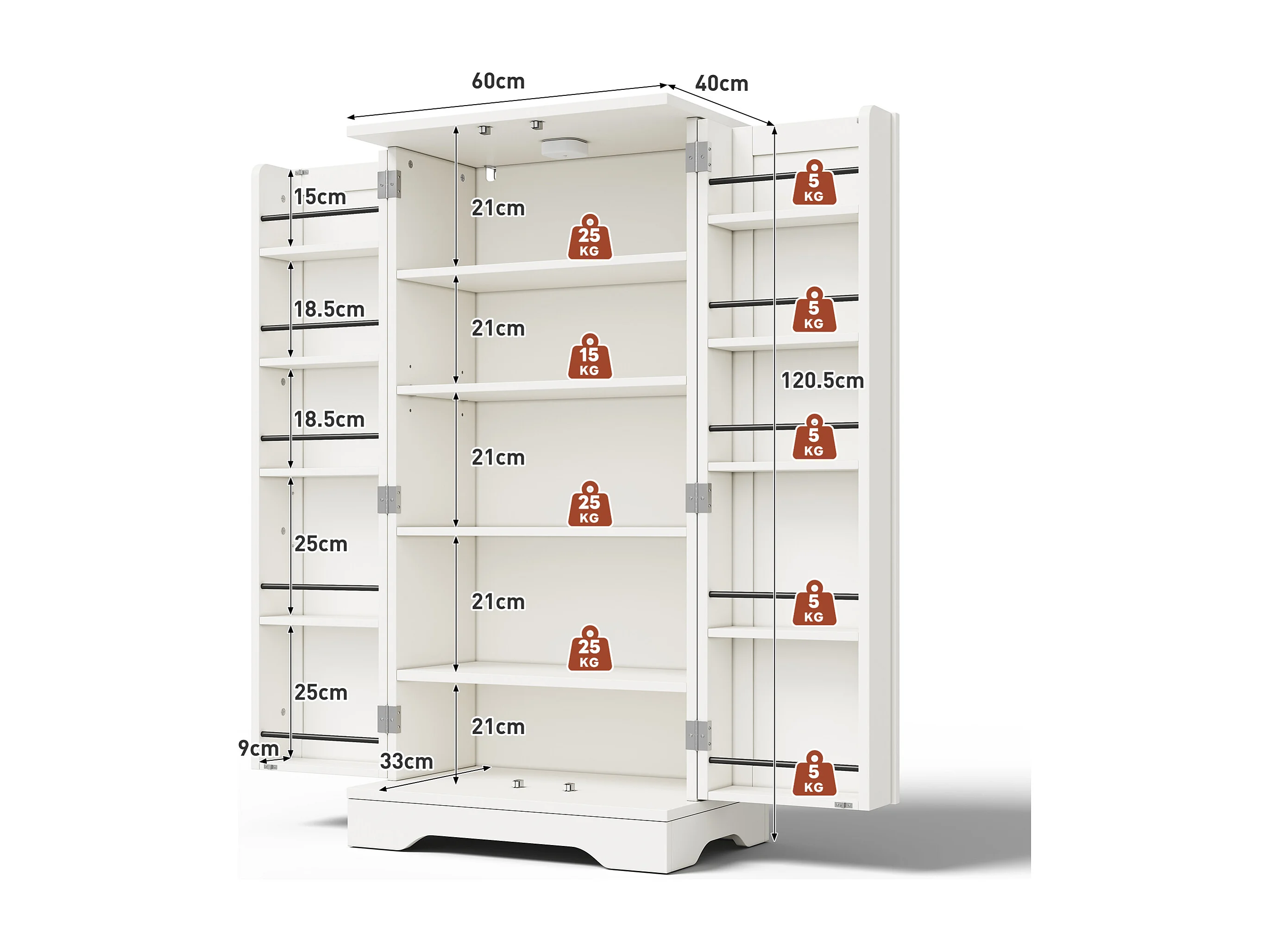 Buffet de cuisine haut - 60 x 40 x 120 cm - avec Leds + 4 portes avec étagères réglables et étagères de porte - MDF - blanc