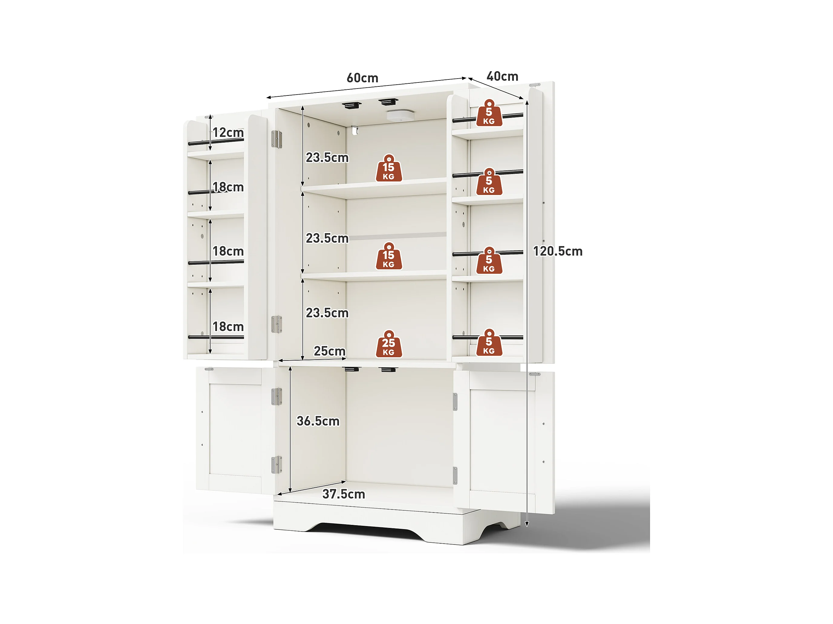 Buffet de cuisine haut - 60 x 40 x 120 cm - avec Leds + 2 portes avec étagères réglables et étagères de porte - MDF - blanc