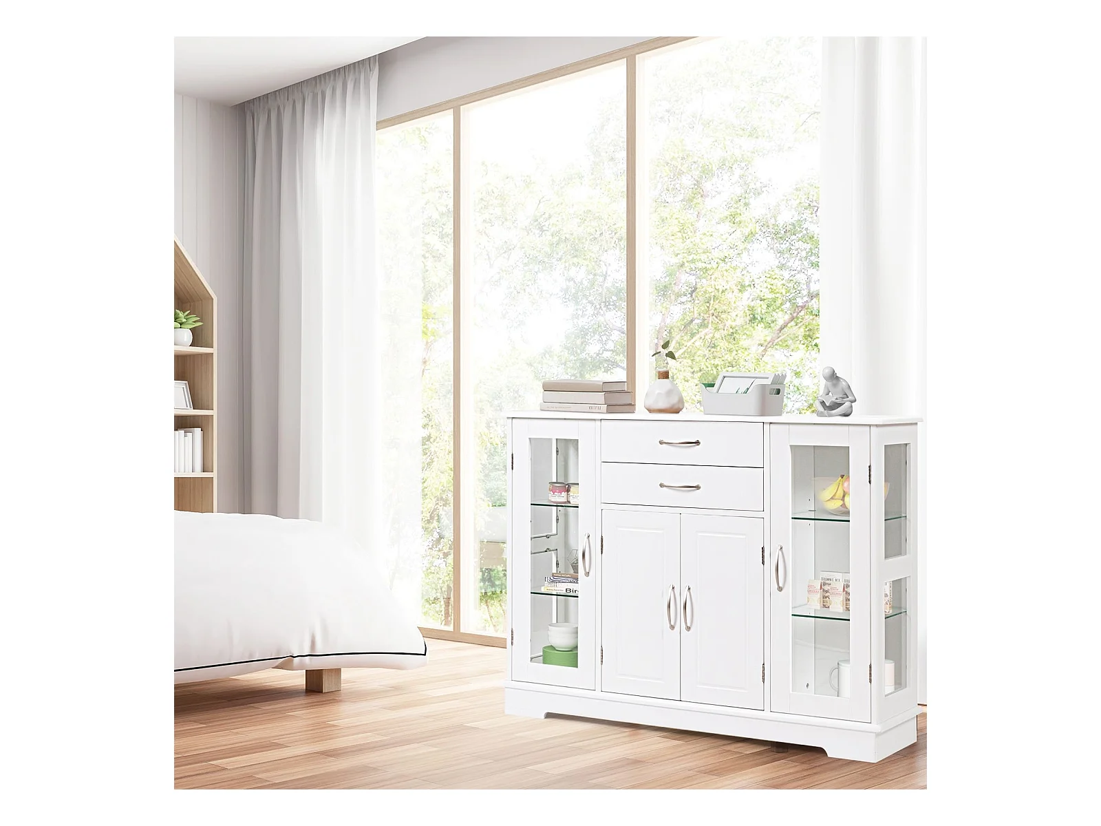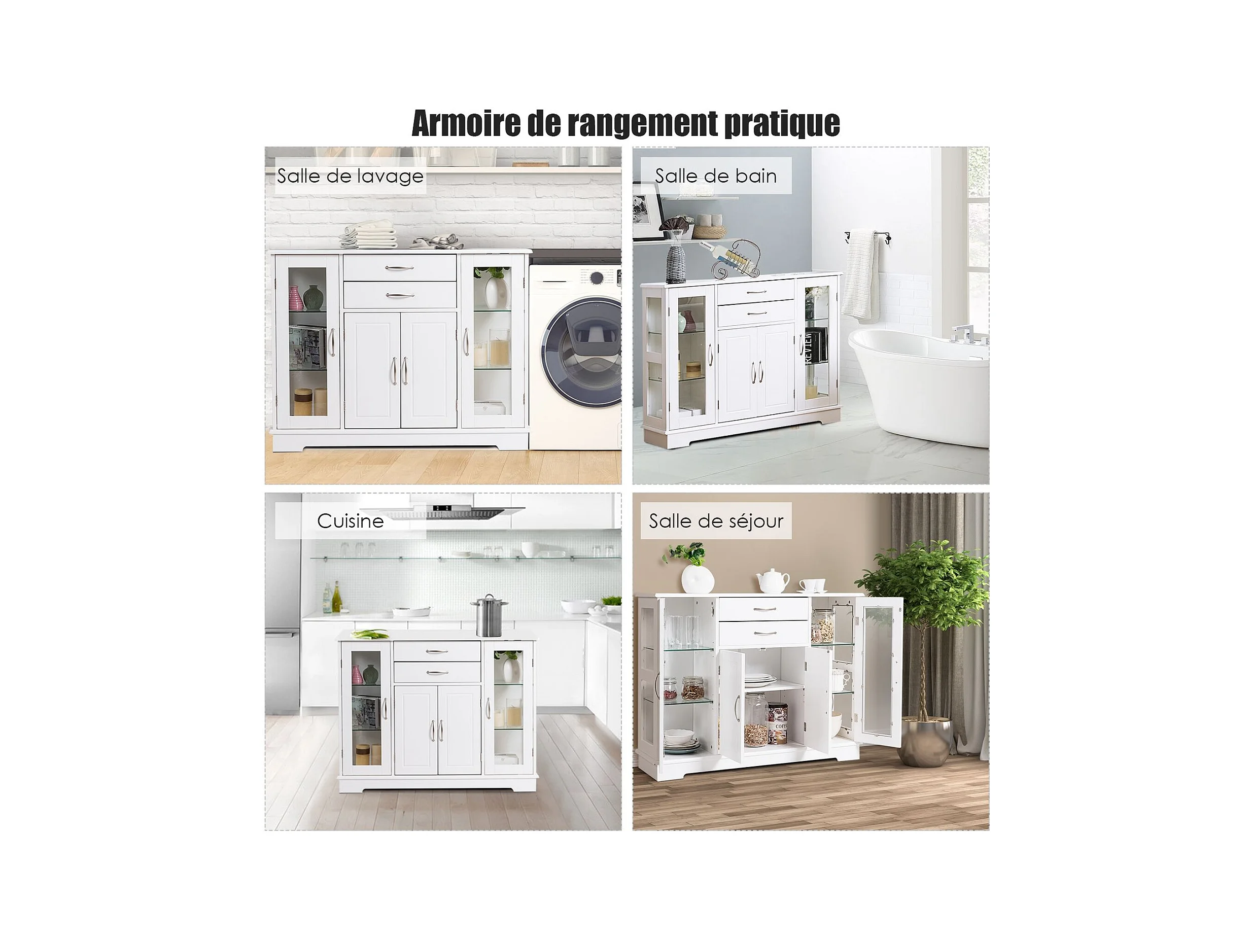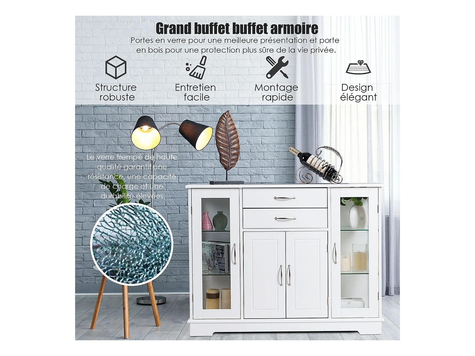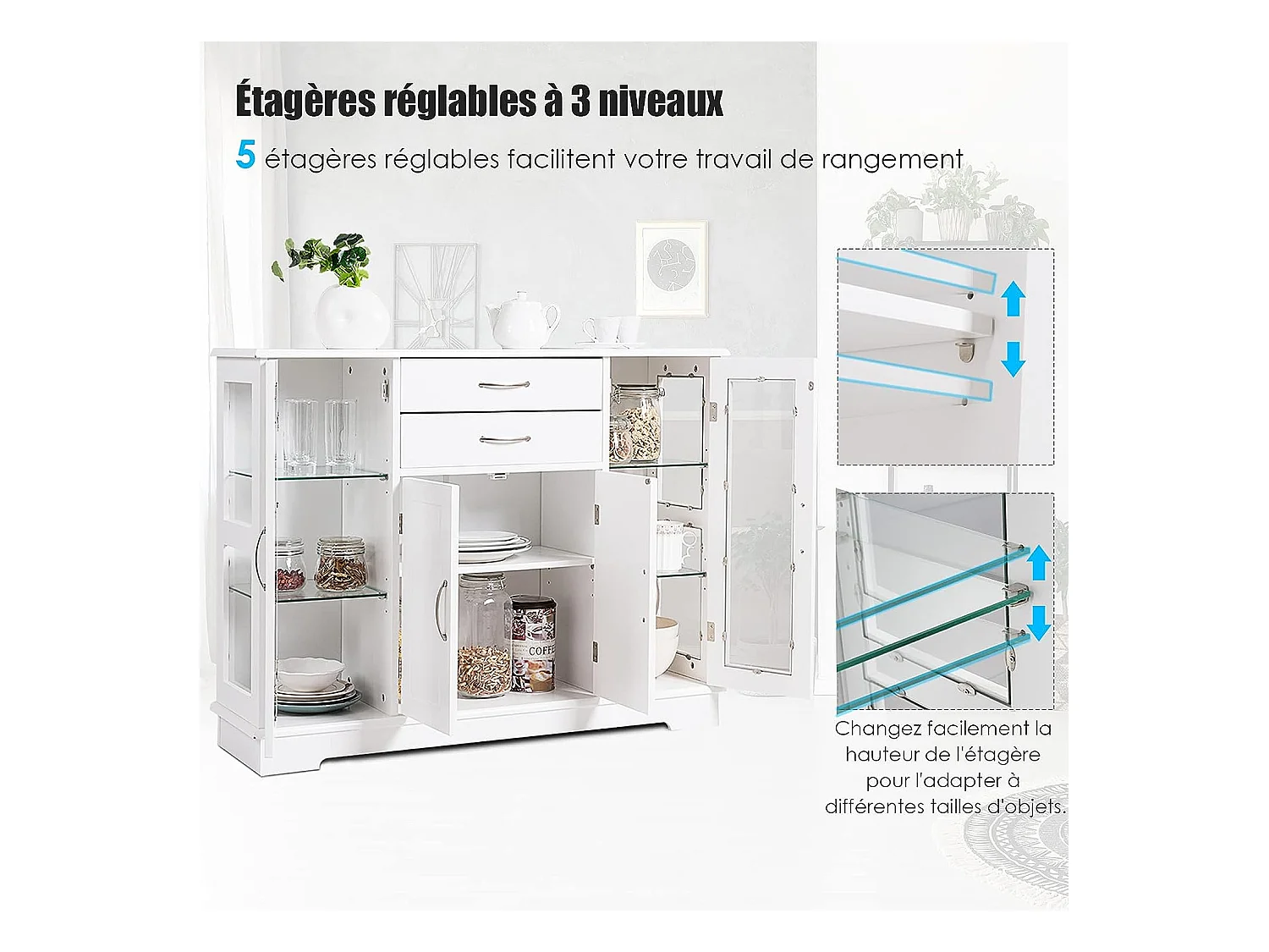 Buffet de Cuisine, Meuble de Rangement avec 2 Tiroirs, 2 Portes Simples en Verre Trempé et 1 Porte à La Française, Armoire pour Cuisine et Salon 107 x 30 x 82 CM (Blanc)