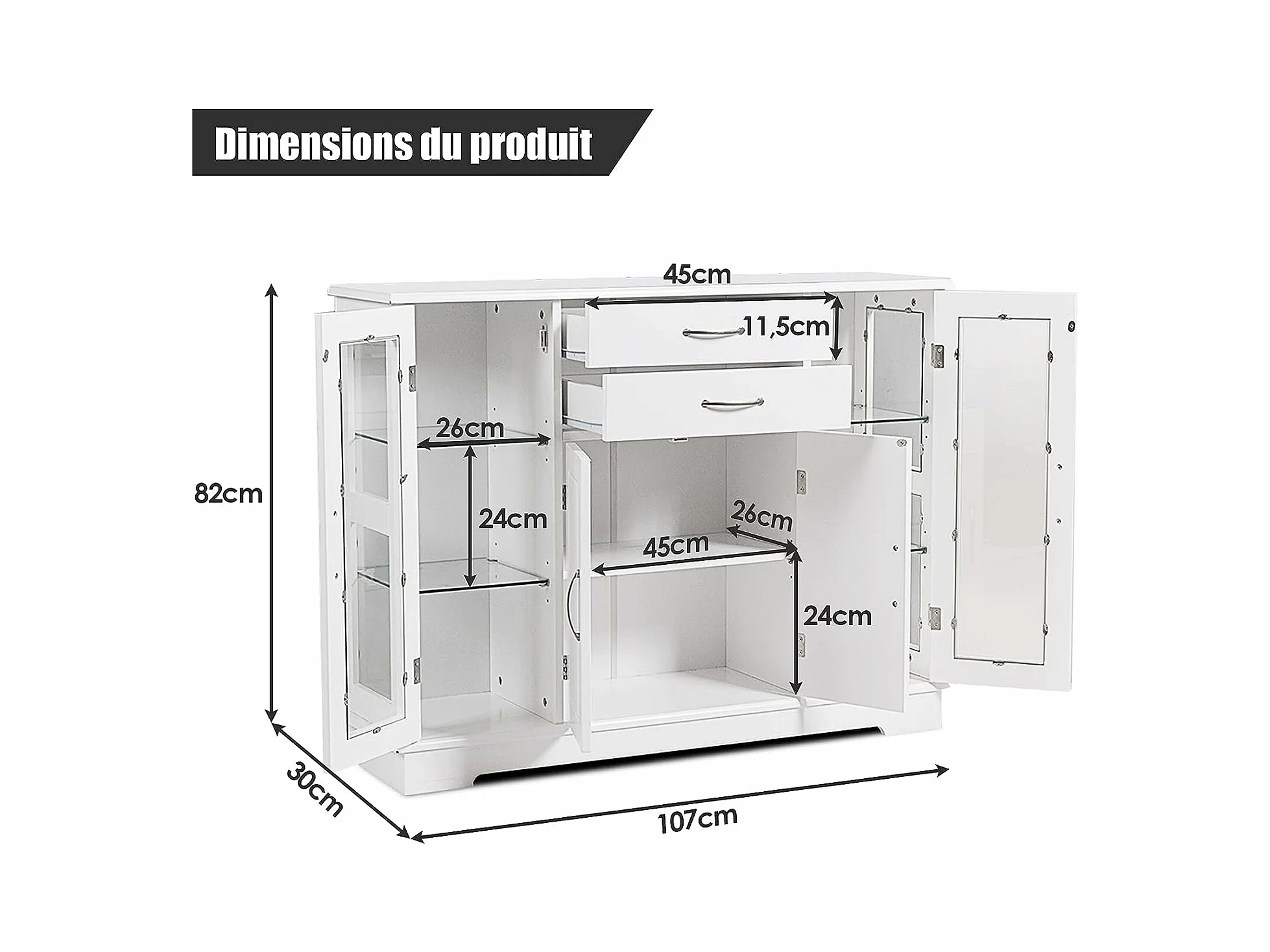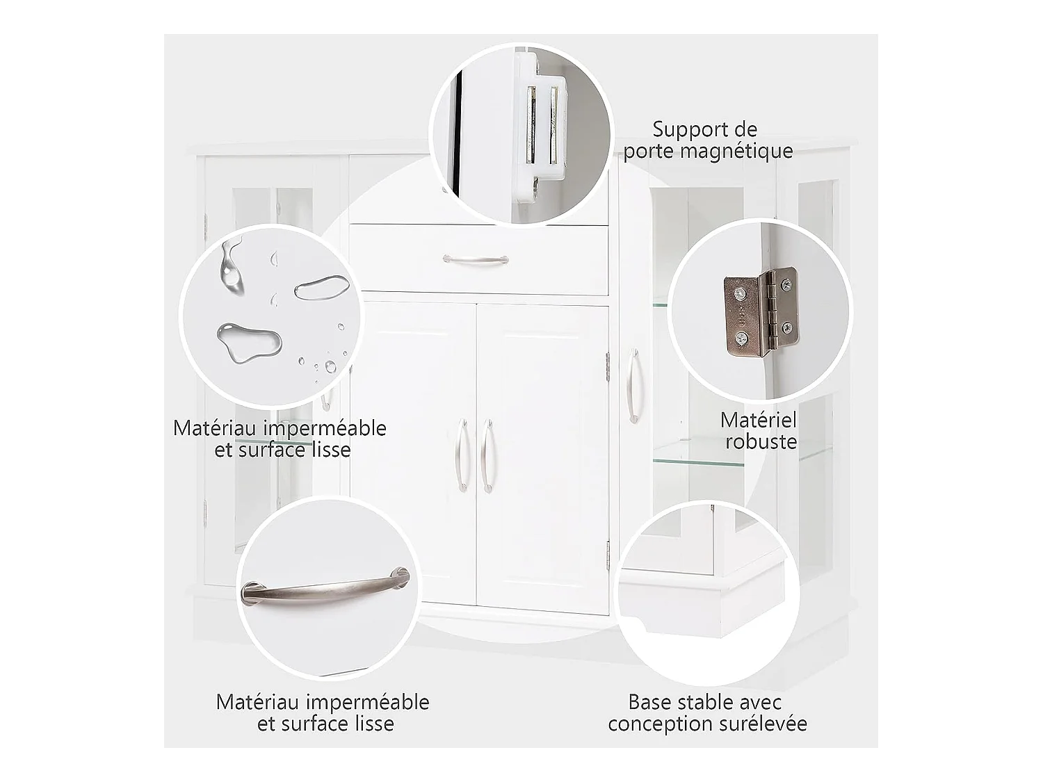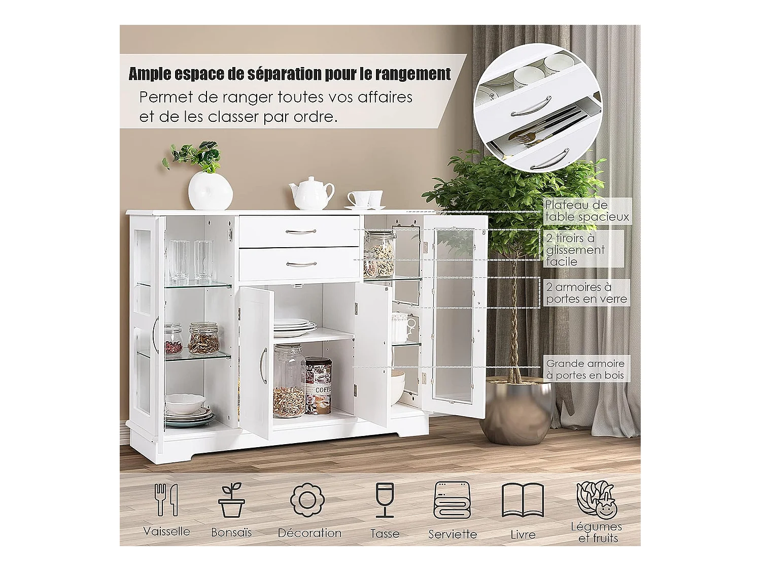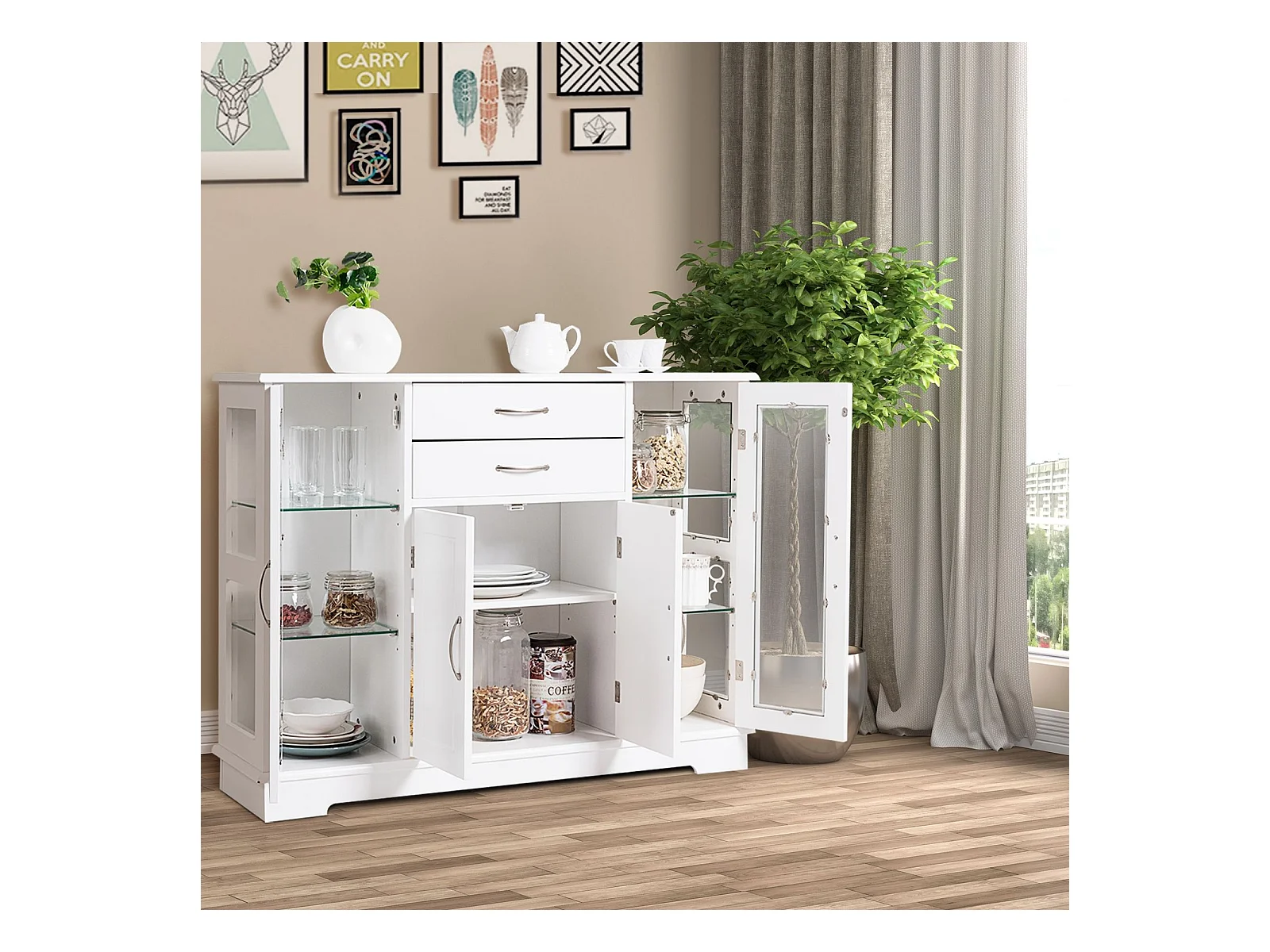 Buffet de Cuisine, Meuble de Rangement avec 2 Tiroirs, 2 Portes Simples en Verre Trempé et 1 Porte à La Française, Armoire pour Cuisine et Salon 107 x 30 x 82 CM (Blanc)