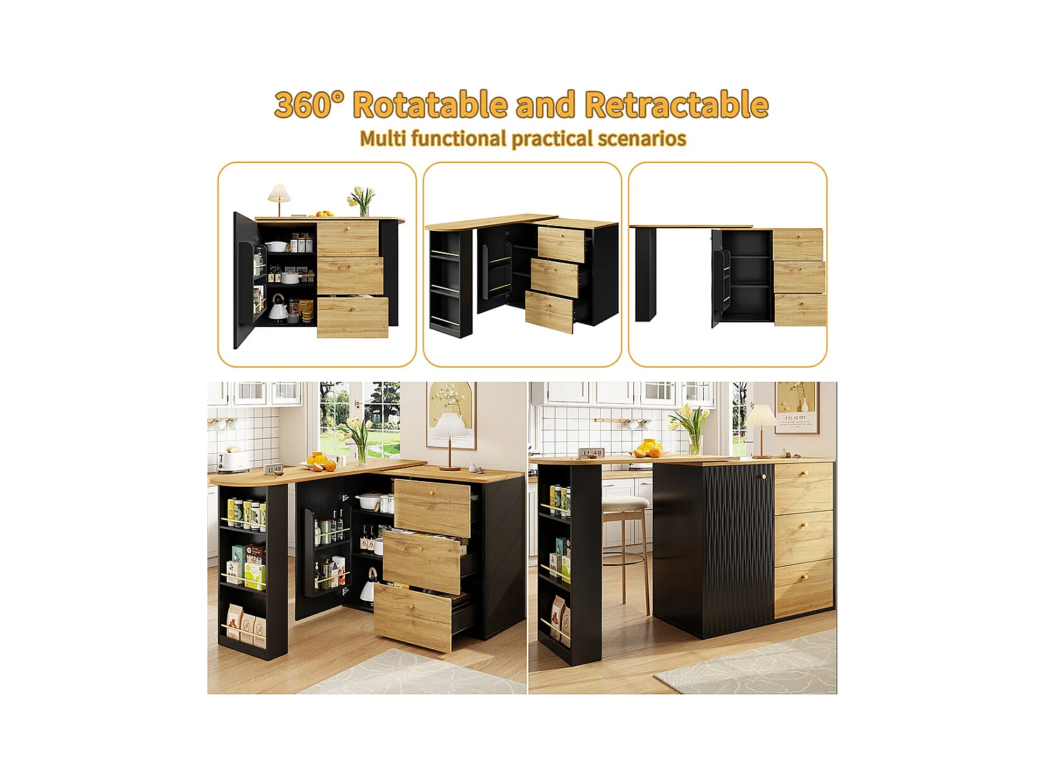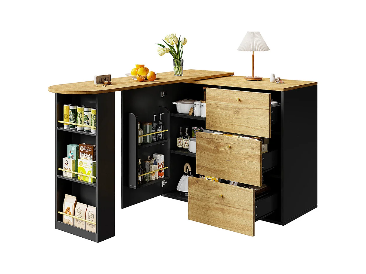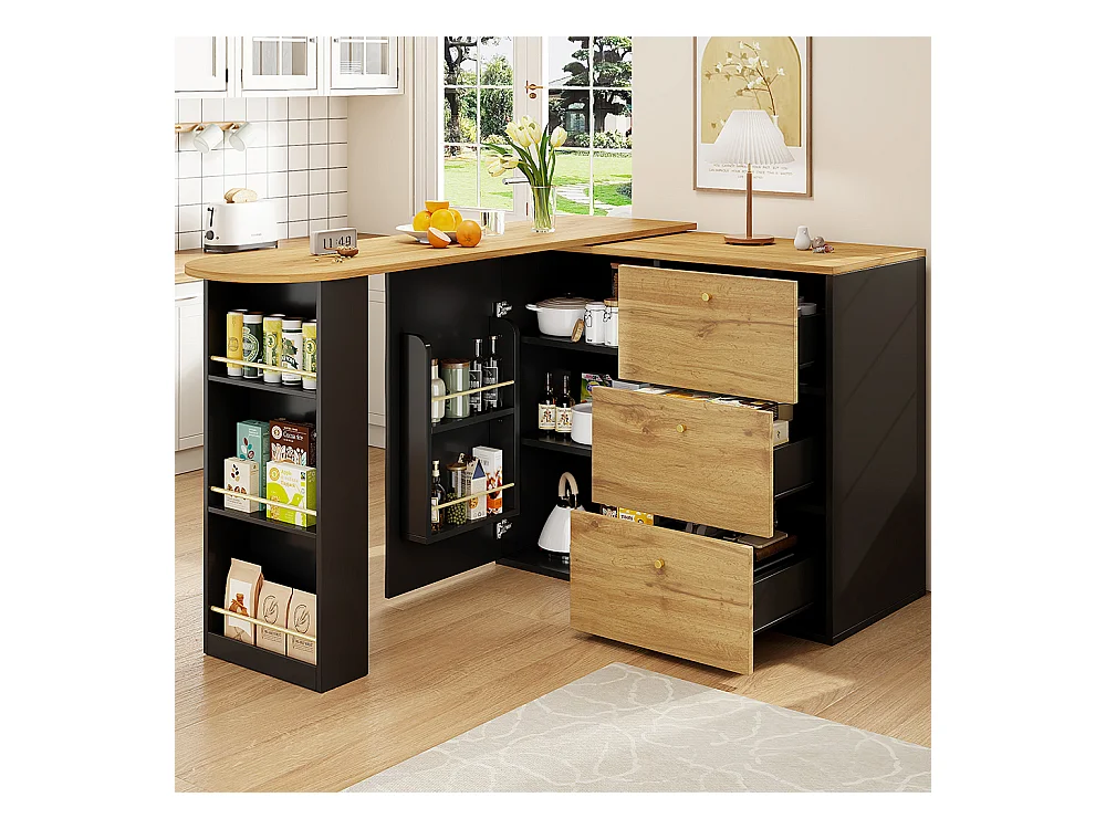 Buffet de cuisine table de bar extensible espace rangement plateau pivotant 360° moderne mobile table haute cuisine table bistrot grain de bois noir