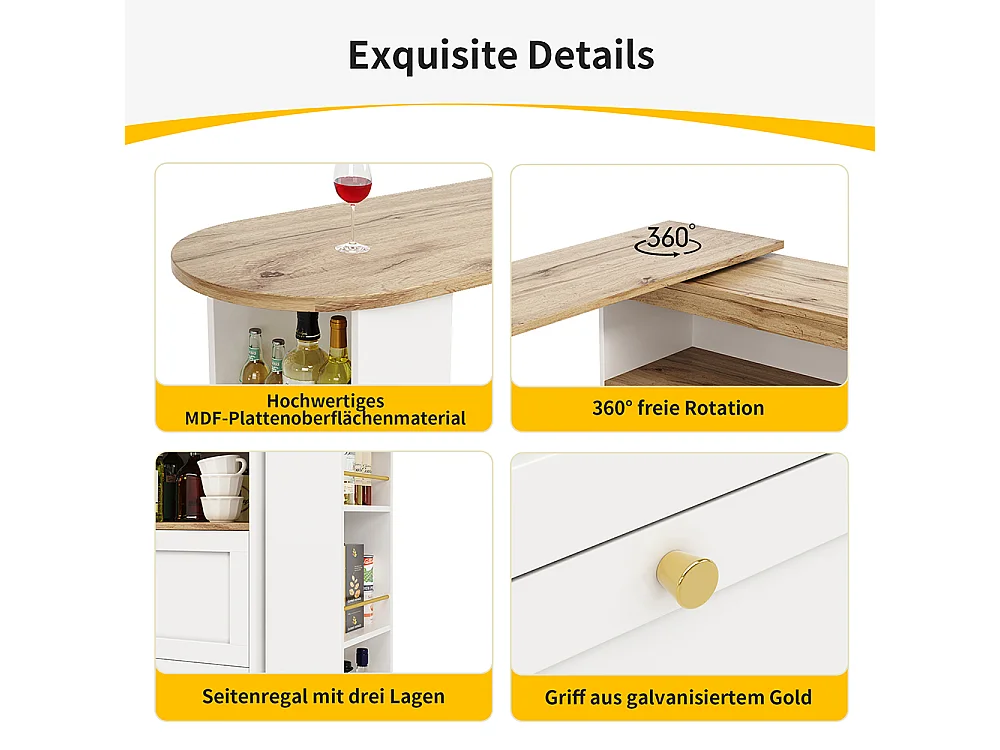 Buffet de cuisine table haute blanche pivotante à 360° avec 4 tiroirs et étagères ouvertes adaptée à la salle à manger bureau ou salon