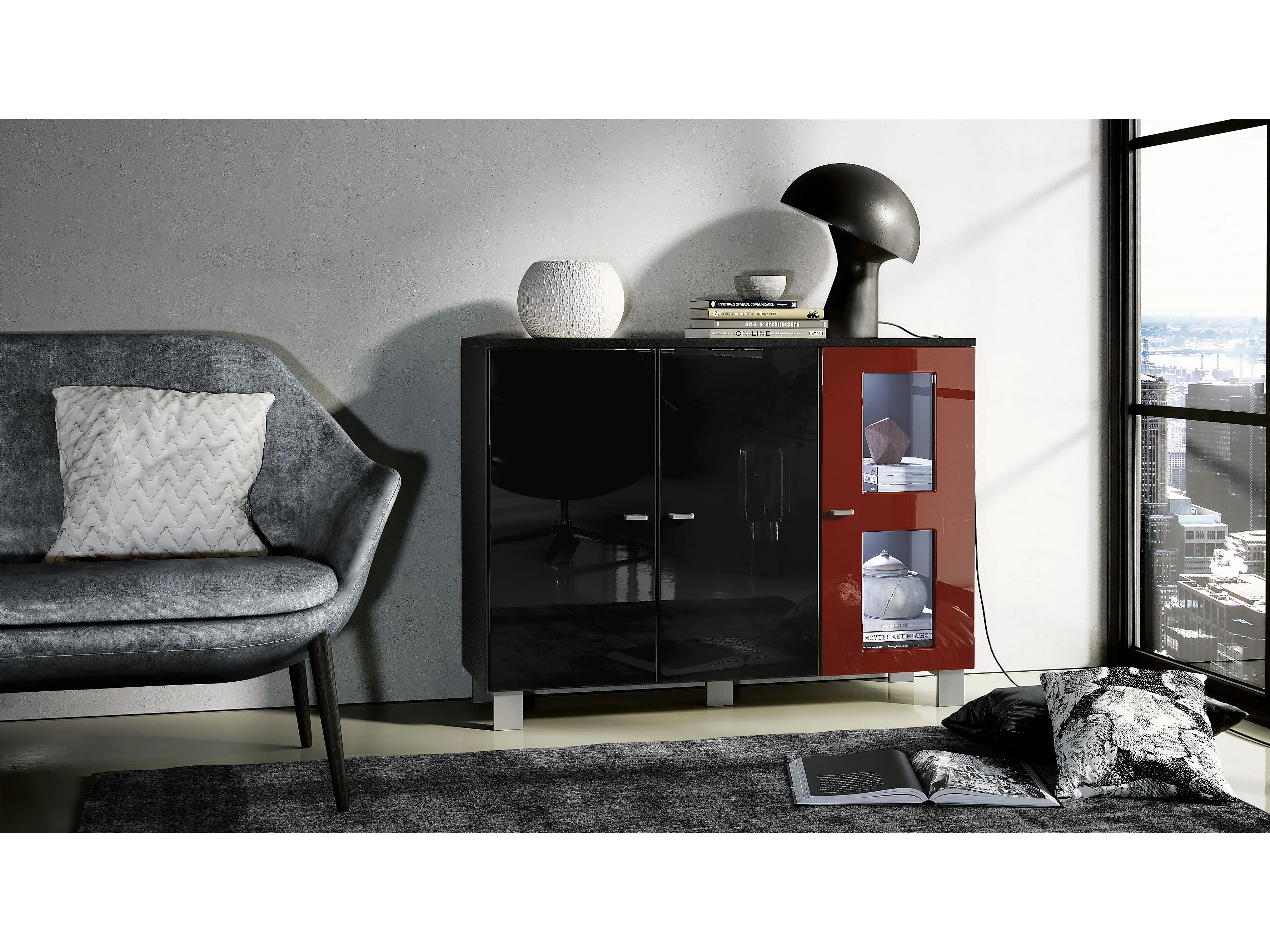 Buffet Denjo, Commode avec 3 portes, Noir mat/Noir haute brillance/Bordeaux haute brillance, éclairage LED inclus (107 x 81 x 35 cm)