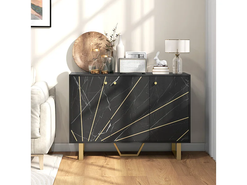 Buffet design - 3 portes, 2 étagères - métal doré aspect marbre noir