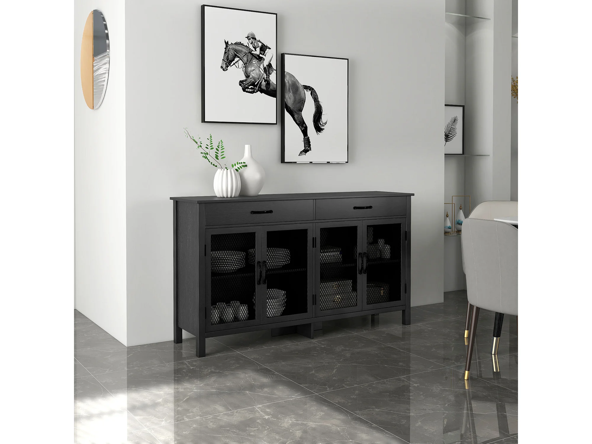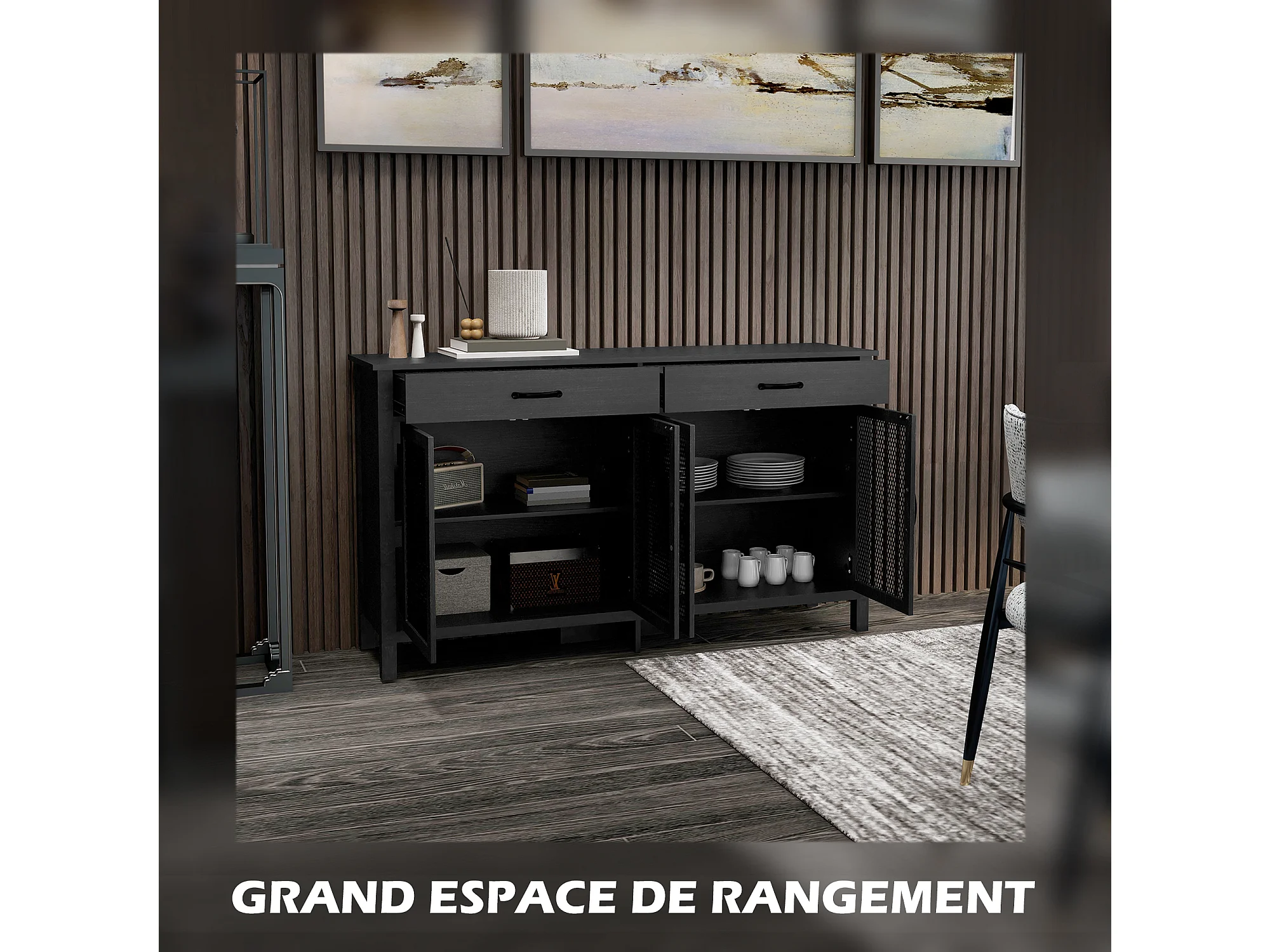 Buffet design industriel - 4 portes, 2 étagères réglables, 2 tiroirs - panneaux façades grillagées poignées métal noir