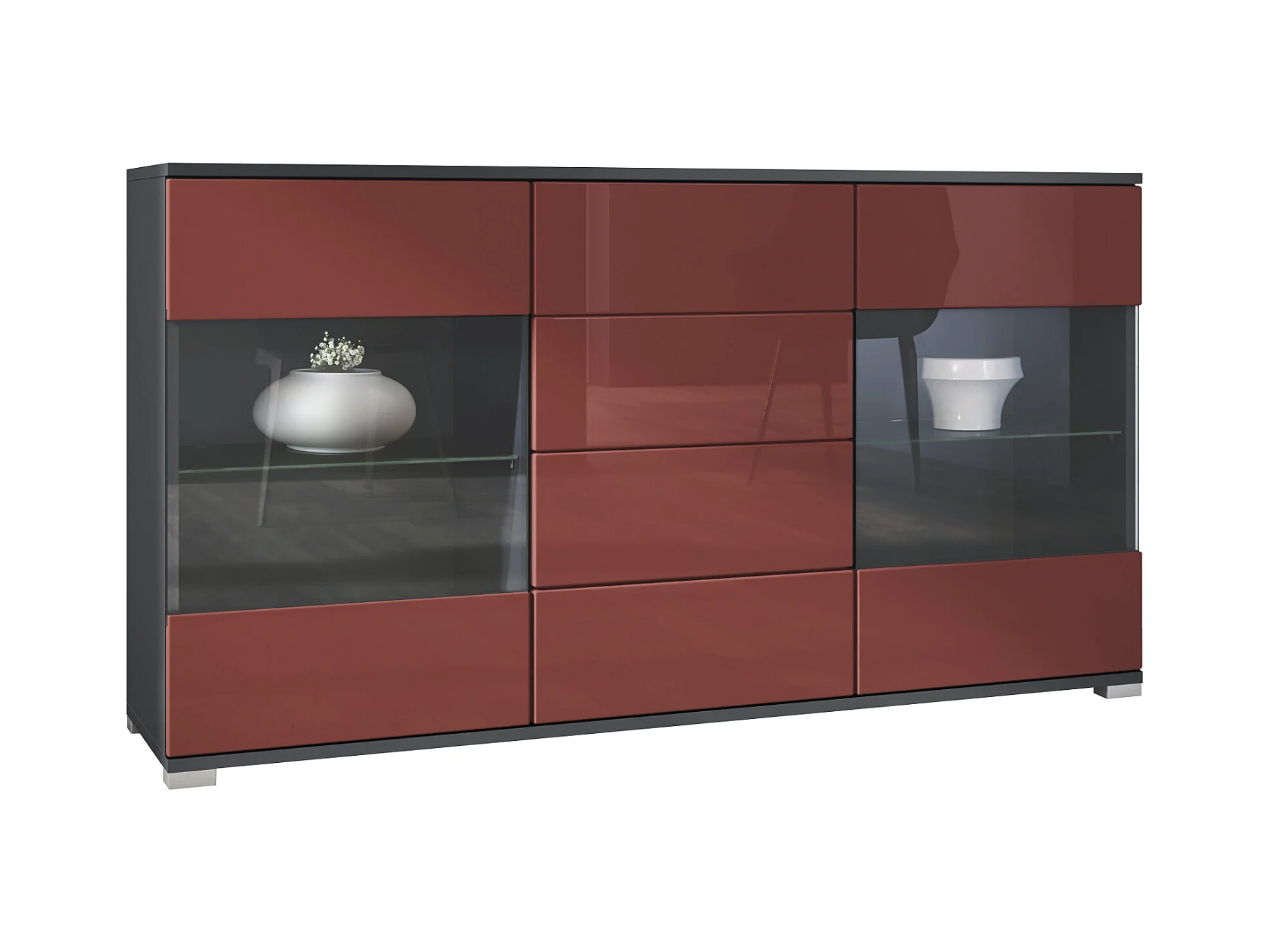 Buffet Bari V1 – Meuble avec 2 Grandes Portes et 4 Tiroirs, anthracite mat/bordeaux haute brillance (138,5 x 75,5 x 35)
