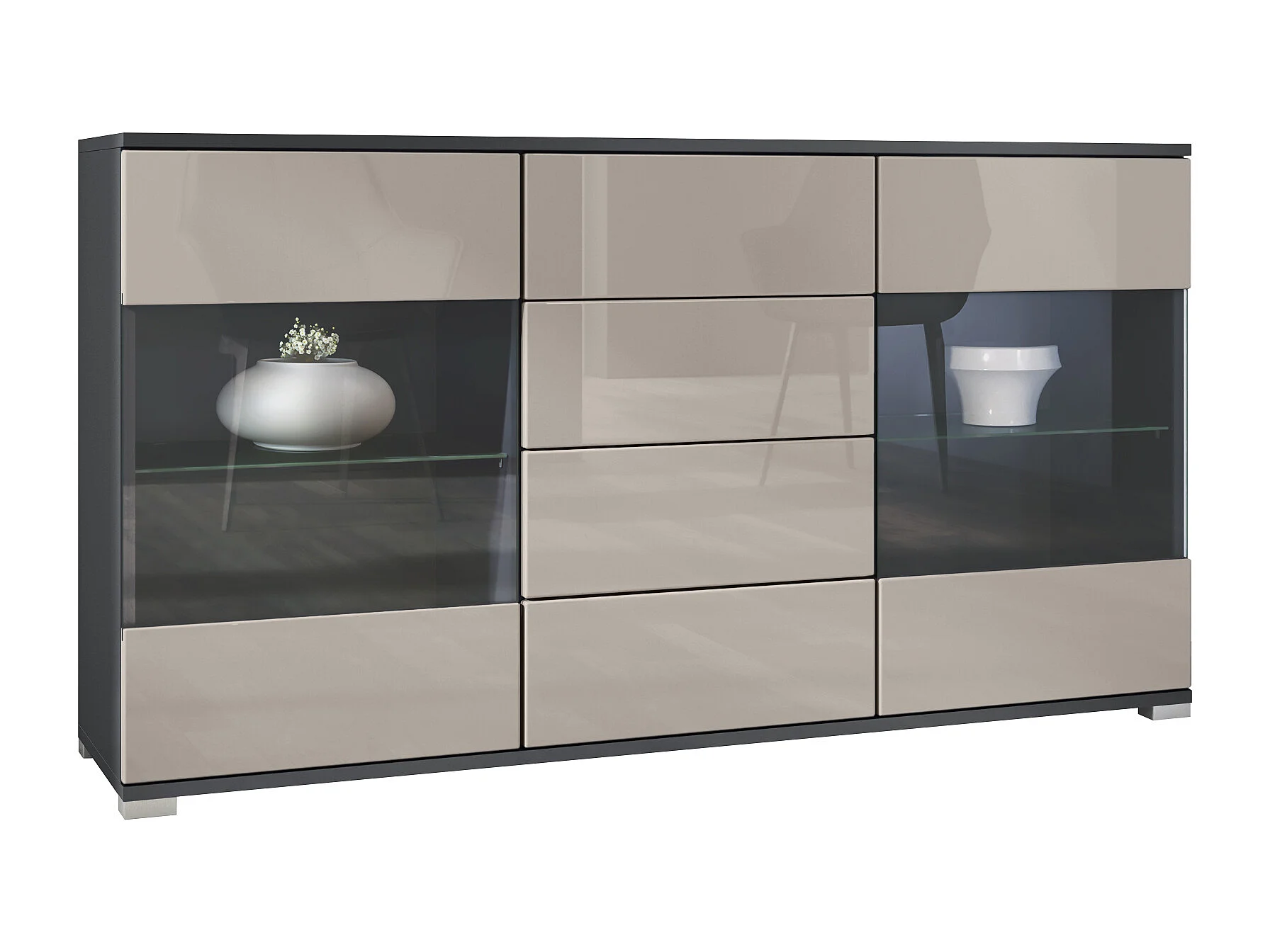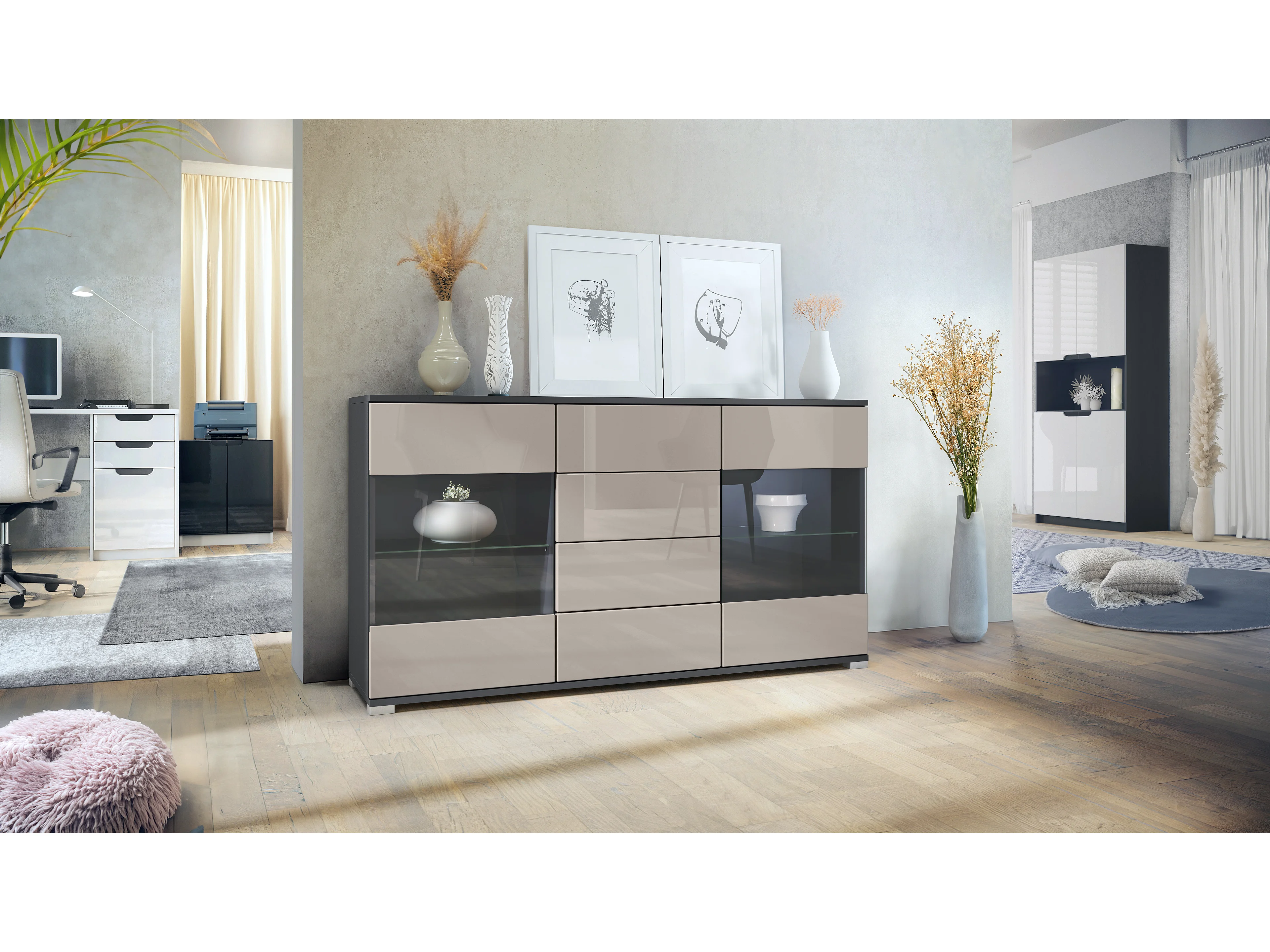 Buffet Bari V1 – Meuble avec 2 Grandes Portes et 4 Tiroirs, anthracite mat/gris sable haute brillance (138,5 x 75,5 x 35)