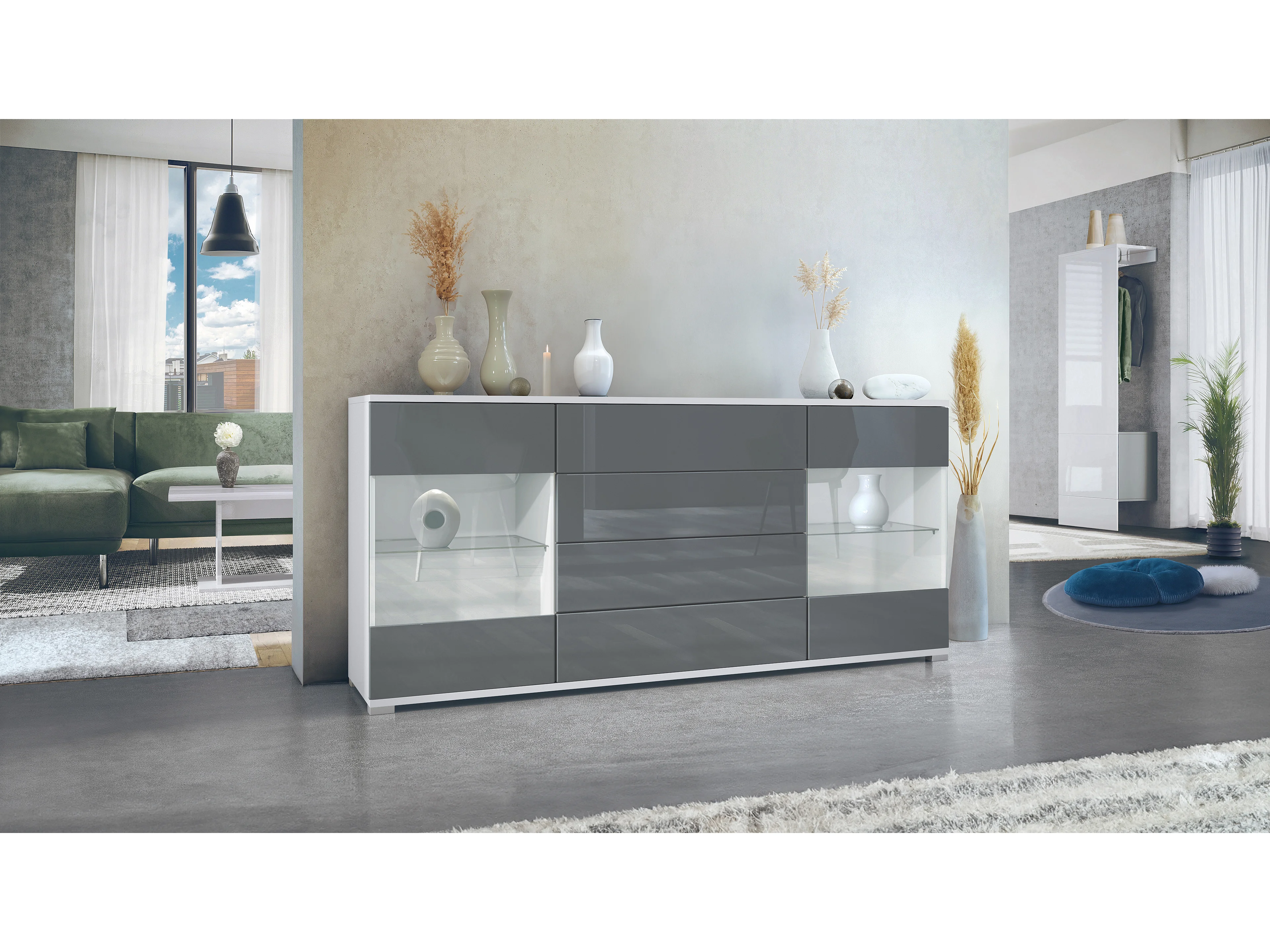 Buffet Bari V2 – Meuble avec 2 Grandes Portes et 4 Tiroirs, blanc mat/gris haute brillance (166,5 x 75,5 x 35)