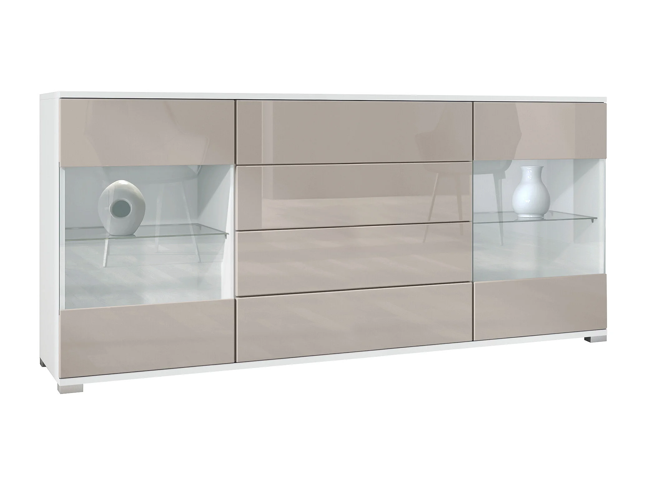 Buffet Bari V2 – Meuble avec 2 Grandes Portes et 4 Tiroirs, blanc mat/gris sable haute brillance (166,5 x 75,5 x 35)